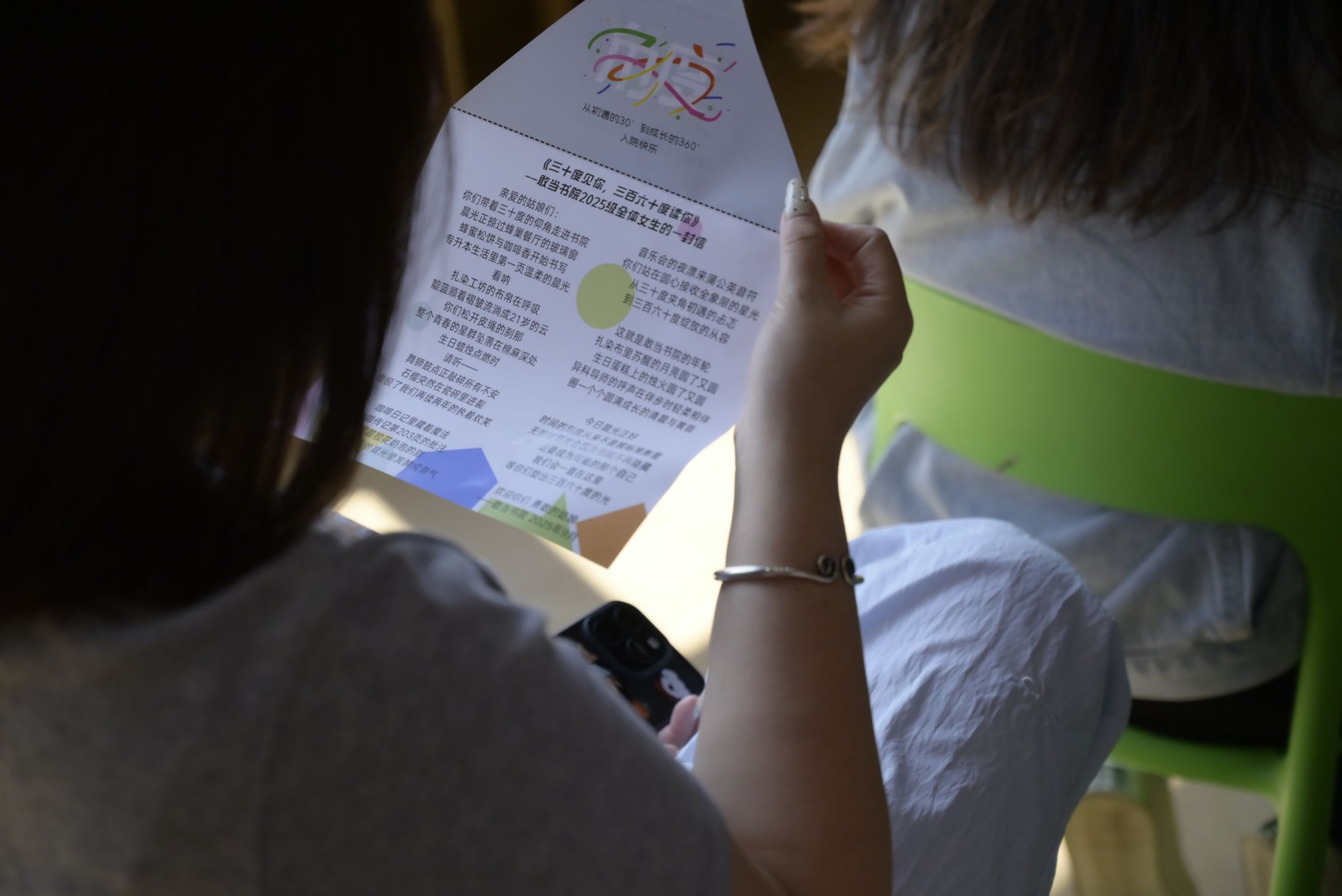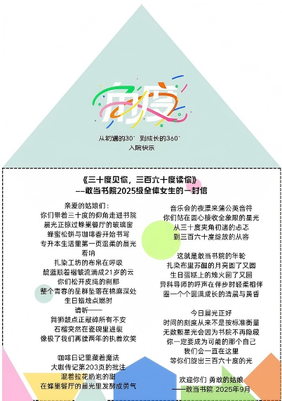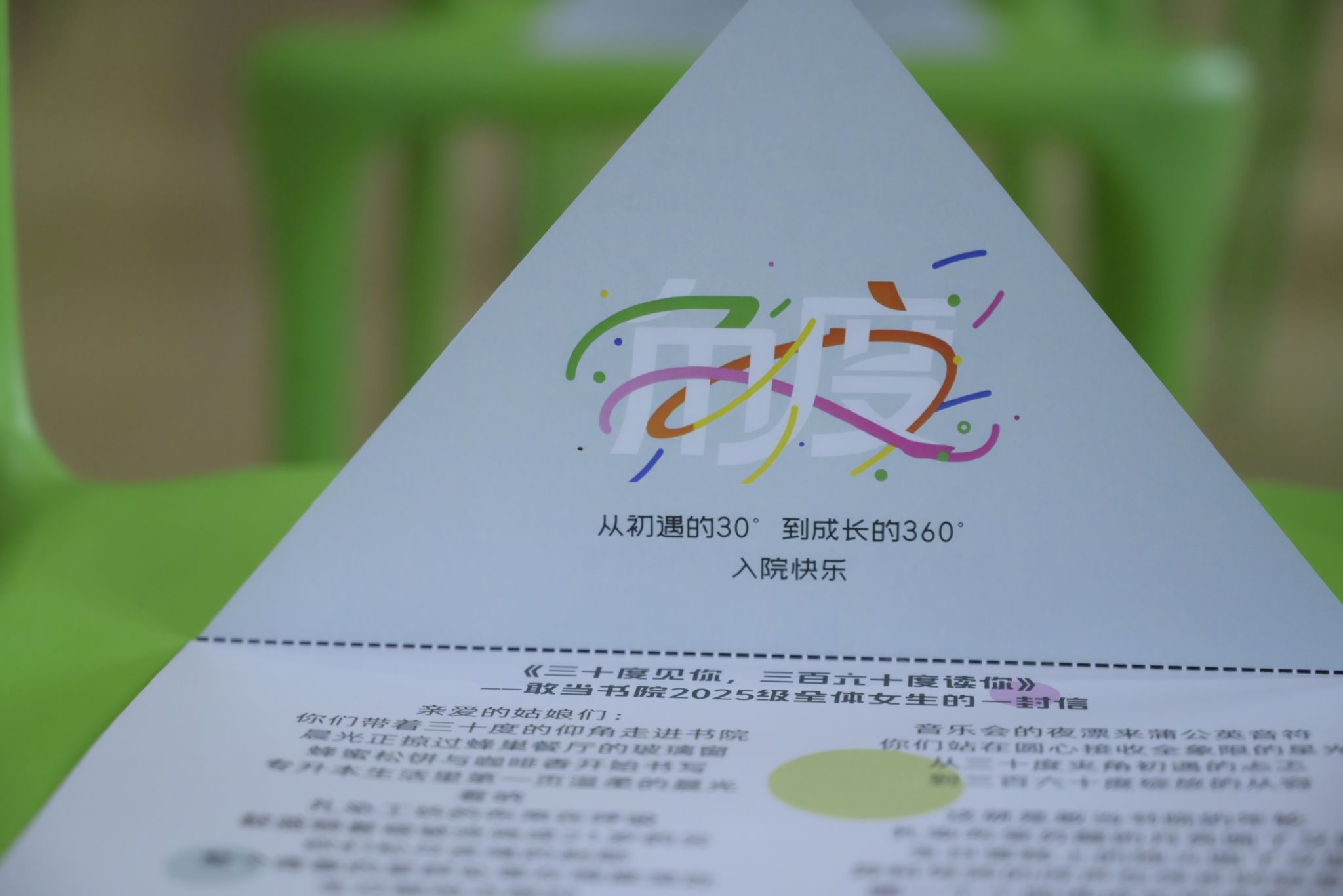 书院的蜂巢餐厅8:00准时营业,以热气腾腾的早餐迎接每一位同学,也拉开了入院礼的序幕。步入书院,云步长廊的敢当一周年微型展已随着时间悄然启程,每个夹角中的瞬间都记录着书院学子扎根与生长的痕迹。每位入场同学都收到了一封名为《三十度见你,三百六十度读你》的来信,这也是书院写给新生们的一封温暖家书。