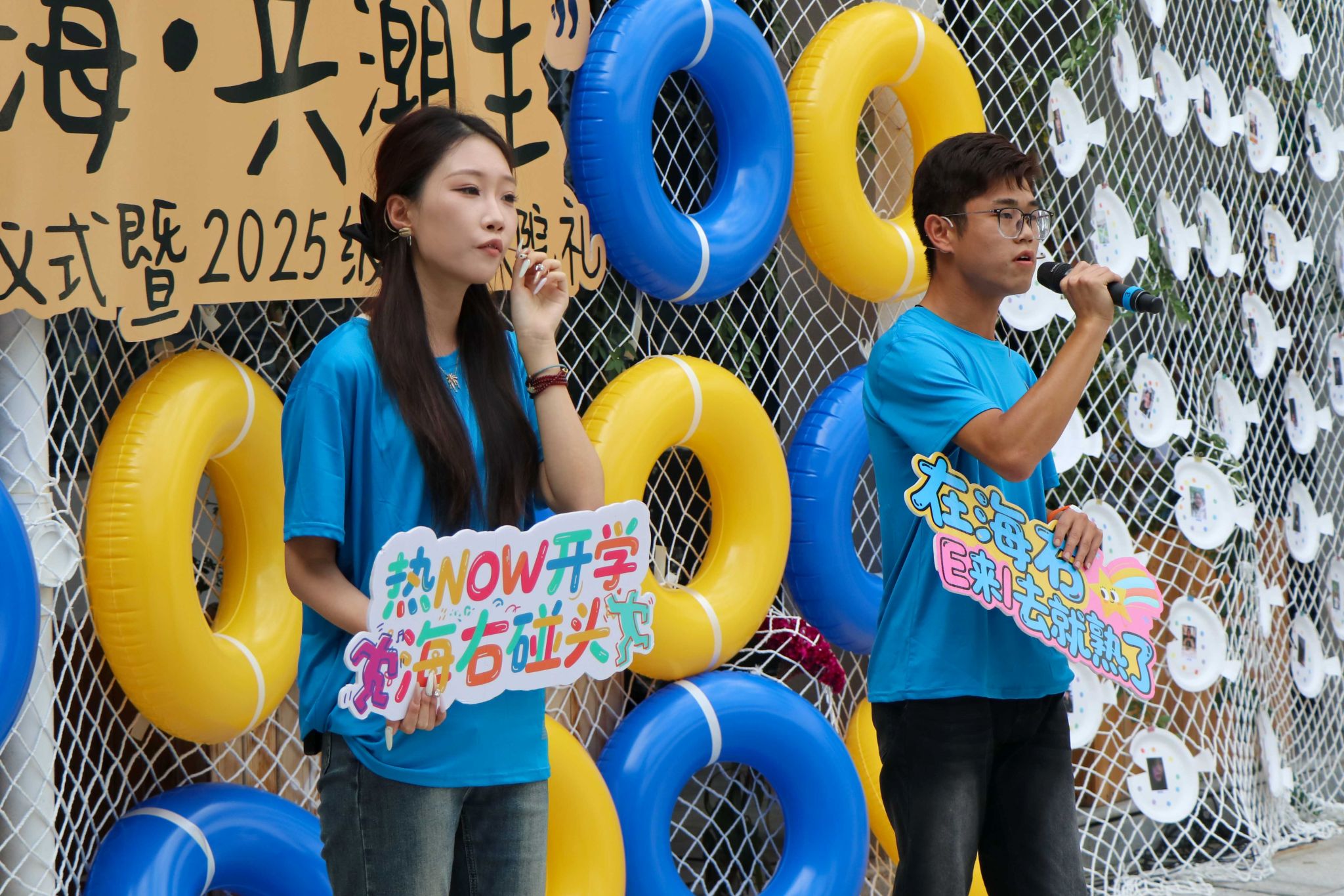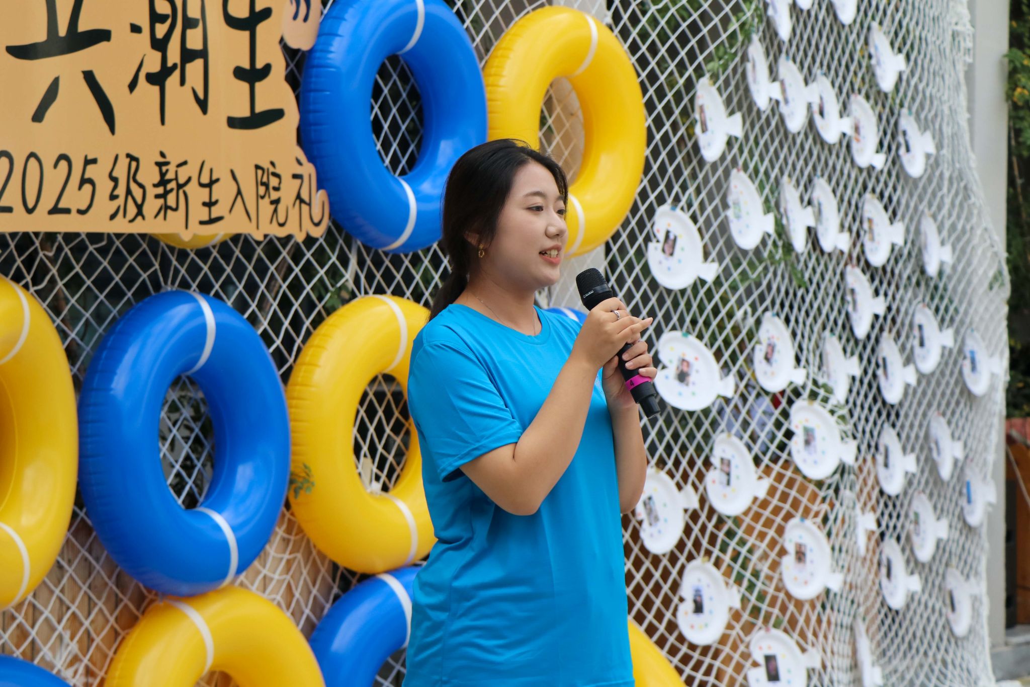 随后,新生代表张彤(海右书院/艺术传媒学院)分享道:“‘落日余晖下沉,浪漫海右置顶’的标语让我一见倾心,而学姐主动帮我搬运行李的温暖瞬间,更让我深信这里不仅是居学一体化的空间,更是一个让梦想扎根的精神家园。” 陈美含(海右书院/艺术传媒学院)接着分享道:“从宿管阿姨送还我遗失录取通知书时的叮嘱,到入院礼上对‘海右人’身份的深刻感知,这些温暖的时刻让我真切体会到,书院为我们打造了一个有归属感的精神共同体。”