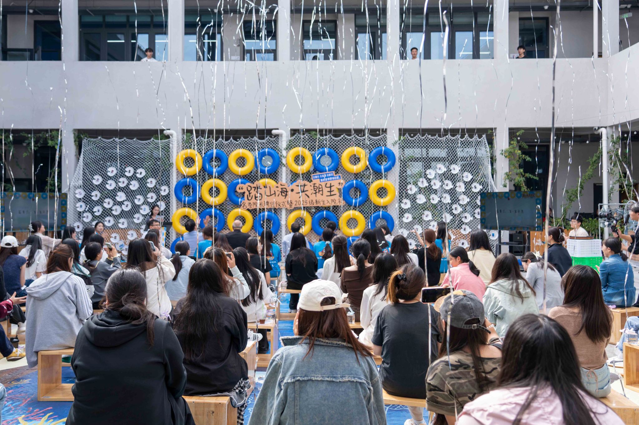 书院钟声悠远,回响在庭院上空。礼花绽放,无数绚丽的飘带从二楼倾泻而下,在空中划出充满生命力的轨迹,象征着那些“生生不息”的鲜活故事正汇入书院的血脉。这纷扬的飘带,是书院对每一位学子浪漫而盛大的欢迎,让每一份热爱在山海间绵延生长。
