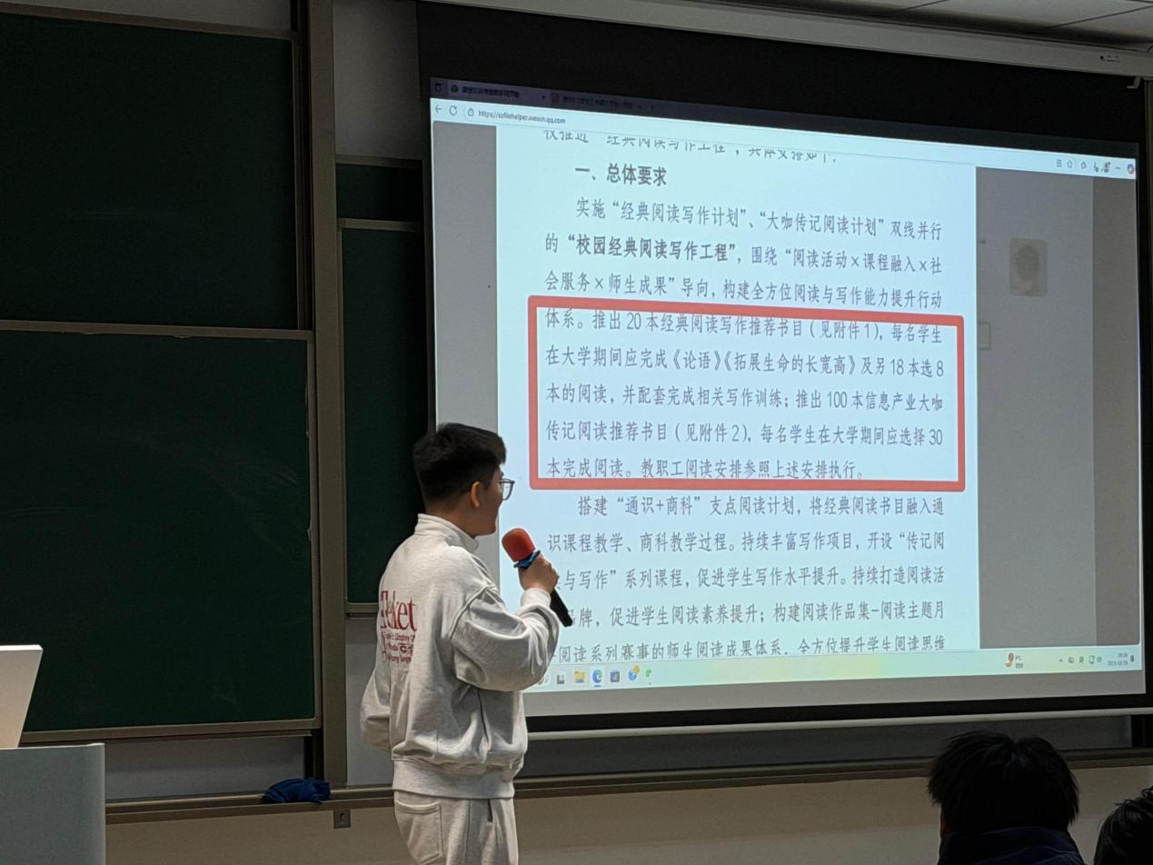 10月,全新更新的20本经典阅读写作推荐书目及100本信息产业大咖传记阅读推荐书目在进一步丰富了阅读类目的同时也为师生提出了新的阅读目标,全校积极响应“关于做好2025级新生‘校园经典阅读写作工程’的工作提醒函”的各项工作要求,各有关教学单位全面落实“通识+商科”支点阅读计划,将书籍首课推荐与商科思维、博雅文化、电影艺术和科幻想象结合,将阅读应用到更多课堂场景;各学院为阅读计划安排专人专场进行深度解读、经验传授、答疑解惑,让阅读走进了更多新生心里;各书院学院将读书写作与组队闯关、古今对话、情景演绎、生活实践、话题探讨融汇,为阅读增添了更多可能。