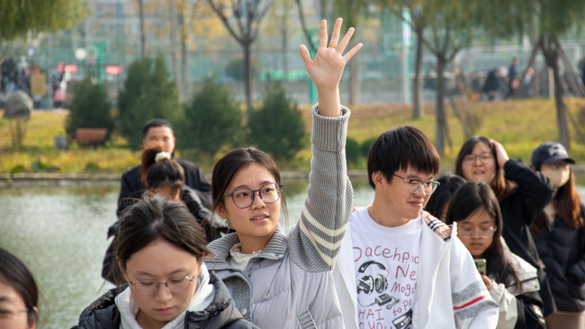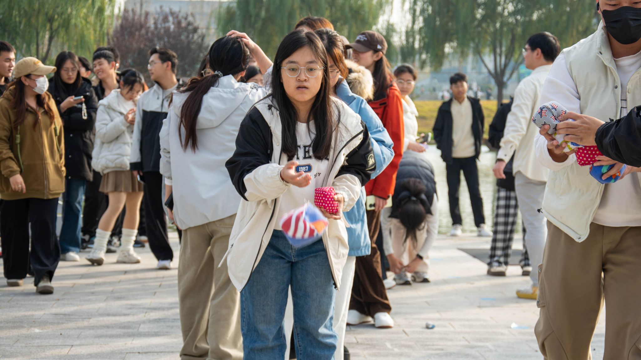 知识问答环节结束后,广场周边的三大游戏摊位排起了长队:羽毛球点球挑战前,2-4人一组的挑战者小心翼翼在微风里颠起羽毛球,眼神紧盯球托,生怕它落地“罢工”,不时传出来成功坚持一分钟的同学的欢呼庆祝声;沙包投掷区,学子们屏息凝神,瞄准数米外的目标区域精巧地把握投掷力道,沙包落地的瞬间,欢呼声与惋惜声交织;“已经过去一分半了”“再坚持30秒”平板支撑挑战前,大家撸起袖子、俯身撑地,汗水顺着脸颊滑落却无人轻言放弃,无论是成功与否,勇敢挑战的同学都获得了观摩者的掌声。