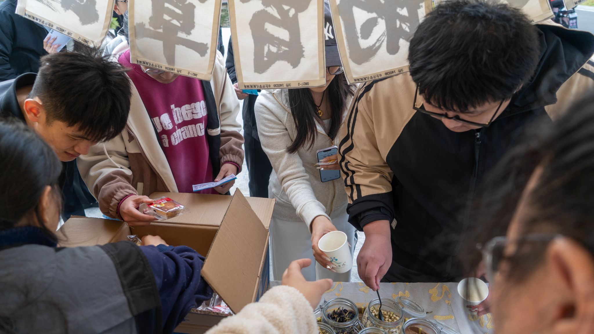 集体跳操的热血尚未褪去,趣味互动环节便紧接而来,将现场氛围推向新的高潮。健康生活知识抢答赛率先“开战”,18道涵盖健身常识、低碳生活的题目刚一抛出,台下学子便纷纷举手、跃跃欲试。工作人员穿梭在人群中,邀请最热情的同学上台作答,每当正确答案脱口而出,现场便响起阵阵掌声,答对者手持崭新的“五汶书院时令交子”,脸上满是收获的喜悦。