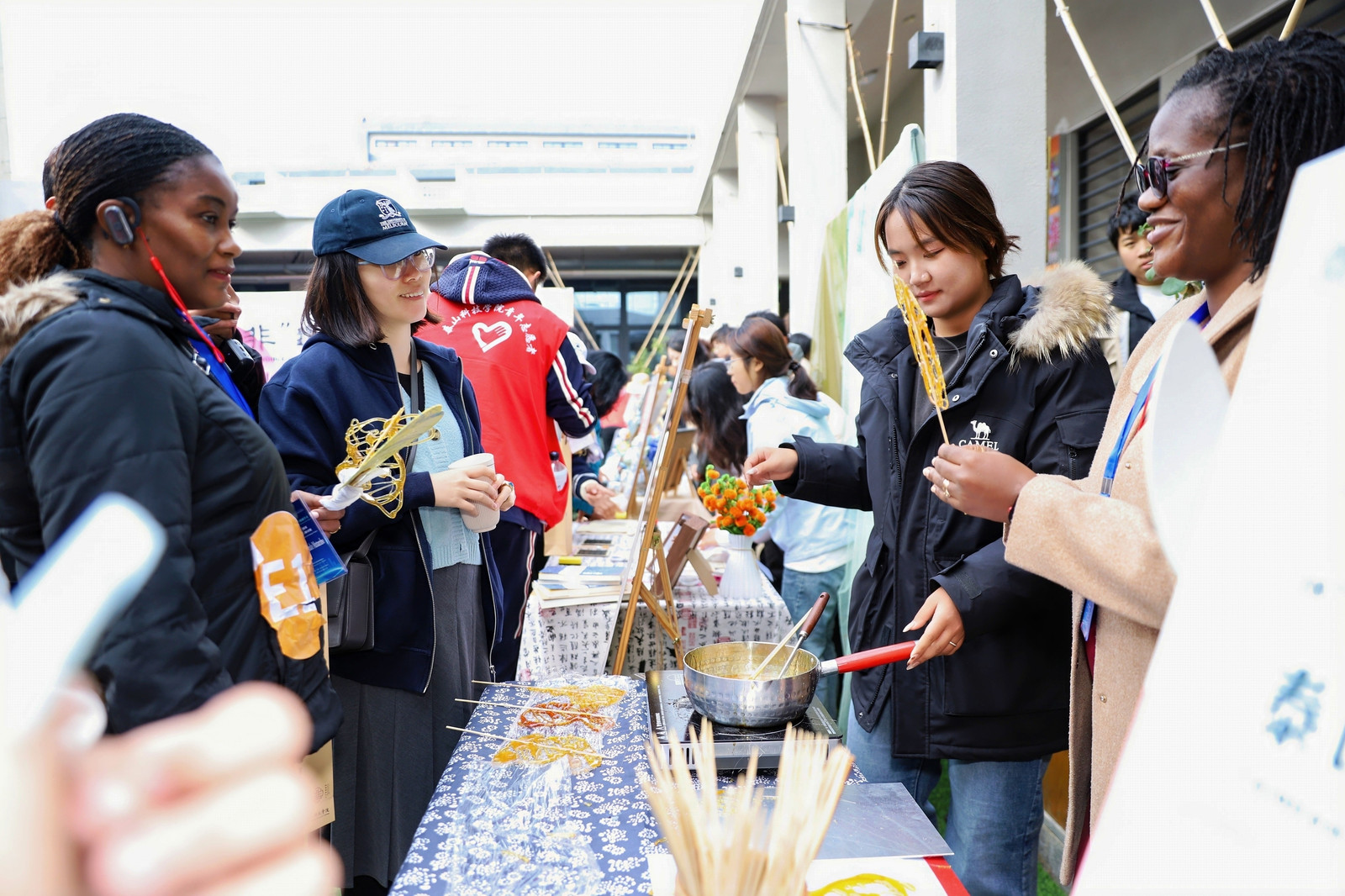 非遗实践课上,校园传承人手把手教嘉宾绘制糖画,将成品贴心送至用餐处,让甜蜜与趣味并存;久屿华裳工坊将精心制作的宋锦赠予巴勒斯坦嘉宾,对方当即别在胸前,让跨越千年的东方美学,连接起遥远的心灵。“我们感受到了满满的关注,不仅深入了解了中国文化,更从你们的教育实践中获得了全新灵感!” 秘鲁嘉宾Carmen Yolanda Concha Tenorio在体验完文化活动后,满脸笑意地分享道。
