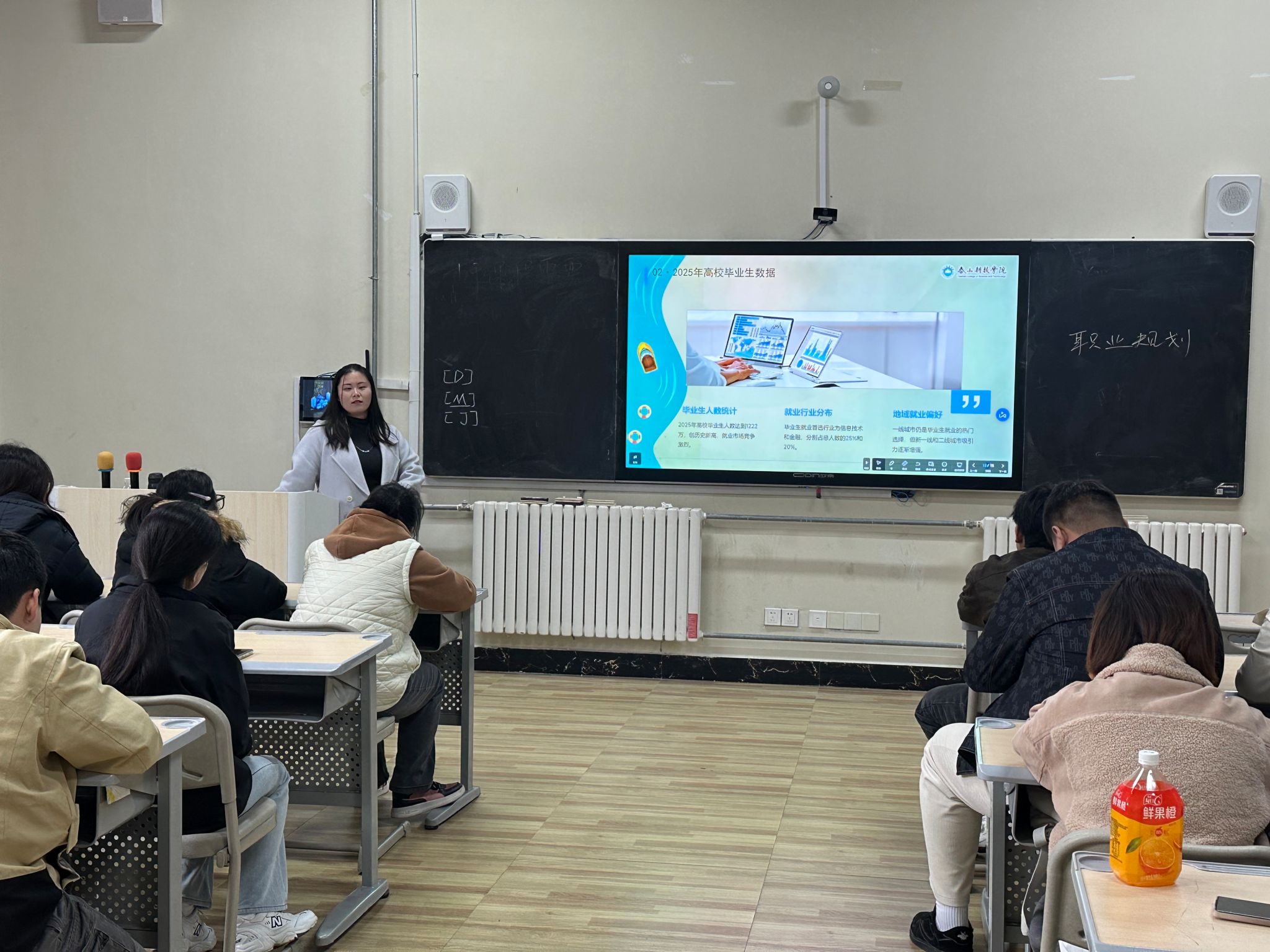 紧接着王老师解读了2025年高校毕业生数据、就业行业主要分布情况以及地域就业偏好,2025年高校毕业生人数创历史新高,同学们也意识到了就业市场的激烈竞争,王老师提醒同学们要转变就业观念,不要拘泥于传统的就业观,重要的是要找到适合自己发展的道路,结合自身兴趣、能力和市场需求,作出理性的职业选择。