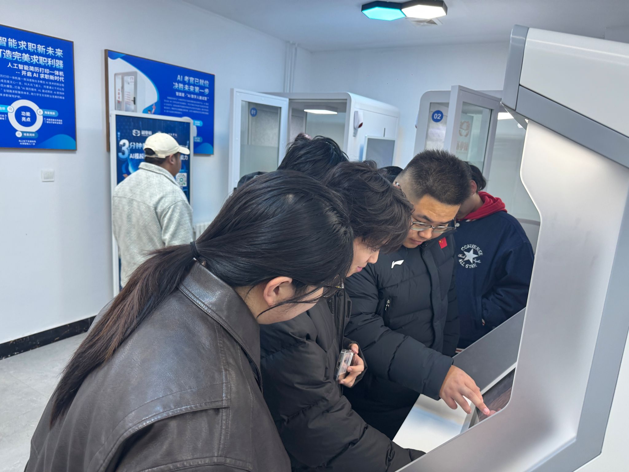 在AI简历撰写体验区,同学们亲身操作智能工具,学习如何精准提炼个人优势、匹配岗位需求。一键生成、智能优化的高效流程,让传统简历制作的繁琐转变为数据驱动的精准表达。模拟面试区,学生们拿起话筒,像经历一场真实的面试一样,认真回答系统给出的相关提问。