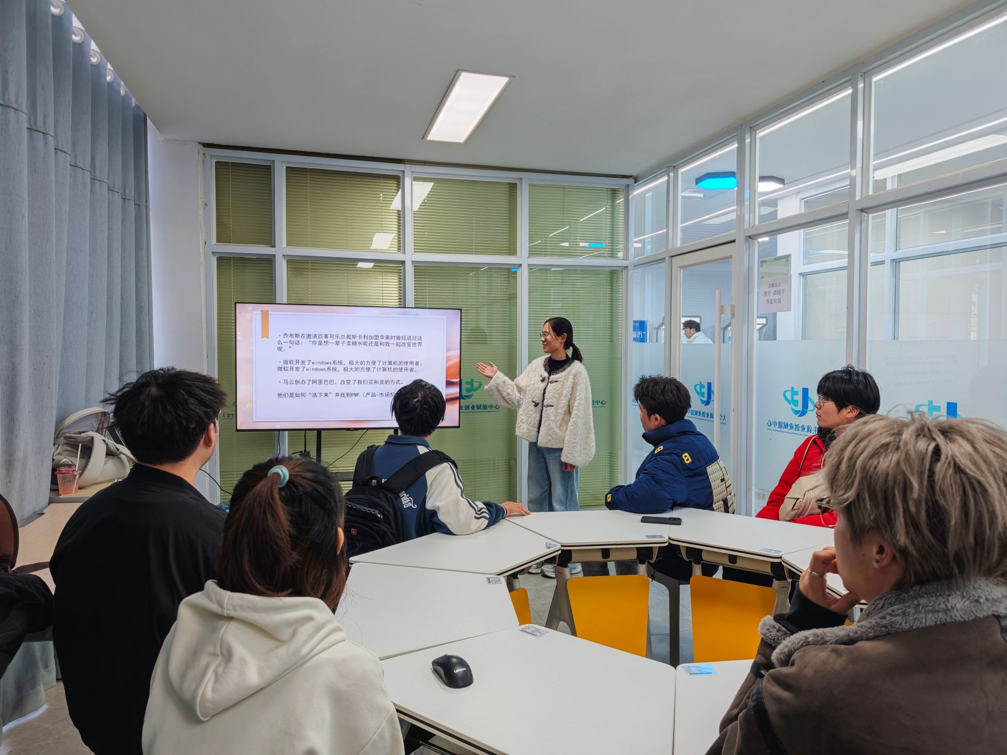 活动伊始,刘阳老师以“你眼中的创业是什么?”抛出问题,瞬间点燃现场氛围。她结合苹果、阿里巴巴的成长历程,拆解创业核心逻辑:“创业不是盲目跟风,而是精准抓准市场痛点——苹果聚焦用户对‘简洁体验’的需求,阿里瞄准‘中小企业线上贸易’的空白。”随后以星巴克为例,阐释“用更少资源创造更大价值”的本质,还特意提醒学生关注“AI 赋能传统行业”“银发经济”等新兴机遇,不少学生边听边快速记录要点。