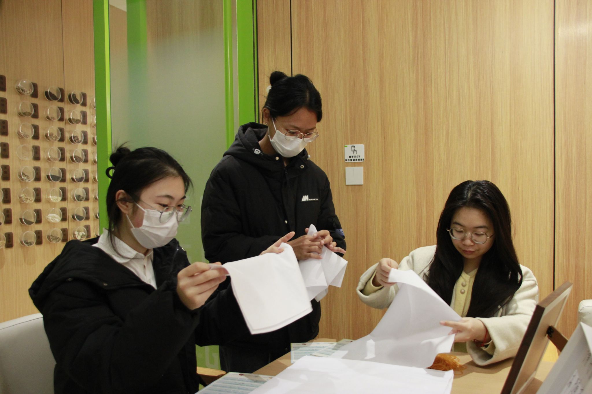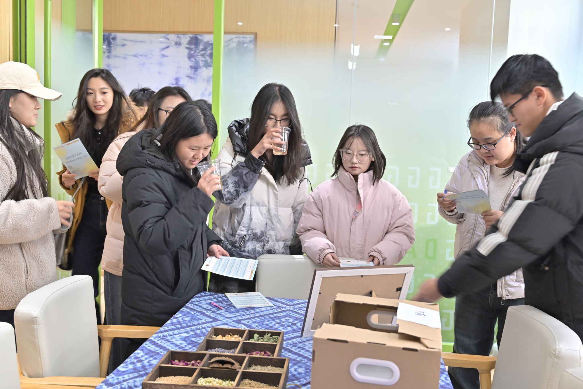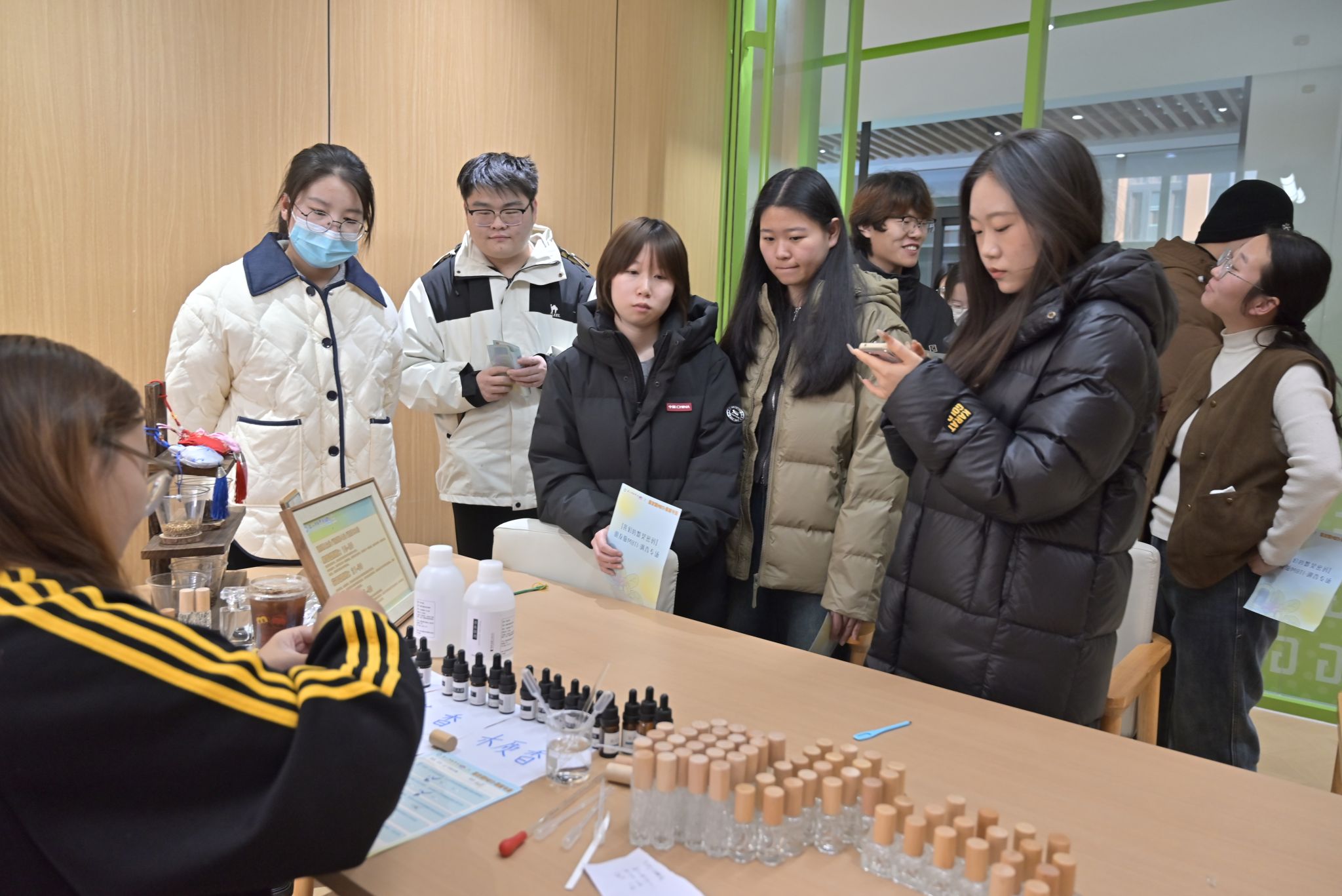 在敢当书院无边·项目工坊集成空间(104)如一场温暖的对话,无需太多言语,却处处心意相通。师生二人结伴,轻轻推开五个默契关卡的门。从分享彼此记忆里那个“一起完成”的故事,到俯身轻嗅石上若有似无的香气;从辨认一杯中药茶里熟悉或陌生的草本气息,到在卡片上写下“我心中朋友的样子”;最后,两个人手指协作,将色彩与布料缠绕成一件小小的扎布作品。最终,所有选择被细心收集,化为一缕独属的香气。或是清甜如初夏果实、或芬芳似春日花园、或沉静如雨后的林木,盛放在与你气质相配的香氛容器中。敢当书院/大数据学院的赵凤钏接过那份“香气答案”说道:“今天我和老师的默契是有香气的,以后我闻到这瓶香水,就会想起今天。”这一段可感知、可珍藏的相处记忆。师生之间那些未言说的理解与靠近,忽然有了形状,也有了温度。