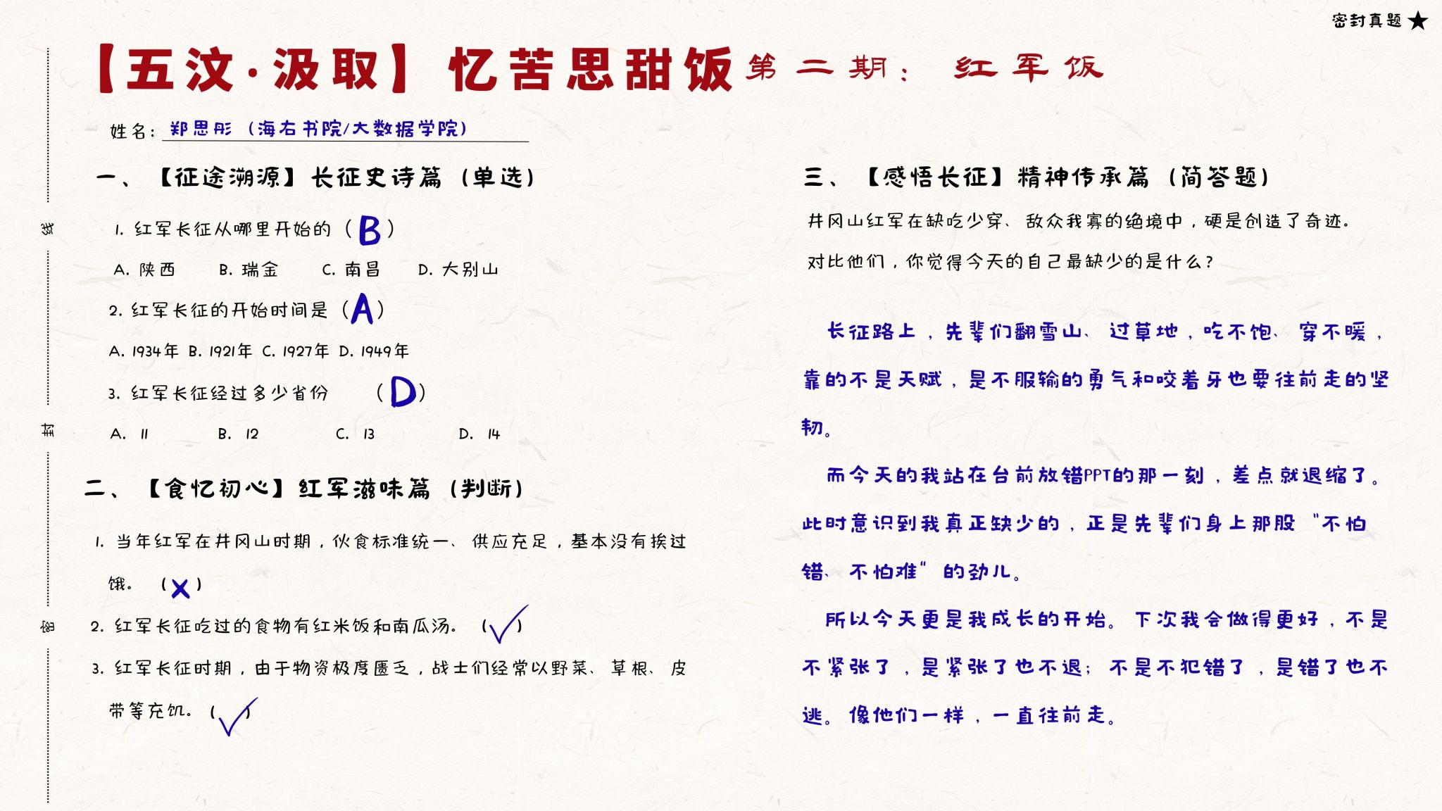 4月3日14:00,五汶书院共享厨房内《红米饭,南瓜汤》的旋律缓缓响起。【五汶·汲取】忆苦思甜饭第2期:红军饭拉开帷幕。时光摆渡人郑思彤(海右书院/大数据学院)带着大家不只是为了一顿饭,而是走进一段历史,感受一种精神。与以往不同,今天我们从“做题”开始。