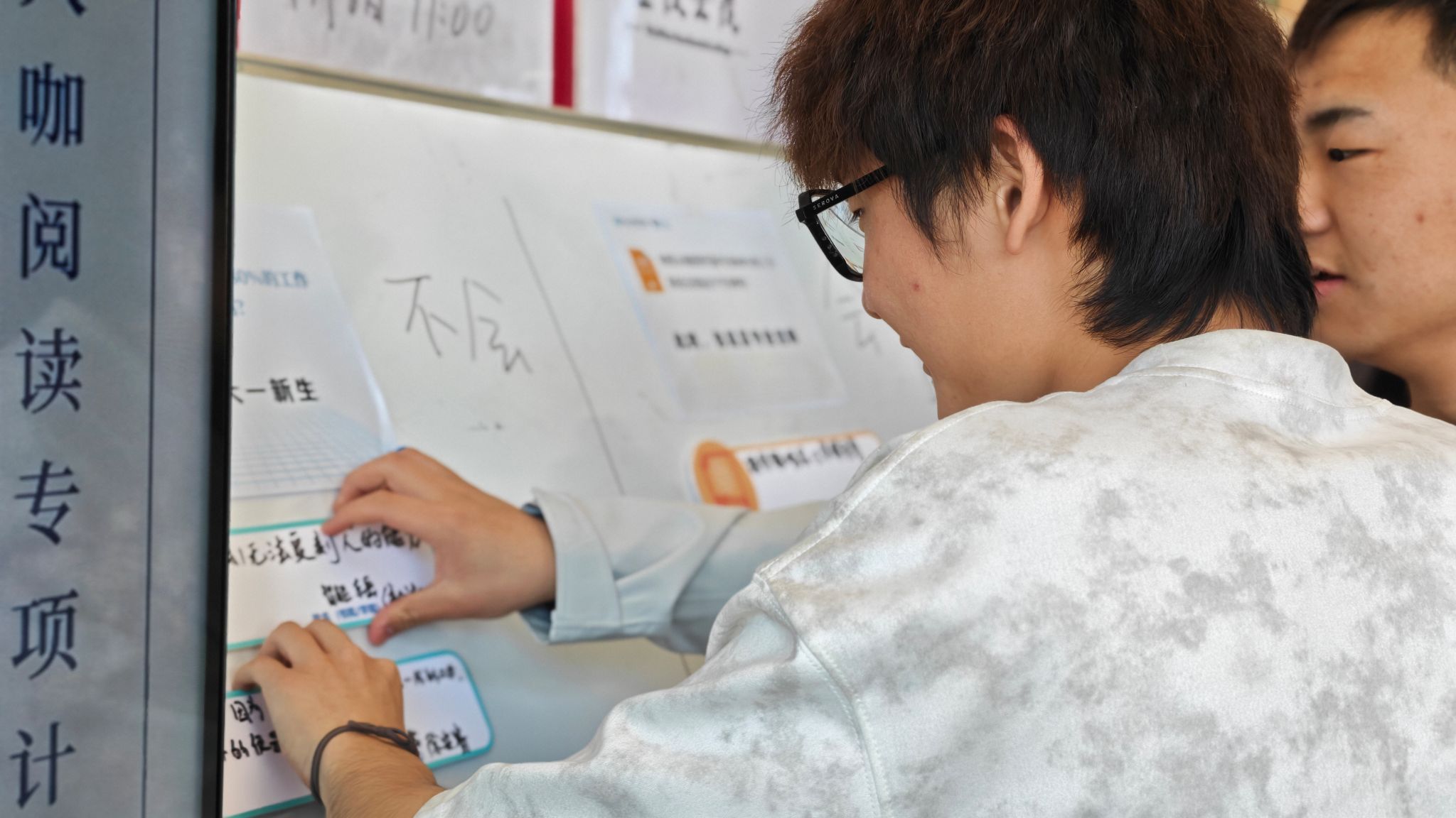 随着五汶书院发展导师刘珊的提问与引导,大家纷纷在彩色卡片上写下自己的答案,一张张贴满了前面的黑板。“大一新生们”率先表达了坚定的态度。“就算AI能替代80%,我就不学这个专业了。”来自东岳书院/智能工程学院的侯代权同学说道。“不是不喜欢,是害怕。我怕四年学出来,发现会的东西已经不值钱了。李开复在书里说,很多重复性岗位会被取代——那我学的这些东西,是不是就是第一批被淘汰的?”他顿了顿,补了一句:“不是放弃,是想先活下来。