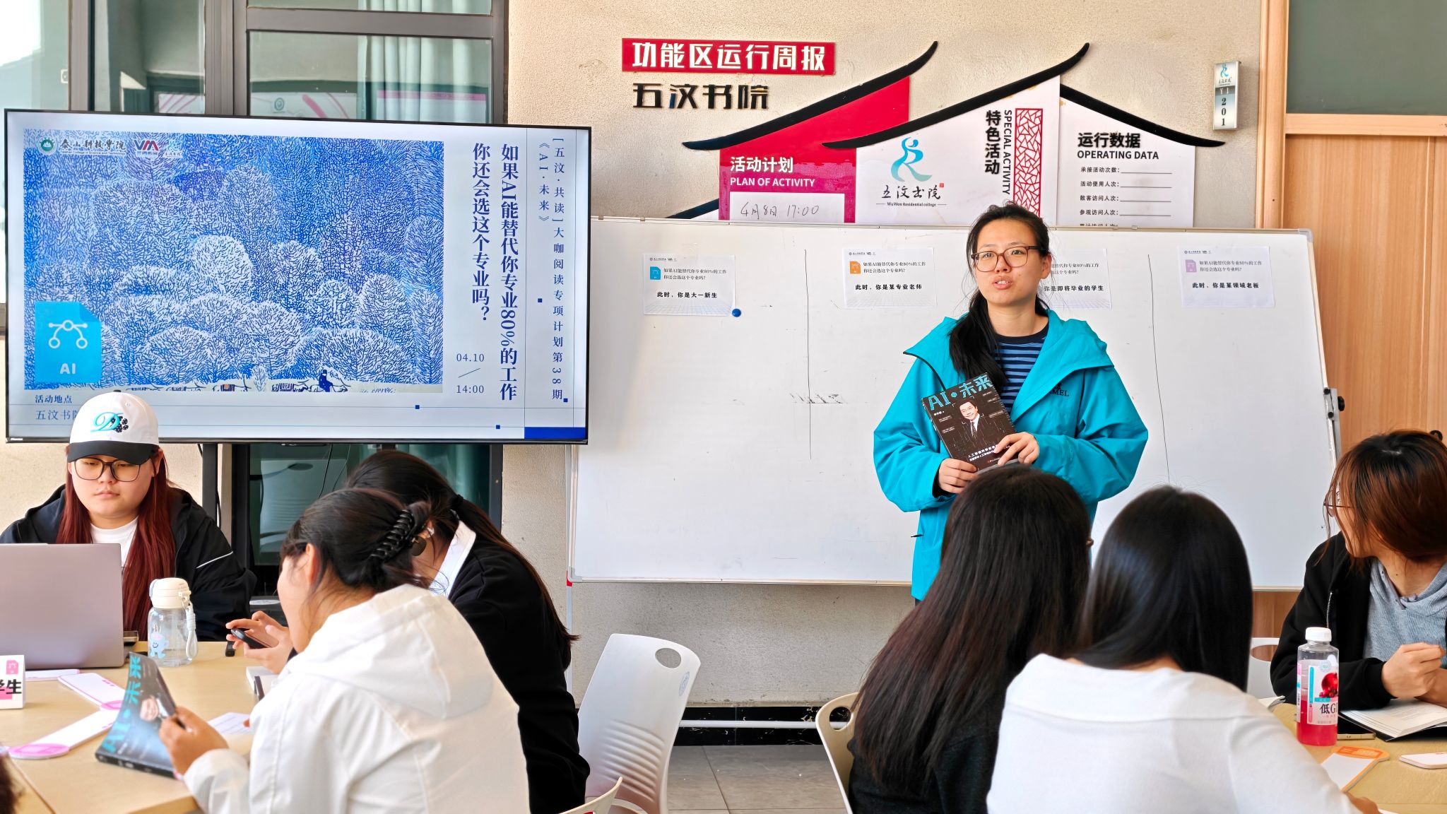 4月10日14:00,五汶书院门厅,一场大咖阅读在领读者李妍(敢当书院/大数据学院)的提问中开始。翻开李开复的《AI未来》,抛出一个让大家都愣了几秒的问题“如果AI能替代你所学专业80%的工作,你还会选择这个专业吗?”