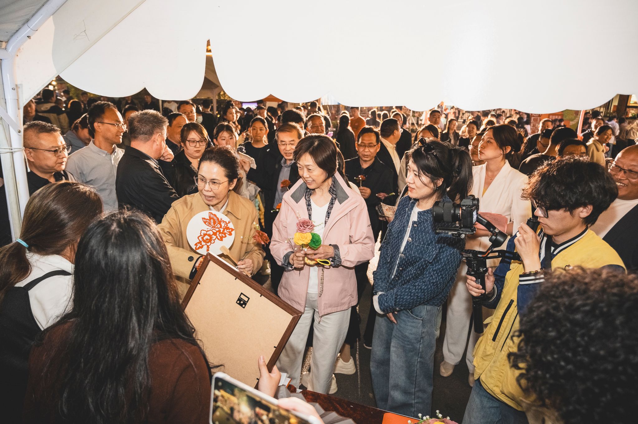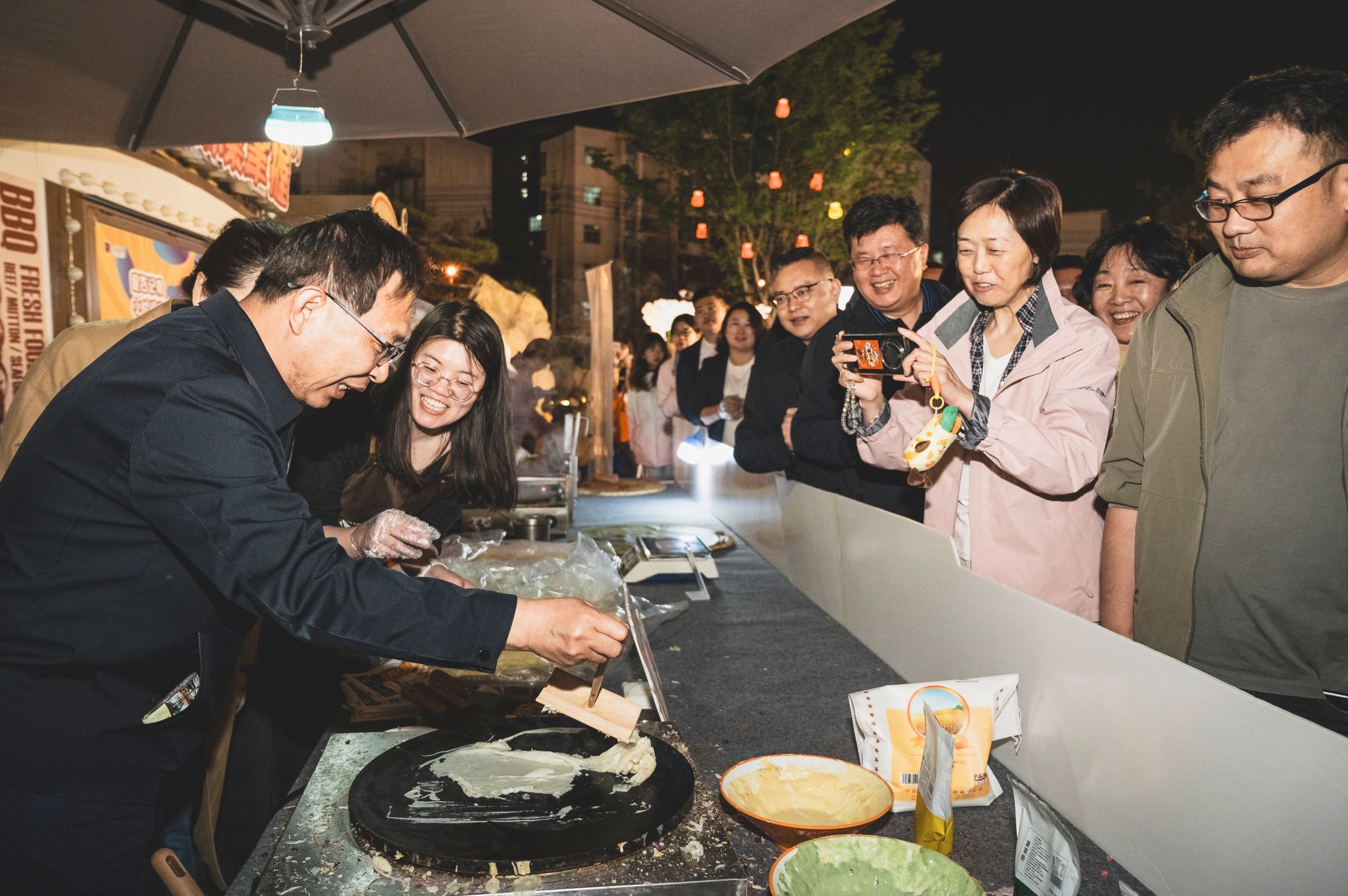开幕式后,煎饼文化集市亮相。“永不凋零的花”摊位内,泰山煎饼工坊用彩色面糊匠心制作可食用的“煎饼花”,色彩斑斓、造型精巧,将美食与美学完美融合;“文创煎饼”摊位里,兰亭雅集书法工坊将书法艺术与煎饼制作相结合,一笔一画间,让墨香与饼香交织;“寻味千年”摊位展示了由非物质文化遗产研究中心所复刻的古法陶鏊,诉说着煎饼跨越千年的传承与变迁。