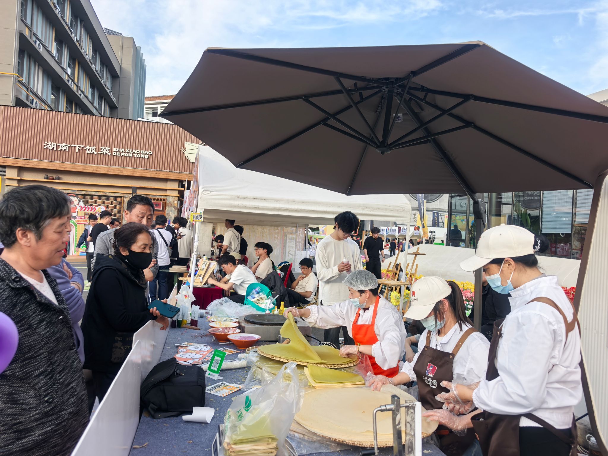 “这是我第一次走出校门举办活动,作为开幕式上我盯紧电脑屏幕,卡准每一段音乐和PPT。汉服同学走秀时,我一边切PPT一边竖着耳朵听音乐是不是刚好卡上走步。等剪彩环节彩带飞起来、全场鼓掌的那一瞬间,我才终于把悬着的心放下来,看着台下的叔叔阿姨哥哥姐姐和小朋友们跟着音乐打拍子、被屏幕上的煎饼故事吸引,这是值得记录且被被煎饼包裹的一天。”