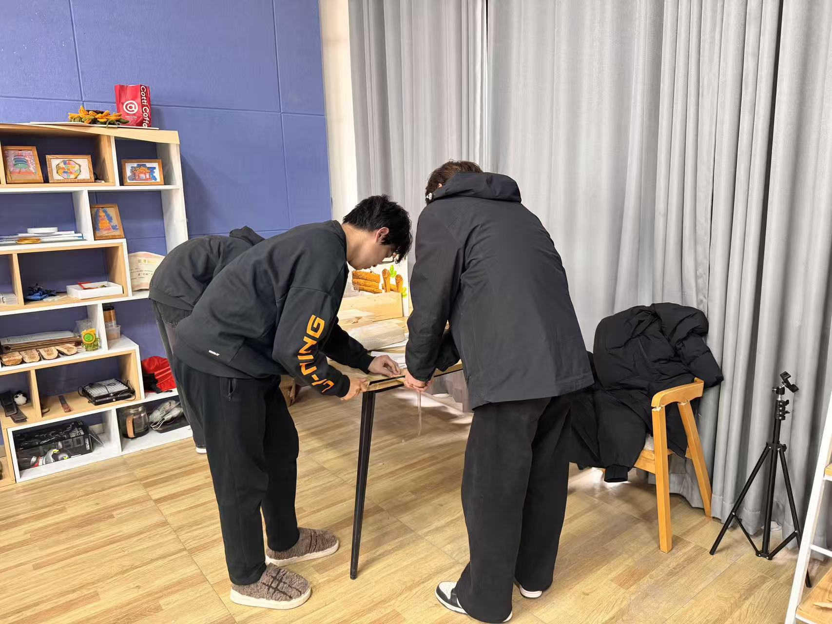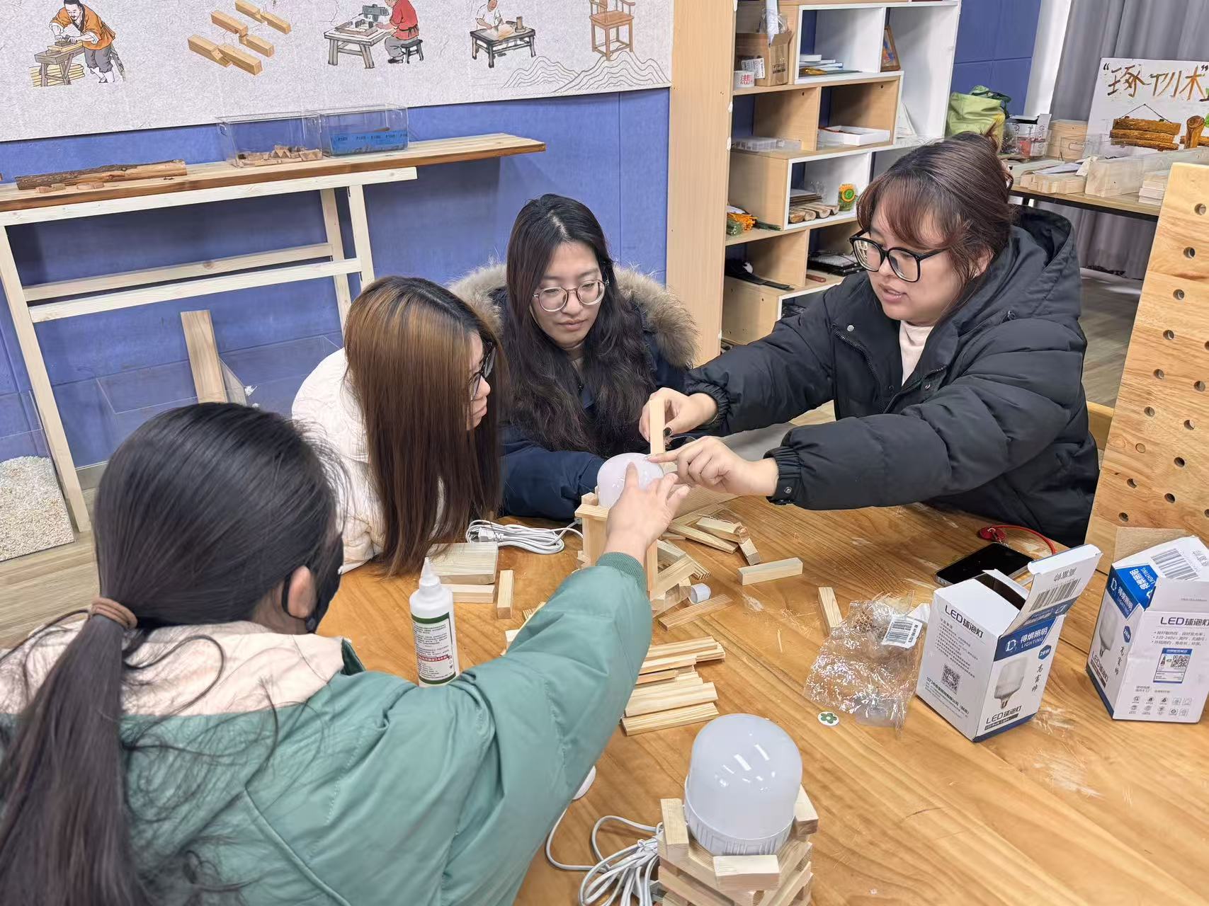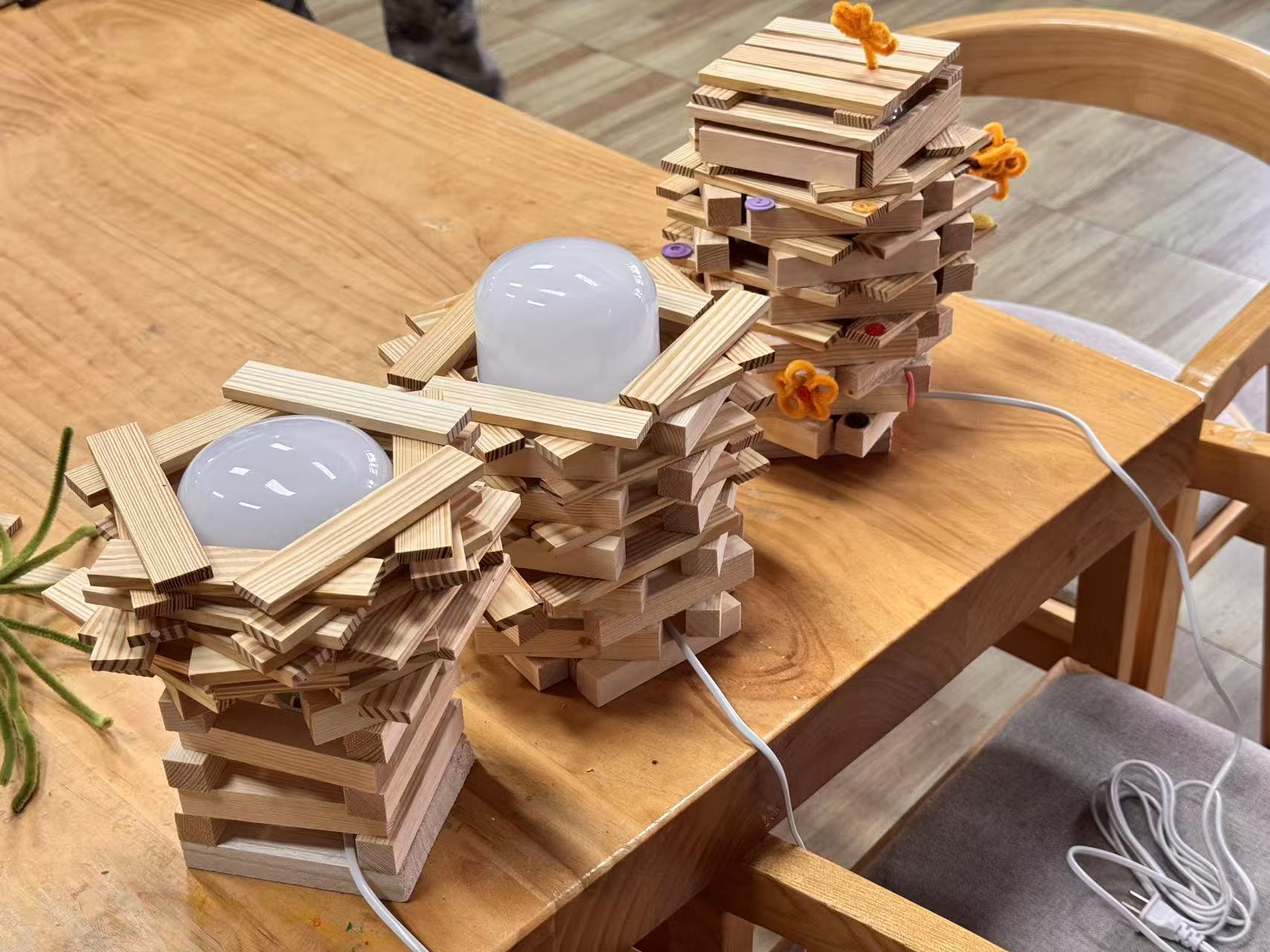 随后,在工作人员的引导下,参与者们以小组为单位开启创作之旅。从粗糙木材到细腻打磨,从零散木块到创意拼接,再到小心翼翼地安装电路,每一个步骤都凝聚着大家的专注与巧思。现场没有喧嚣的电子音效,只有砂纸摩擦木材的 “沙沙” 声、工具碰撞的轻响,以及同学们偶尔的交流讨论 ——“你看这样拼会不会像云朵造型?”“电路接口要对准,不然灯可能不亮哦”“这块木头的纹理刚好能做灯座的装饰”。大家互相分享灵感、协助解决问题,原本陌生的同学也在协作中逐渐熟络,现场氛围热烈而温馨。