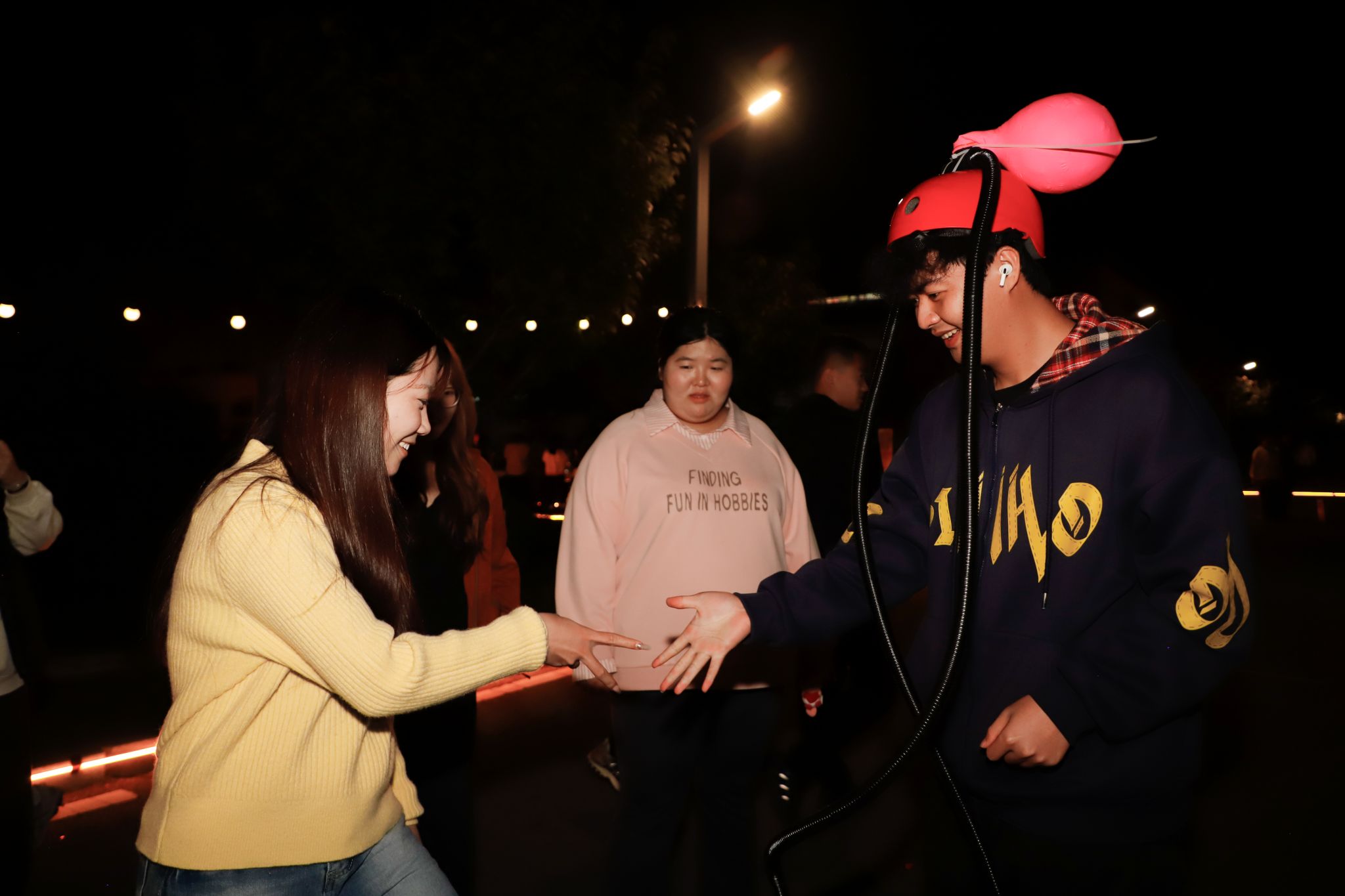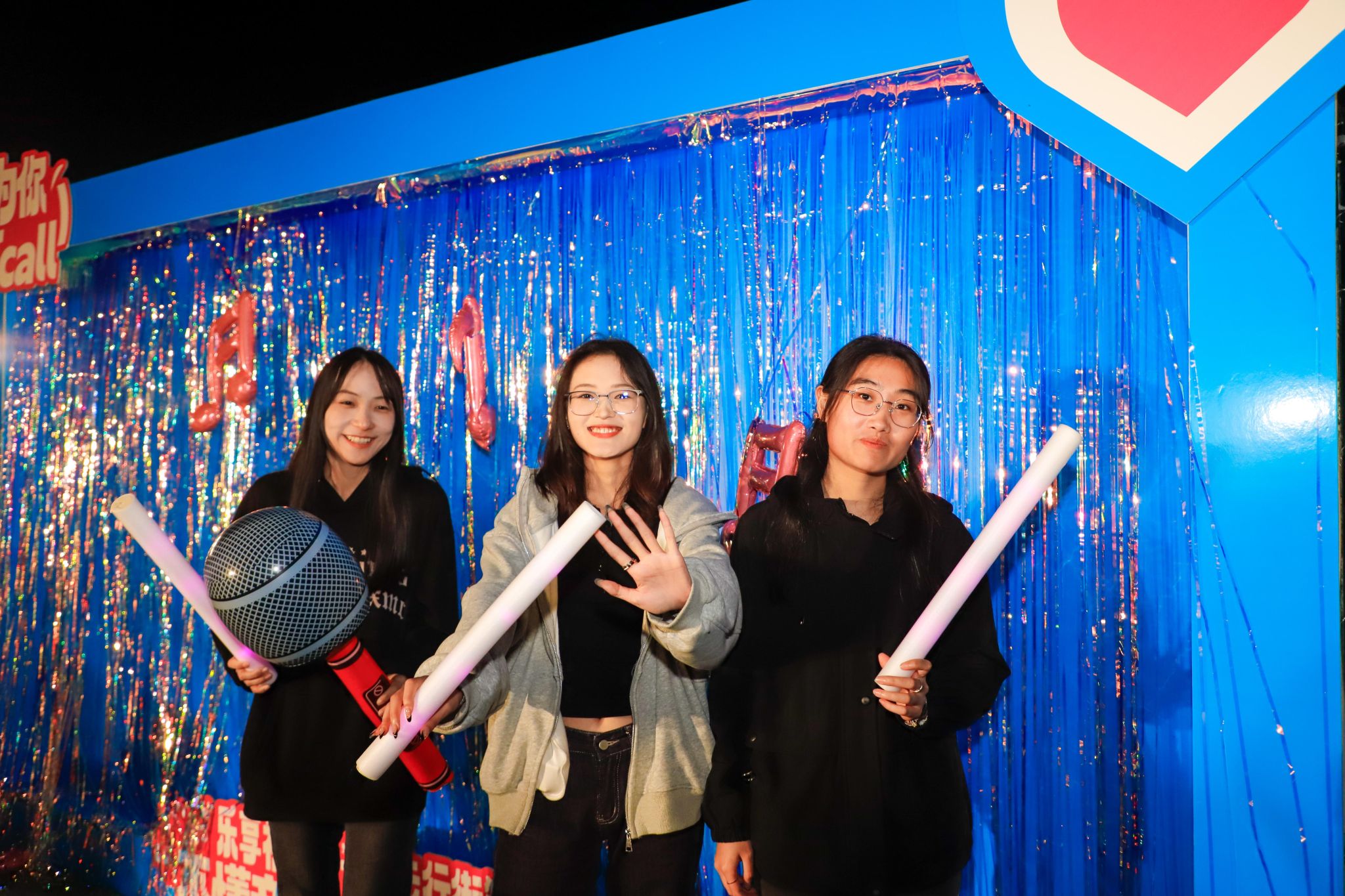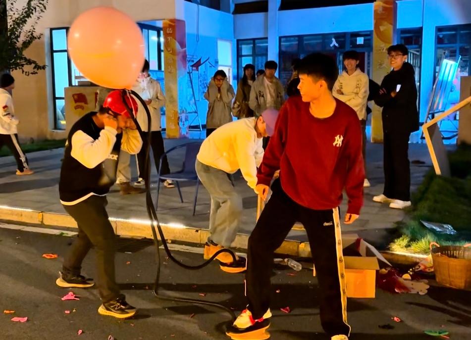 “我完全跟不上拍子!”“我来我来!”“你要跳舞吗”摊位前传来阵阵笑声,同学们在跳舞毯上跟着节拍踩着鼓点。“一敲遇知音”摊位前叮叮咚咚的清脆声响,大家惊讶于原来不需要懂乐理,随手一敲也能创造出悦耳的旋律。此刻“疯狂气球”前的比拼也正式开始,“你唱上句,我唱下句”有同学接不上词开始现场编造,跑调的歌声反而赢得满堂彩,气球随着音乐声逐渐放大,大家也随着紧张兴奋起来。“虽然我不会唱歌,但可以把喜欢的旋律画在手上呀。”海娜手绘摊位上,同学们在手腕上描画着音符。这些跃然于腕间、流淌在即兴旋律里的音乐符号,打破了“音乐需要专业门槛”的刻板印象。