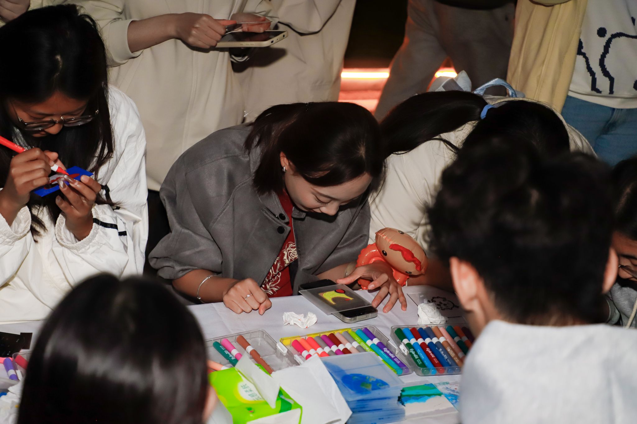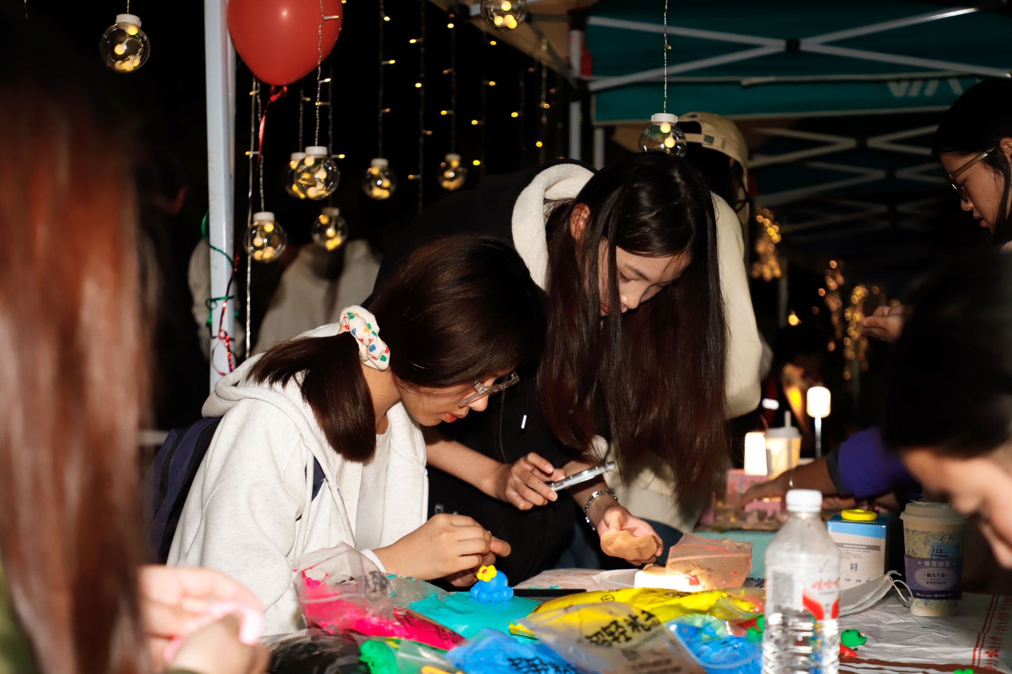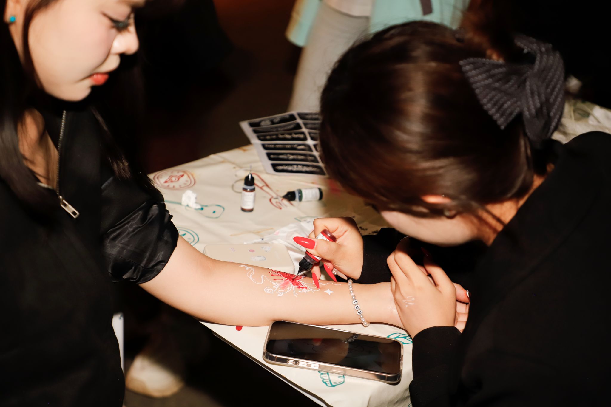 “我完全跟不上拍子!”“我来我来!”“你要跳舞吗”摊位前传来阵阵笑声,同学们在跳舞毯上跟着节拍踩着鼓点。“一敲遇知音”摊位前叮叮咚咚的清脆声响,大家惊讶于原来不需要懂乐理,随手一敲也能创造出悦耳的旋律。此刻“疯狂气球”前的比拼也正式开始,“你唱上句,我唱下句”有同学接不上词开始现场编造,跑调的歌声反而赢得满堂彩,气球随着音乐声逐渐放大,大家也随着紧张兴奋起来。“虽然我不会唱歌,但可以把喜欢的旋律画在手上呀。”海娜手绘摊位上,同学们在手腕上描画着音符。这些跃然于腕间、流淌在即兴旋律里的音乐符号,打破了“音乐需要专业门槛”的刻板印象。