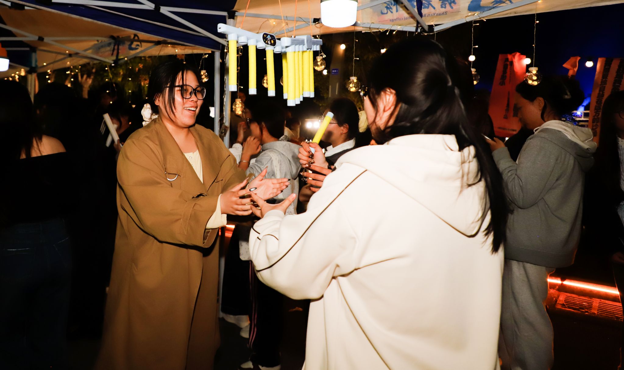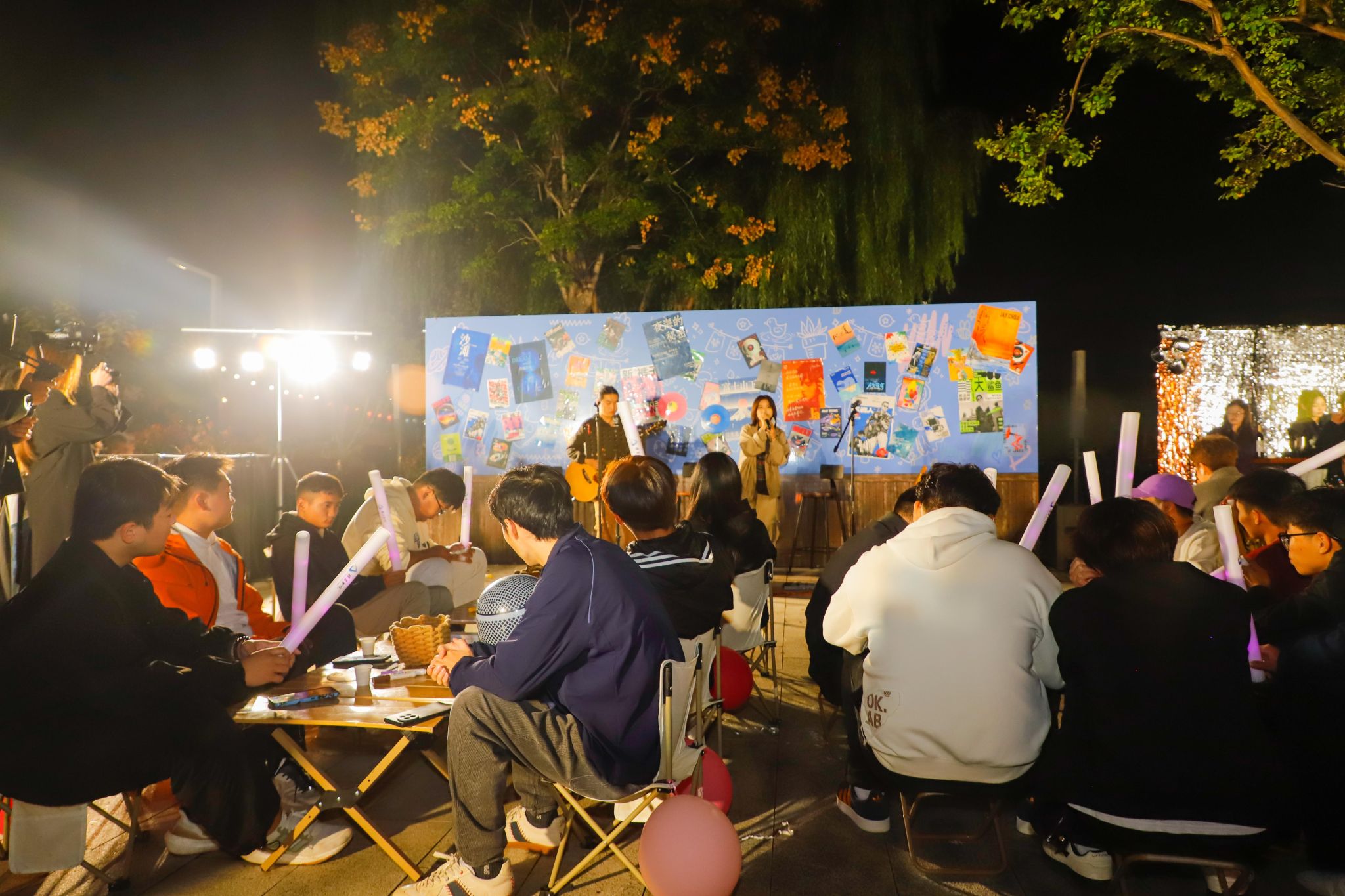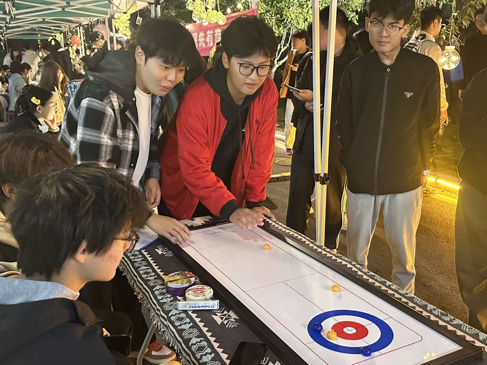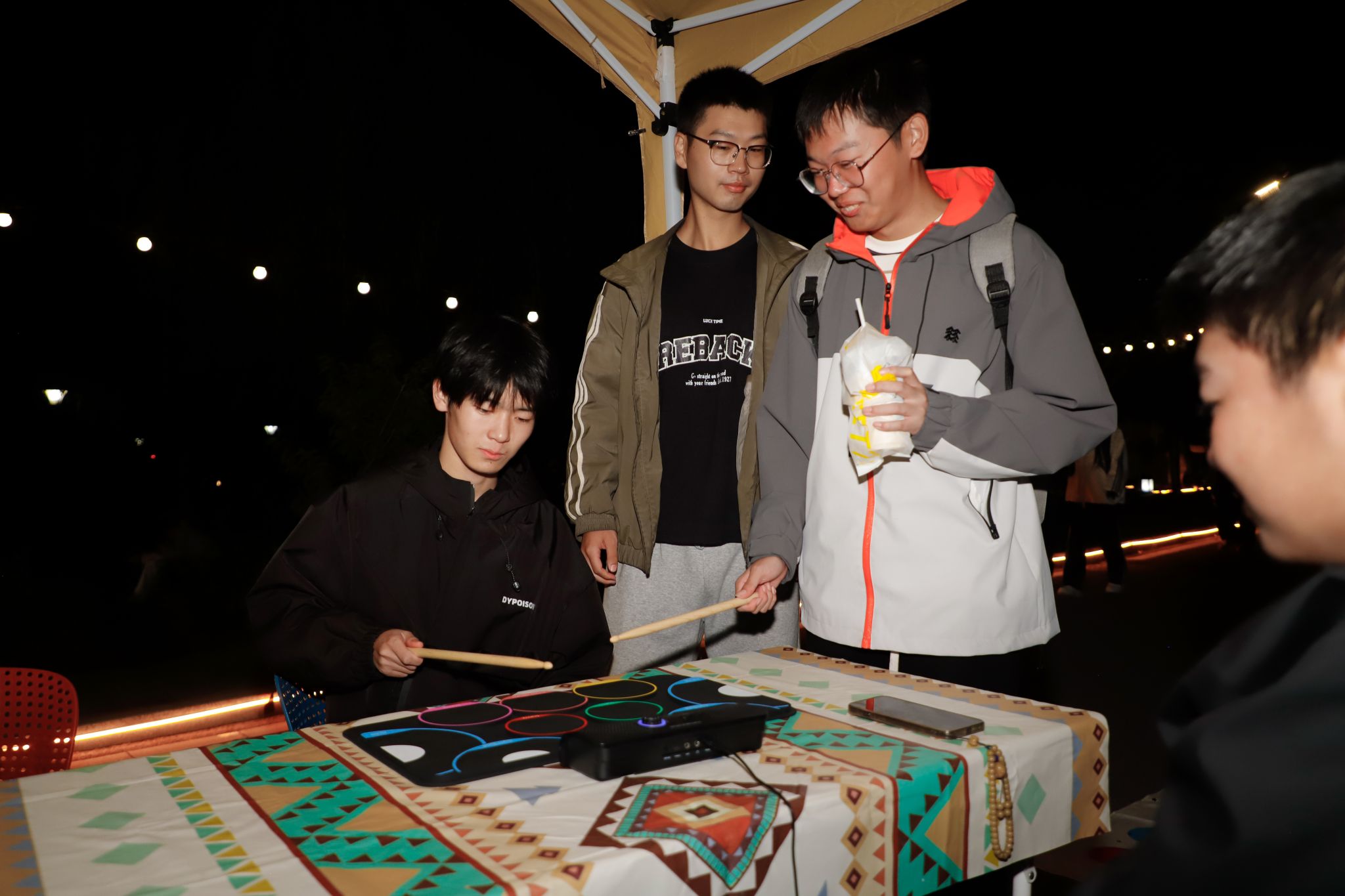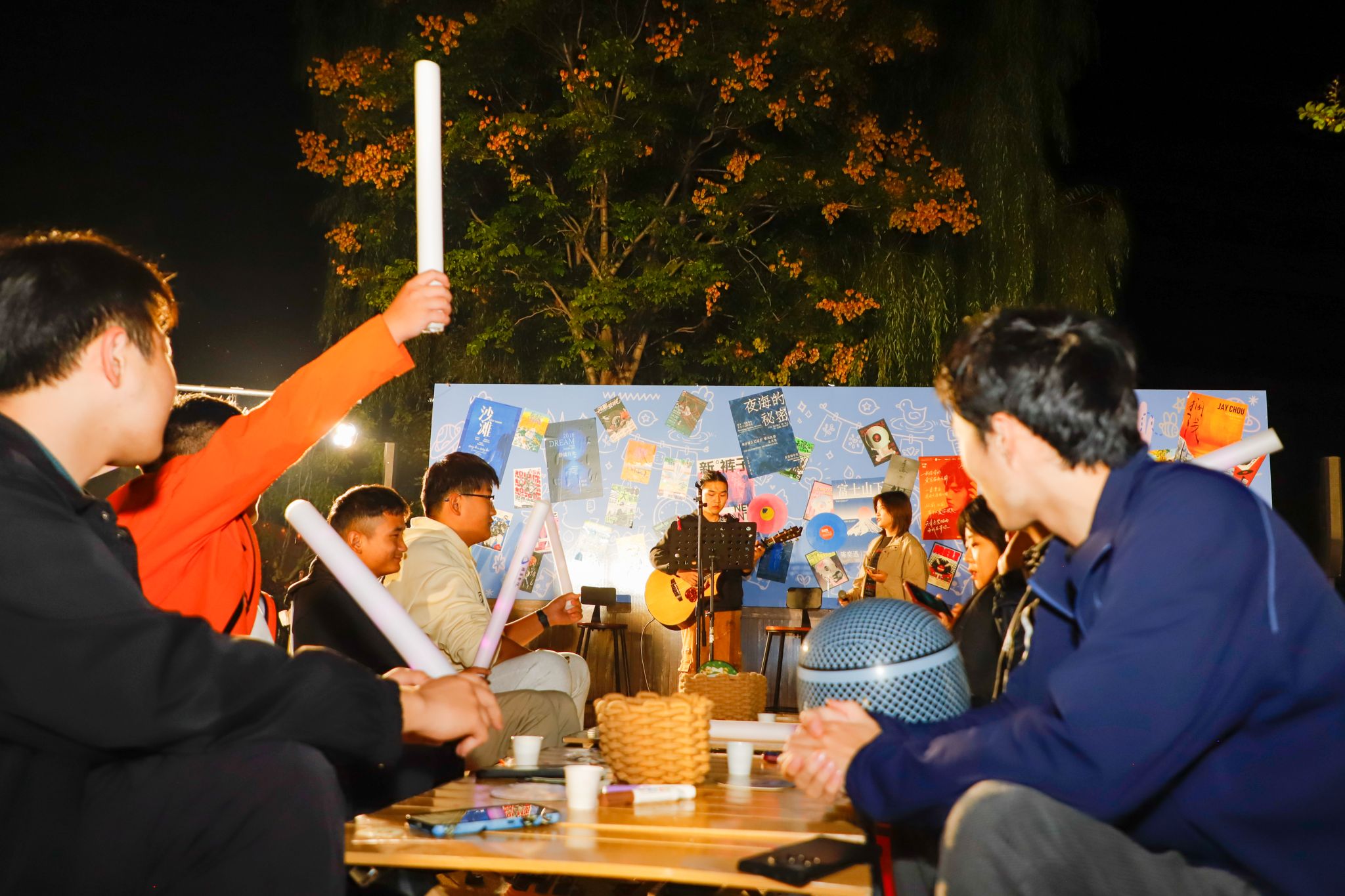 当秋天的晚风拂过发梢,还有什么比在星空下喝着热红酒听一场露天音乐会更浪漫的事?来自“乐燃指上”吉他社的同学们以一首《安河桥》开启了步行街上的第一曲,“我知道那个夏天,就像青春一样回不来”当熟悉的旋律响起,围坐在露营桌旁的同学们齐刷刷挥手跟着轻声哼唱,从慵懒民谣到轻快电子,音符随着晚风流淌,镜湖广场的红蓝光影之下,音乐驻唱成为整个步行街跳动的“心脏”。