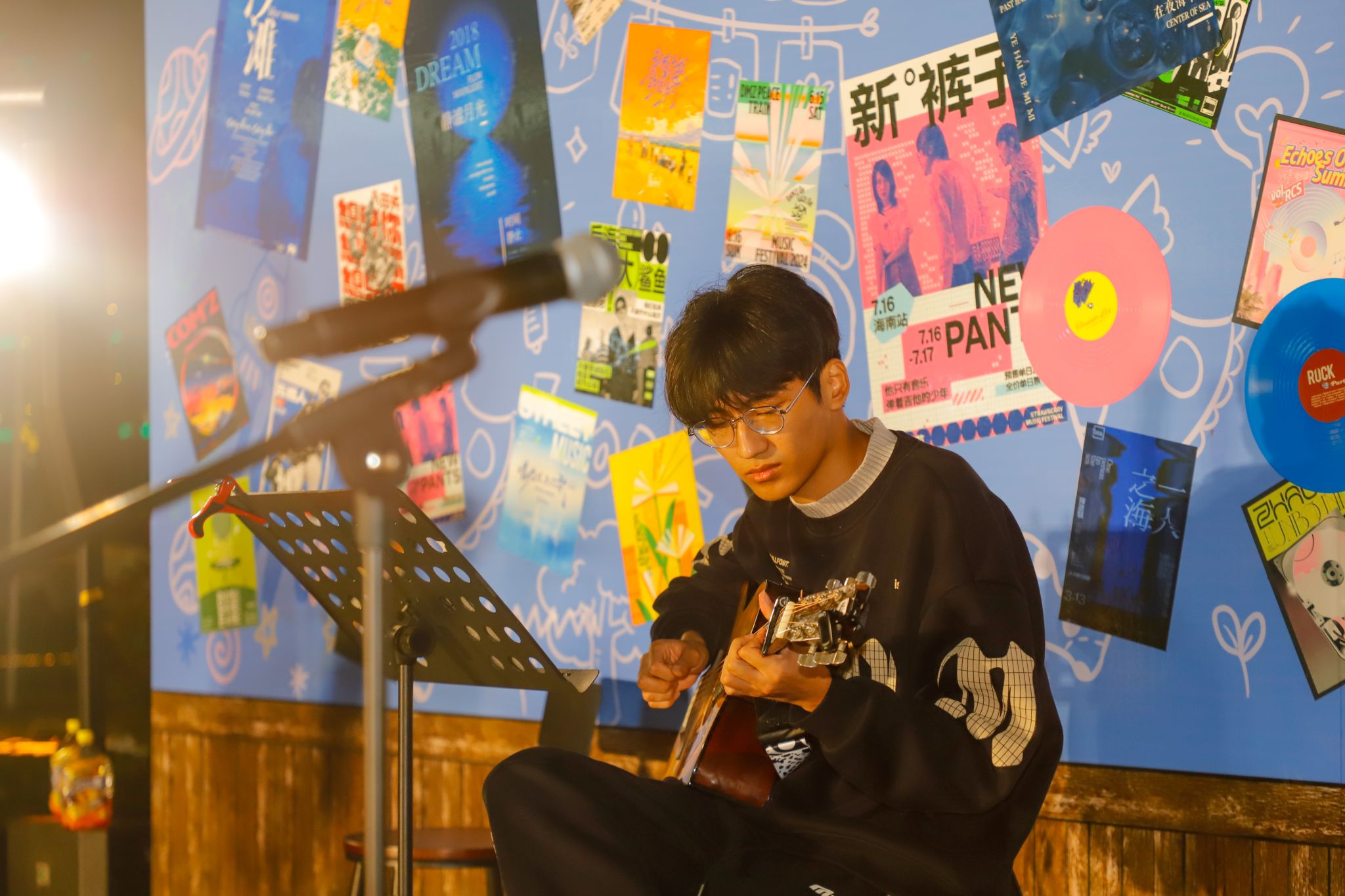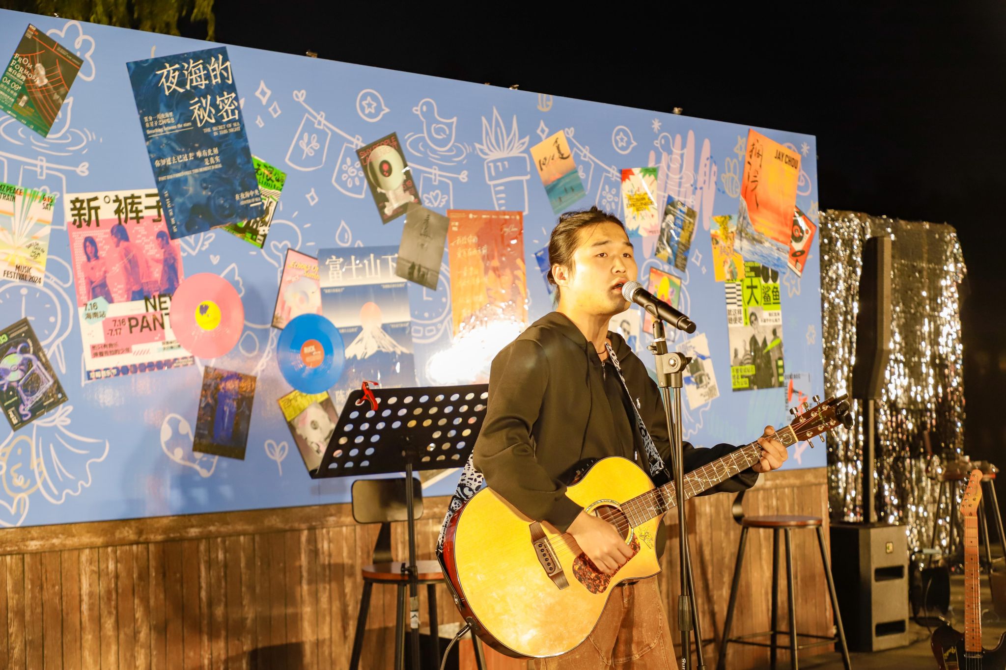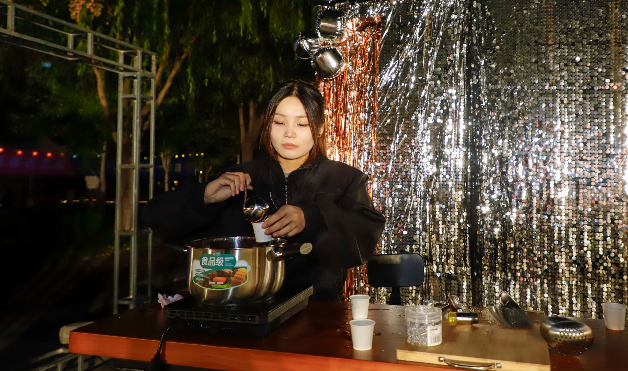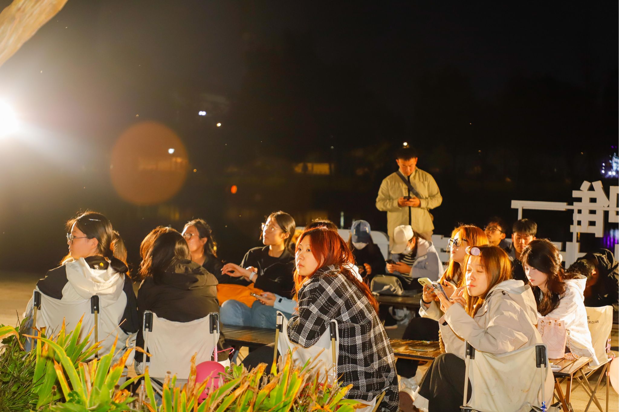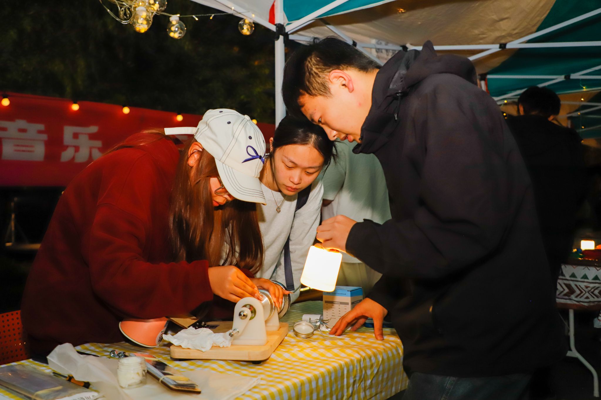 当秋天的晚风拂过发梢,还有什么比在星空下喝着热红酒听一场露天音乐会更浪漫的事?来自“乐燃指上”吉他社的同学们以一首《安河桥》开启了步行街上的第一曲,“我知道那个夏天,就像青春一样回不来”当熟悉的旋律响起,围坐在露营桌旁的同学们齐刷刷挥手跟着轻声哼唱,从慵懒民谣到轻快电子,音符随着晚风流淌,镜湖广场的红蓝光影之下,音乐驻唱成为整个步行街跳动的“心脏”。