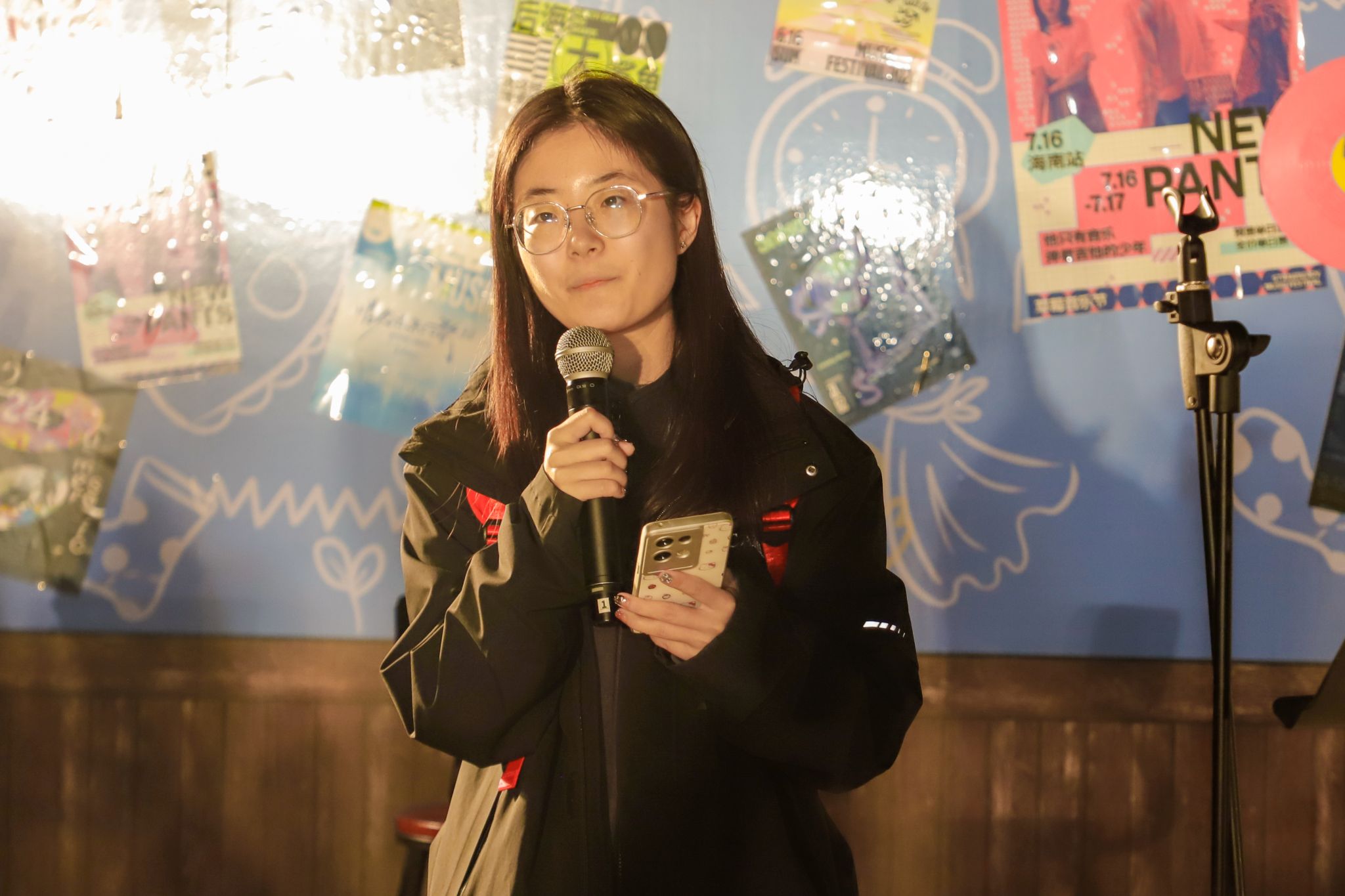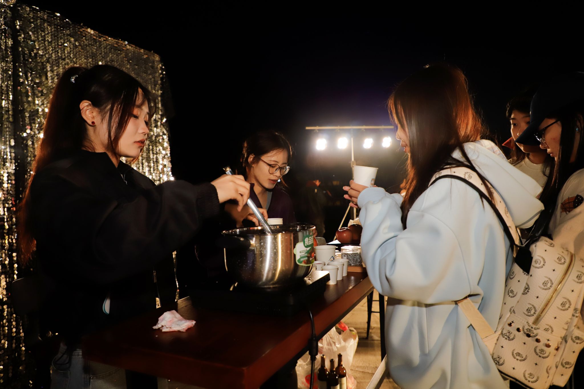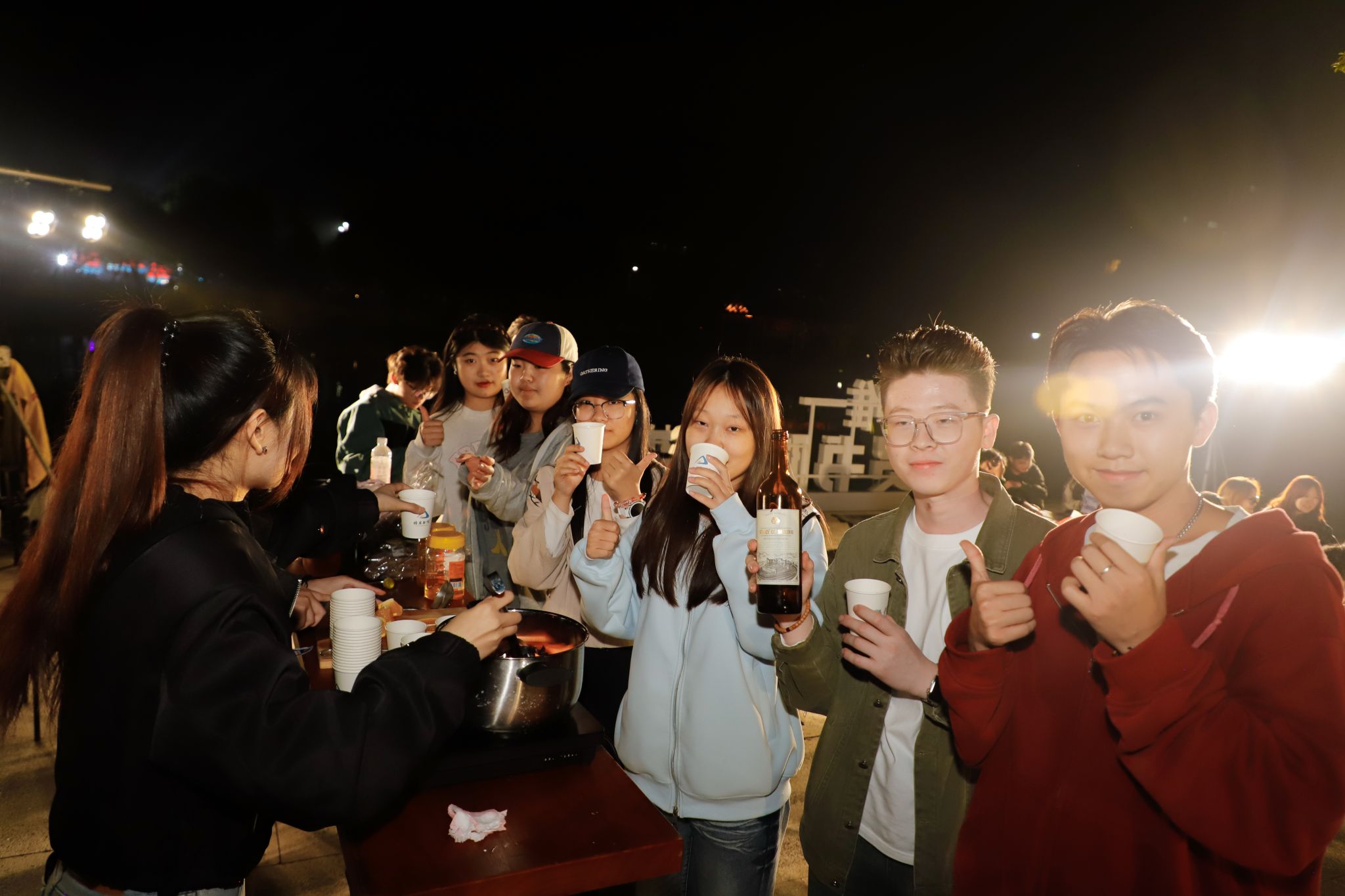 一旁的热红酒咕嘟咕嘟冒泡,同学们在月光下品着红酒,与身旁的朋友们交换着自己的音乐故事。“就是这首歌,高三晚自习回家的路都是这首歌陪伴我。”“这是我最喜欢的歌,我一会儿也要上去唱一首”,来自育英书院/淬炼商学院的许文琦冲上台前带来了一首《至少还有你》。此刻,音乐不再是表演,而是一场集体的回忆与共鸣,歌手也更像是一位用音乐串起故事的朋友,在秋天的夜晚,用歌声诉说故事,治愈每一颗心灵。