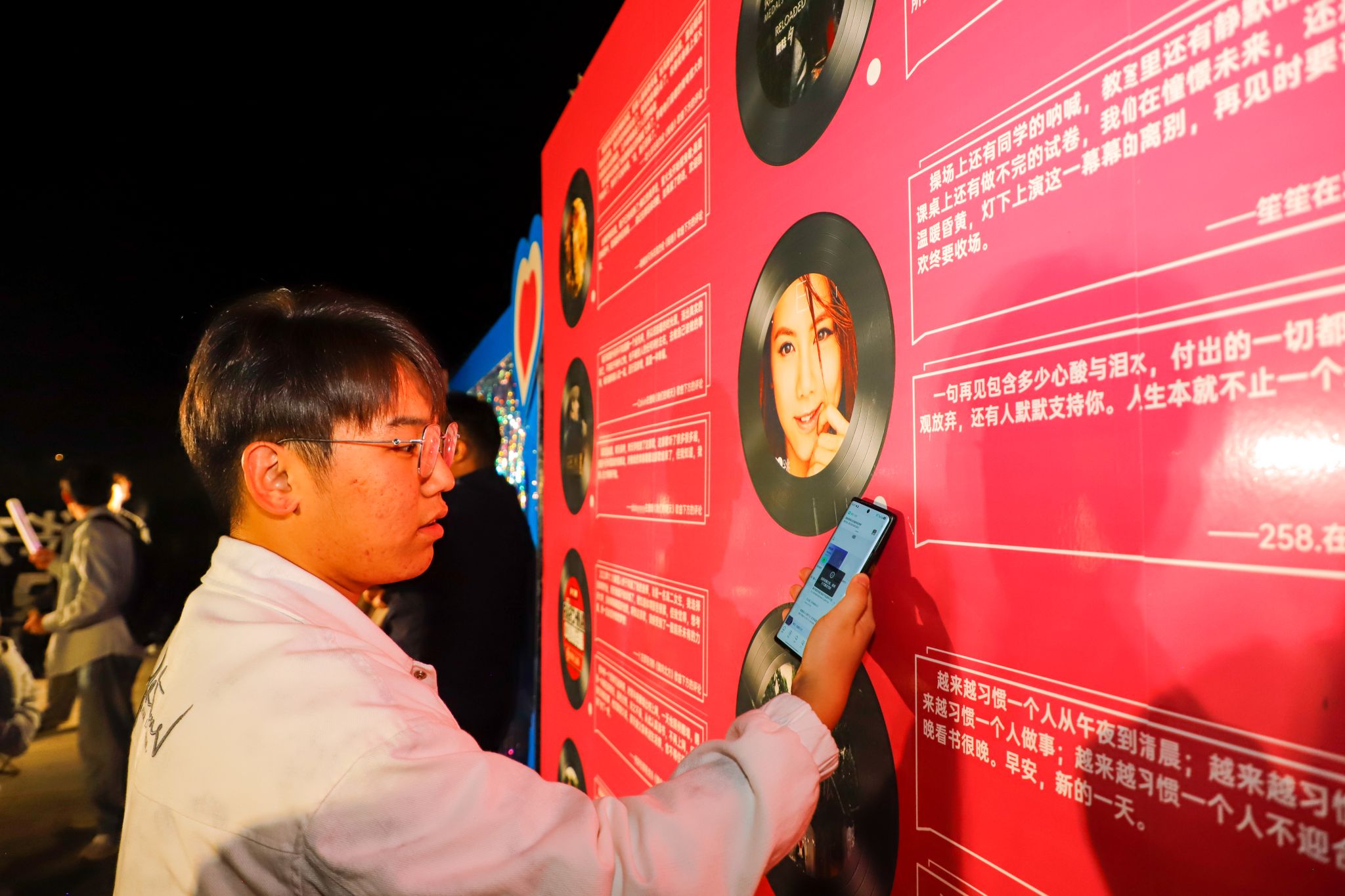 在“声情博物馆”前,音乐从听觉走向视觉,从瞬间定格为永恒。同学们用手机轻触NFC唱片,便可以一键触发关于这首歌的回忆。“现在是凌晨,明天高考,昨天学校放了这首歌,这首歌听了很多很多遍,但是今天听着真的很感动,好像我的青春随着这首歌结束了,但我知道,我的人生才刚刚开始。”“已经去过有风的地方了,那天洱海看日出,一个人坐在码头边上,听着这首歌,吹着清晨的风,看着熙熙攘攘的人群,到太阳从云层中出现。”