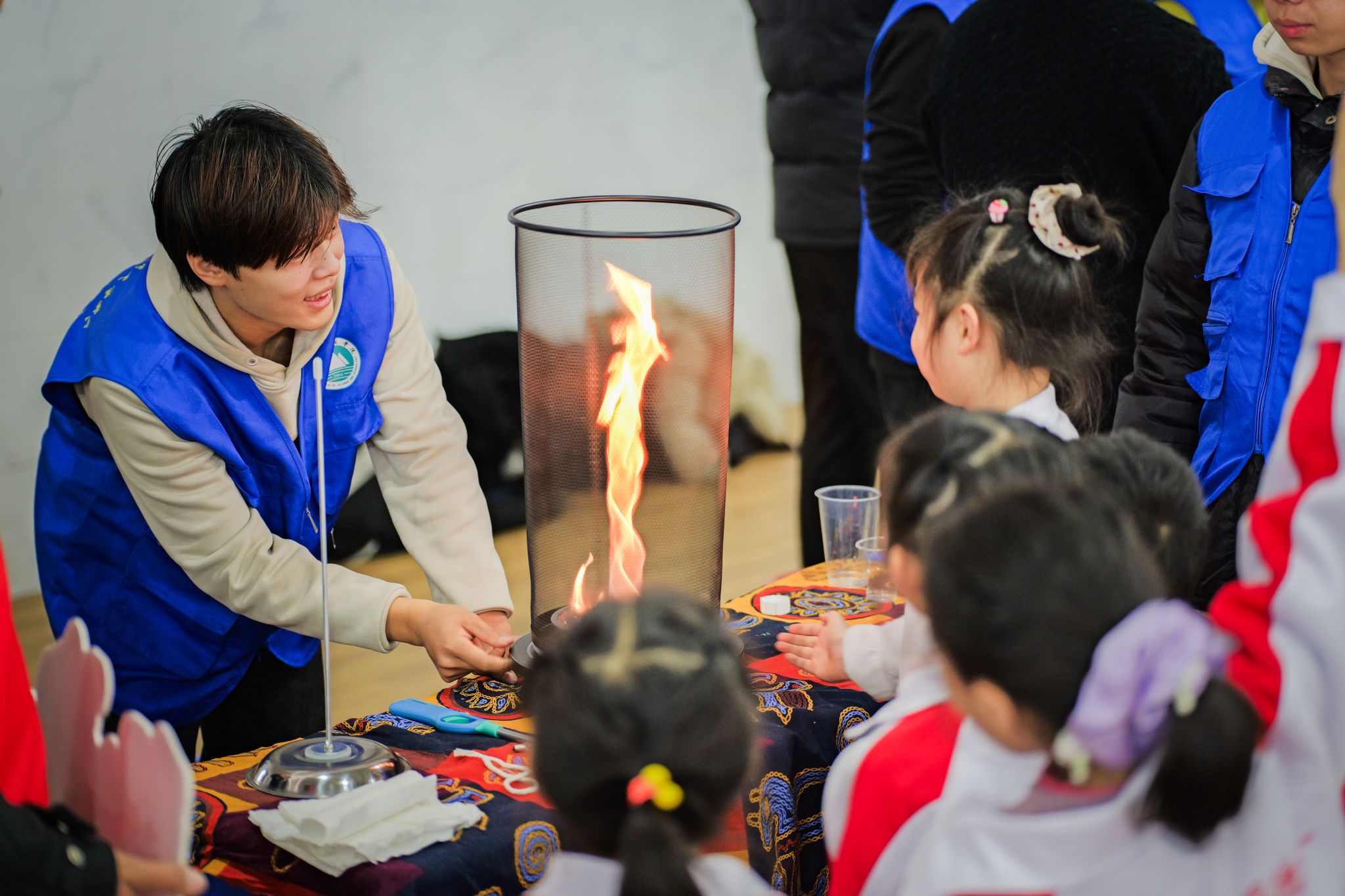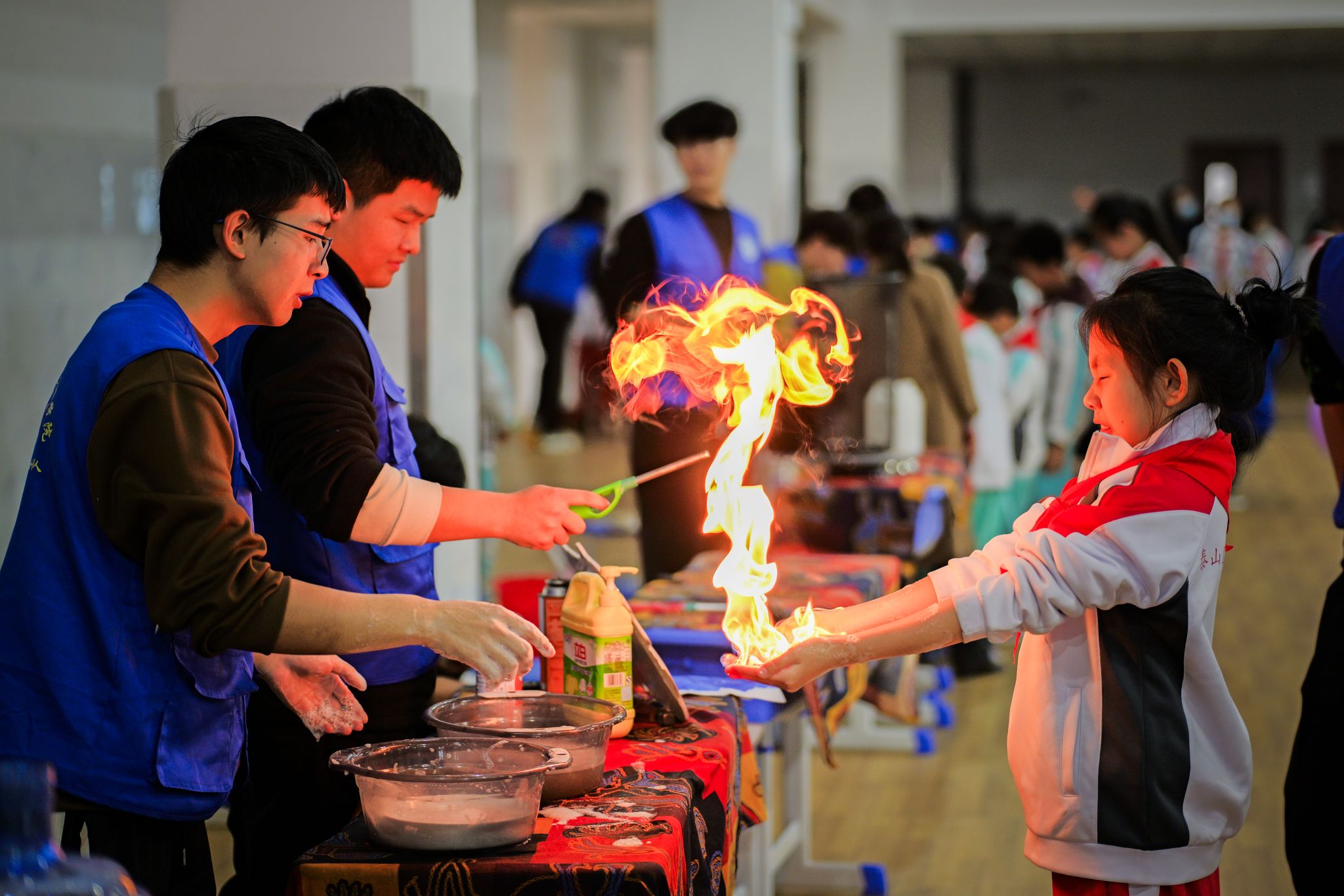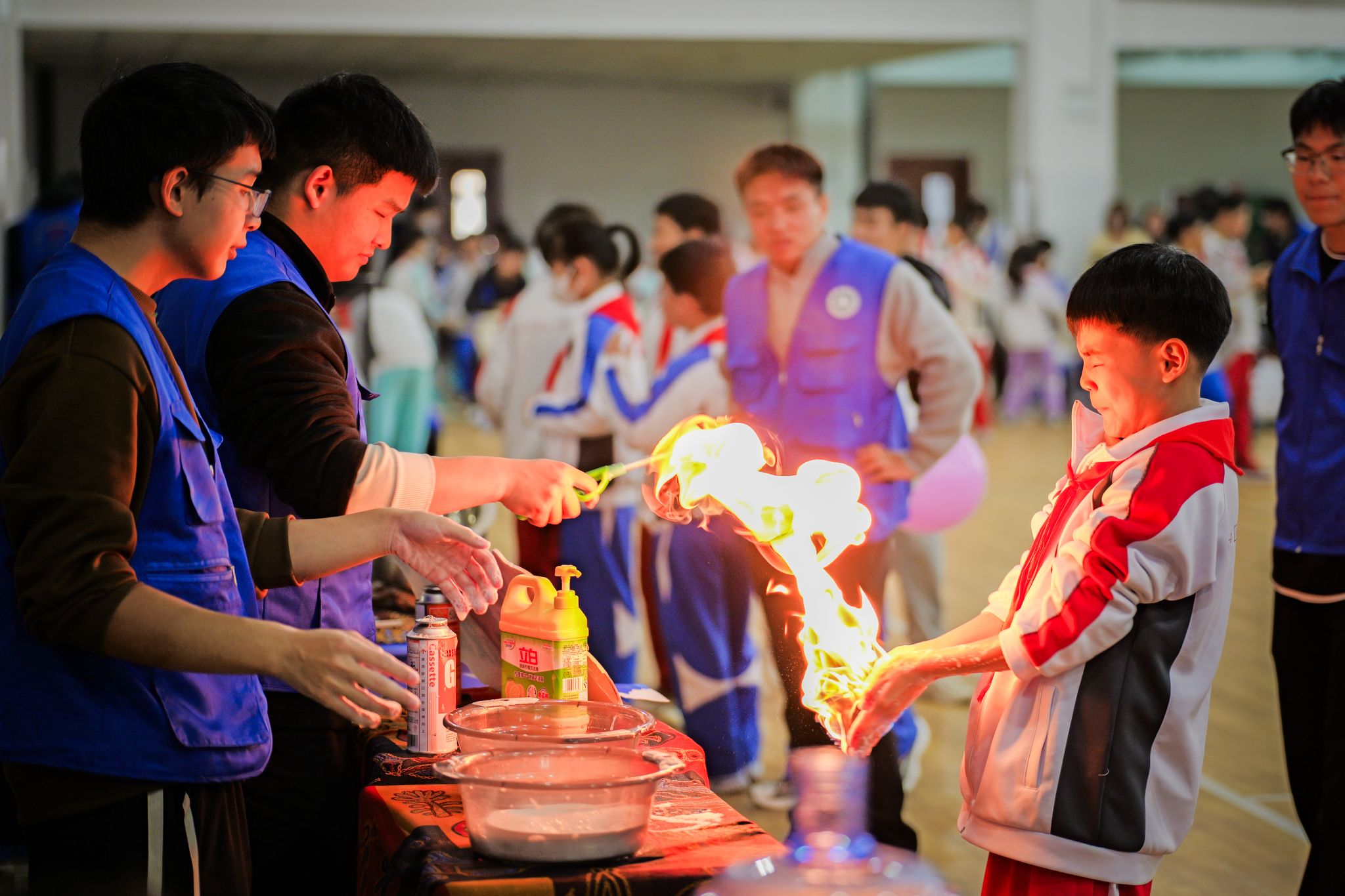 “哇!手掌真的能‘抓’住火焰?”“为什么火苗不会烧伤手呀?”“火焰掌”科学实验区被围得水泄不通,小学生们踮着脚尖、瞪大眼睛,看着志愿者掌心燃起的橙红色火焰,满脸都是惊叹与好奇。志愿者们一边展示安全可控的“火焰掌”实验,一边用趣味比喻讲解科学原理,还手把手指导小朋友们佩戴防护装备、规范操作步骤。当火焰在自己掌心跳跃,清脆的笑声与惊叹声交织,那些对科学的好奇与向往,正随着跳动的火焰悄悄萌芽。