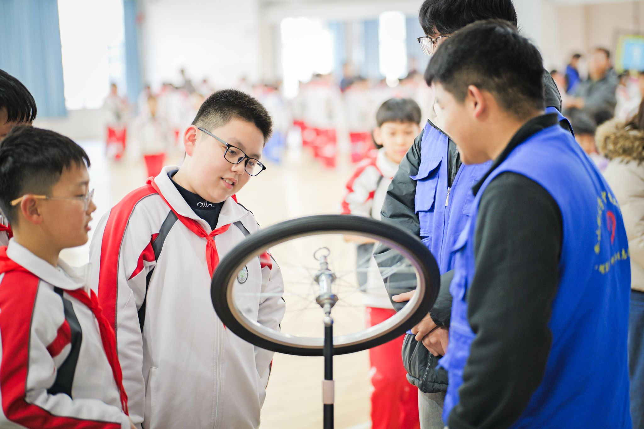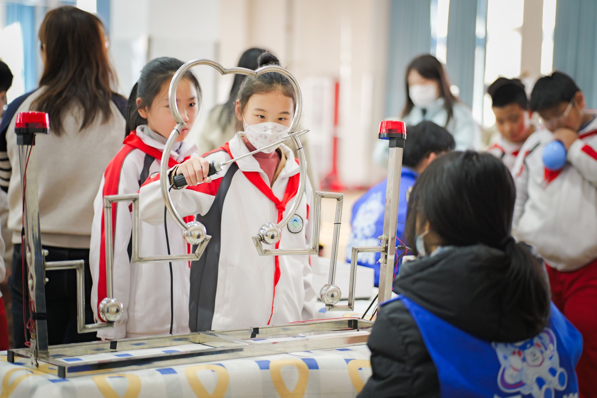 各科普摊位前挤满好奇的小朋友,“龙吸水”的水龙卷奇观引得孩子们连连惊叹。展品区里,大家在志愿者指导下发射“空气烟炮”、操作“电磁枪”、组装电路,小灯泡亮起时,稚嫩脸庞满是自豪。志愿者化身“小小科学家”,以“讲解+实践”模式带孩子们探秘原理,科普展区瞬间成为孩子们的科学探索乐园。