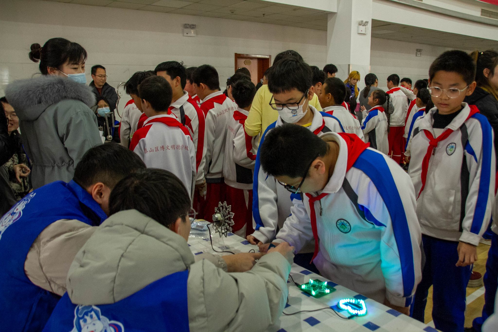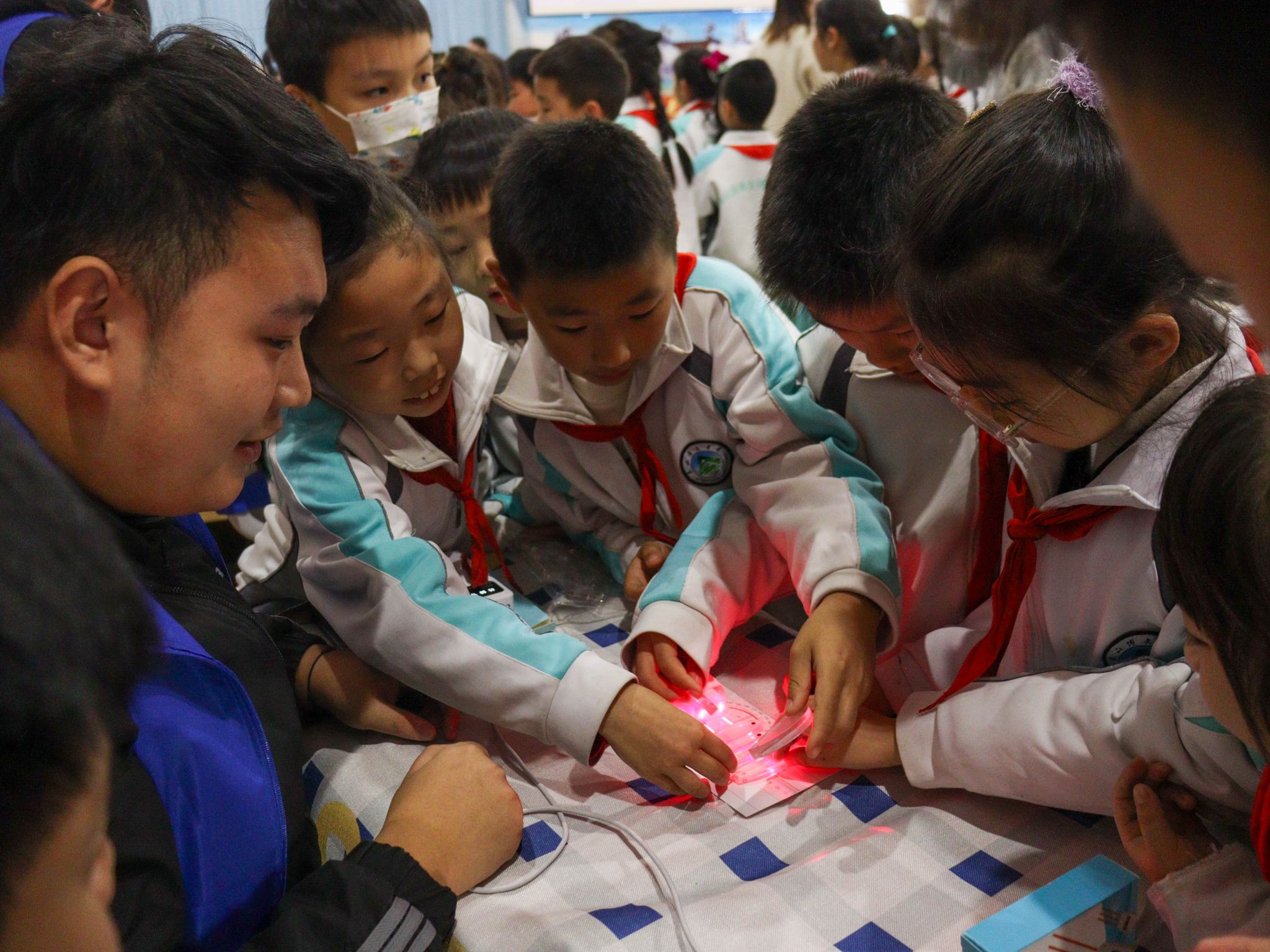 “为什么灯会像水流一样跑起来?”魔幻电路工坊中,小学生们被幻彩流水灯如梦似幻的光效深深吸引,从基础的电流路径,到芯片如何像“交通指挥官”般调度信号,志愿者以游戏的方式揭开奥秘。当亲手搭建的线路第一次成功让LED灯珠依次亮起,成就感瞬间点亮了每一张小脸。在数模创想坊,孩子们与AI语音模型智能体对话,指挥它讲故事、答问题,科学可以如此美丽,而创造美的钥匙,正藏在那一条条被点亮的连接之中。