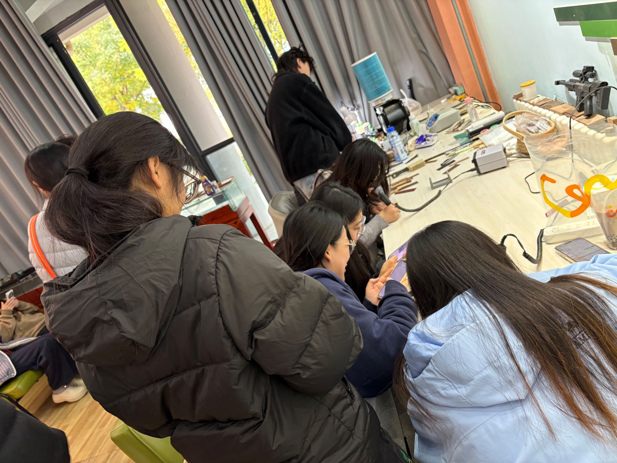 活动全程,来自智能工程学院/育英书院的刘奕辰、大数据学院/育英书院吴伟康与大数据学院/海右书院的王晨璐三位同学穿梭在参与者之间,协助分发工具、解答疑问,确保活动有序推进。1个半小时的创作中,工坊内时而传来工具轻敲木料的细微声响,时而响起参与者交流创意的轻声讨论。当一件件带着手工温度的书签完成时,参与者们纷纷拍照留念,分享创作心得。