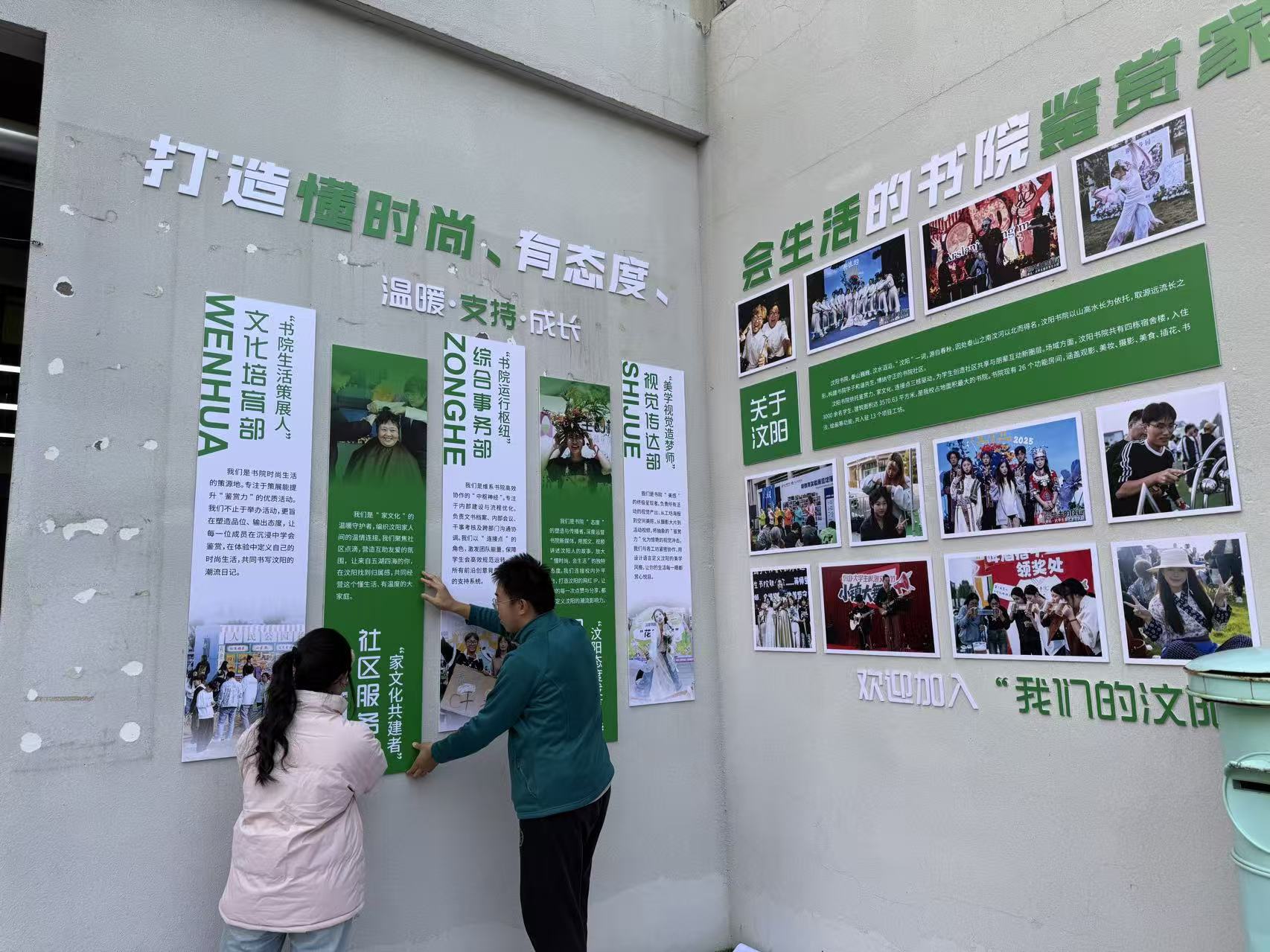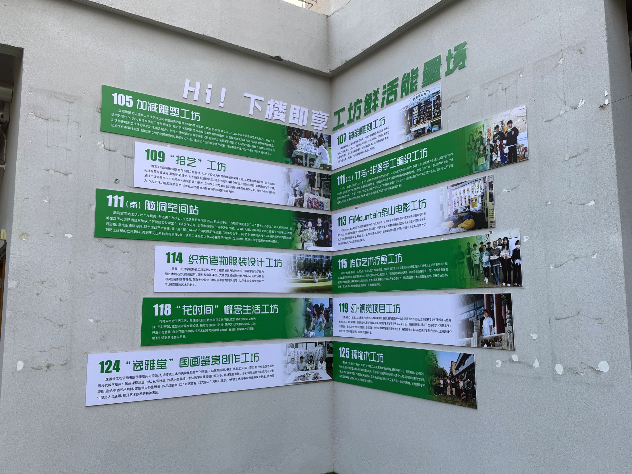 步入撷阳庭院,宣传物品焕然一新,特色品牌活动如汶阳书院“啤酒文化节”等跃然眼前,不仅彰显了汶阳书院懂时尚、会生活的独特气质,更传递出培养审美与情趣并重的书院鉴赏家的教育理念。同时,所有工坊的介绍与活动信息在此汇聚,为师生搭建起便捷的参与平台。