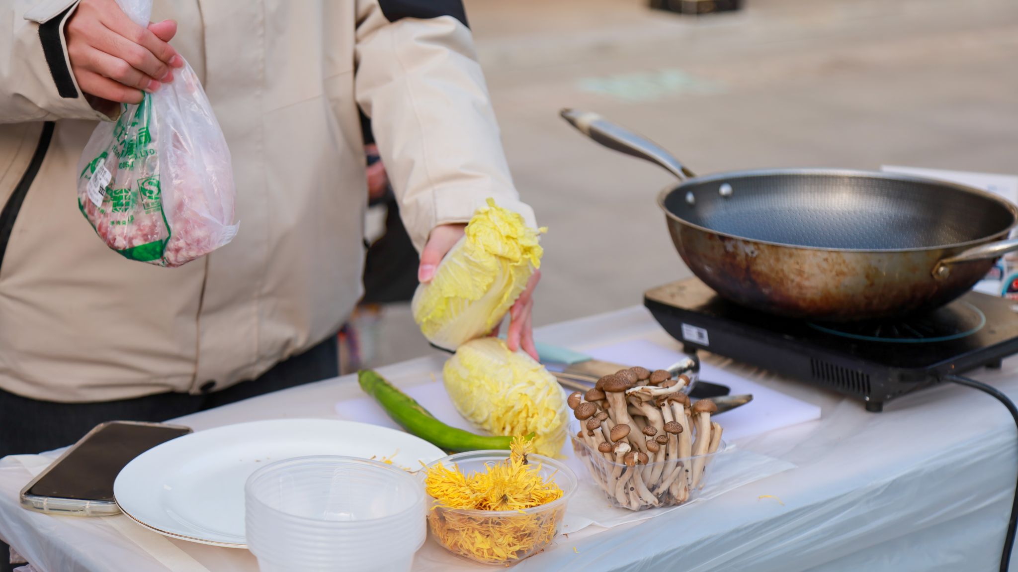"厨动花间" 烹饪比拼环节将活动推向高潮。各部门团队需在 40 分钟内完成一道 "花主题" 菜品,不仅要口味出众,还要在命名、摆盘上融入花意象,并附上包含食材、花语寓意的创作说明卡。烹饪过程中,大家分工明确、默契配合,切配、炒制、摆盘有条不紊,拾光庭院内烟火缭绕,欢声笑语不断。"我们队特意选用了菊花和虾仁搭配,取名 ' 菊韵鲜姿 ',既契合花主题,又寓意团队清新向上、团结协作",文化培育部门(智能工程学院/汶阳书院)刘奥介绍道。