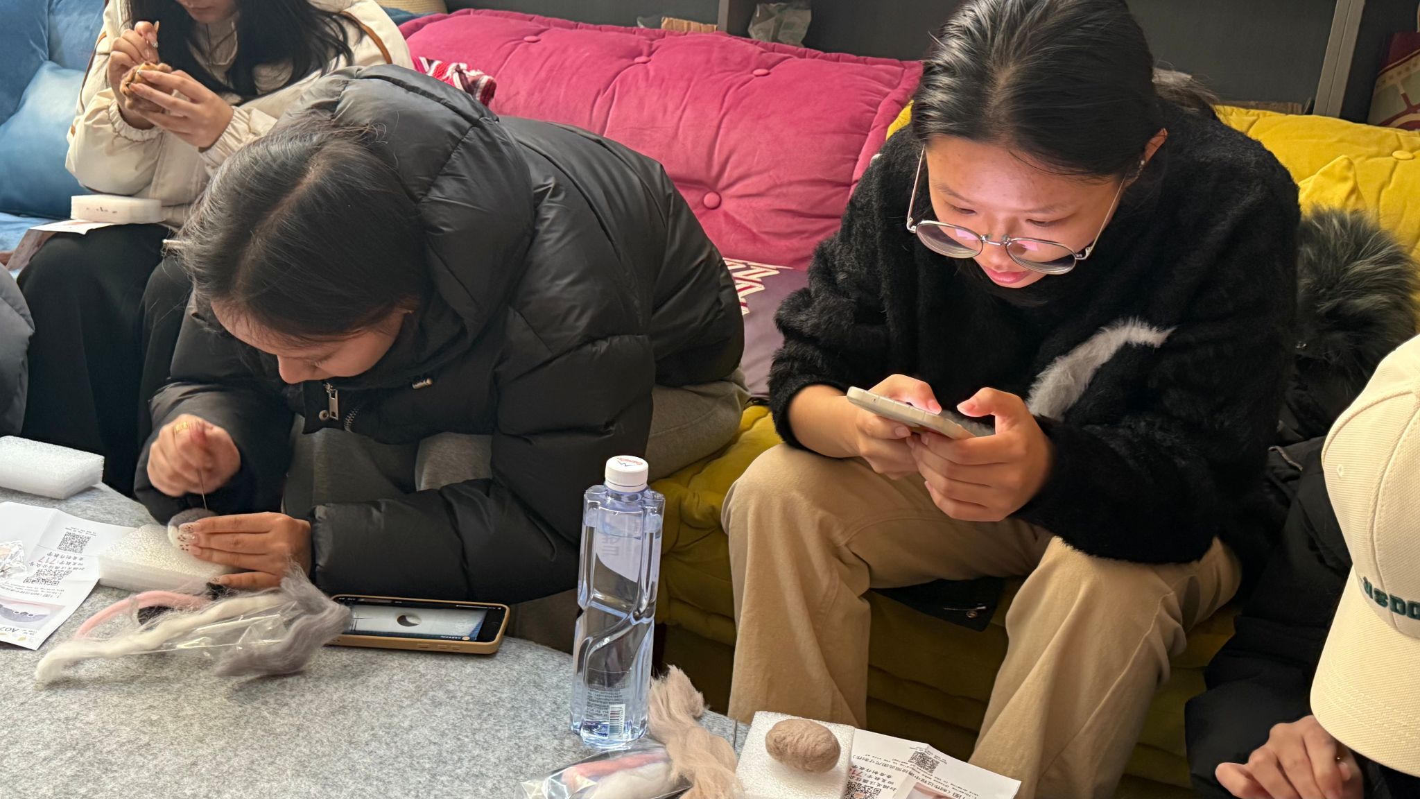时间悄然流淌,桌前原本陌生的面孔渐渐熟络起来。有人凑近邻座请教针法,有人举着半成品会心一笑,轻声交流着各自的设计灵感。空气中弥漫着专注而温暖的氛围,创作让彼此的距离在指尖的每一次起落间悄然拉近。