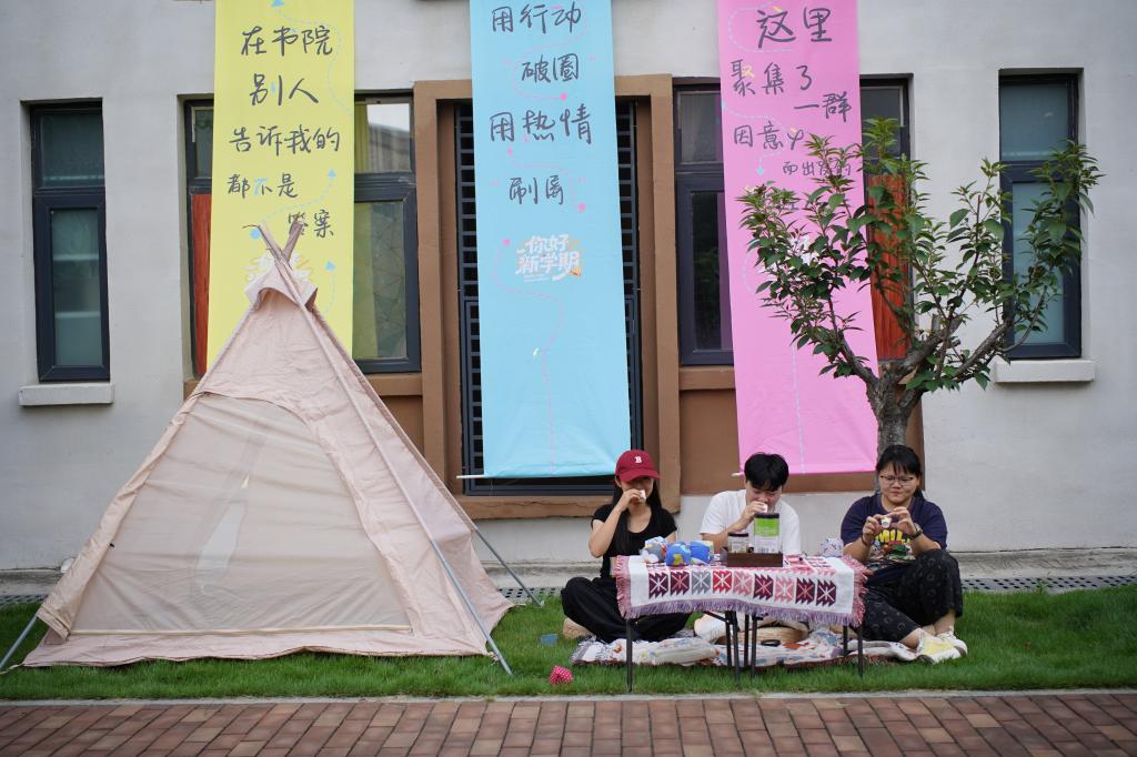 白色帐篷下,墨香与思索悄然流淌。此处以“书写与共享”为核,新生们提笔记录初入大学的悸动与迷茫,再将纸页悬挂于绳上,与他人文字相遇。一段关于乡愁的独白可能遇见另一份对未来的畅想,孤独在此消融,共鸣于此生长。帐篷一角缀满彩笺,如秋日枝头繁花——这是个体声音汇成集体合唱的隐喻,完美呼应“一个人到达,一群人出发”的深层哲学:孤独的旅程终将走向共行的远征。