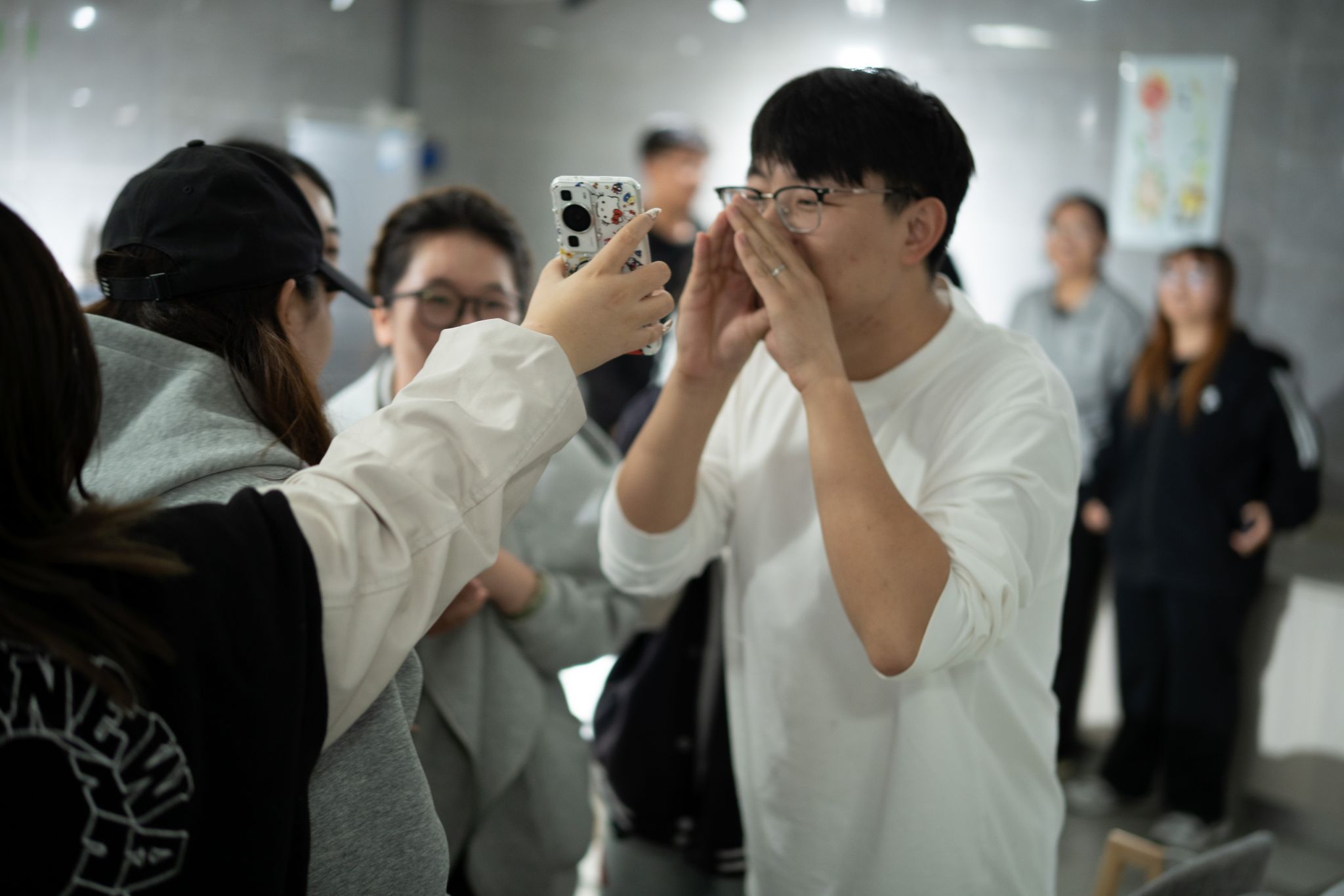 活动开始,学生会成员们在红色决策展览馆环绕成一个圈,由五汶书院学生会主席葛岳率先开腔自我介绍:“大家好!我叫葛岳,大家以后工作和生活上遇到困难都可以来找我谈心哦!”开始,后续同学们需复述前所有人的姓名并接龙。当王宇强同学因紧张卡壳时,当场表演了纯正南方口音的“英文自我介绍”,引得全场捧腹,当最后话筒传递到李文童老师处时李文童老师准确无误地喊出了学生会每一名新老成员的姓名时候,全场爆发出了热烈的掌声。这个小游戏像一把钥匙,“咔嗒”一声打开了初见时的拘谨,新老成员间的交流声慢慢热络起来的。