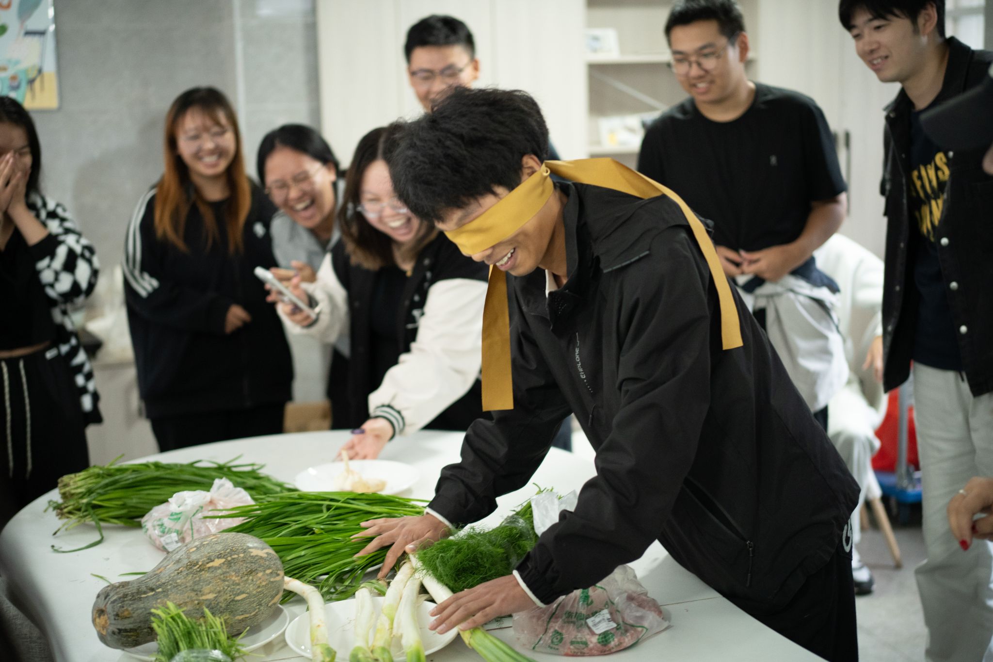 移步轻食厨房,蒙眼布下的指尖小心翼翼地游走于茴香、大蒜、韭菜、南瓜、生姜等食材之间,有人误将茴香认作韭菜惹起哄笑,有人却精准摸出目标食材引得喝彩。“饺香传默契,团队共一心”“一捏一擀聚合力,一包一合暖人心”在“分贝”挑战中,每个小队的口号回荡在轻食厨房,连天花板都震得微微发颤。