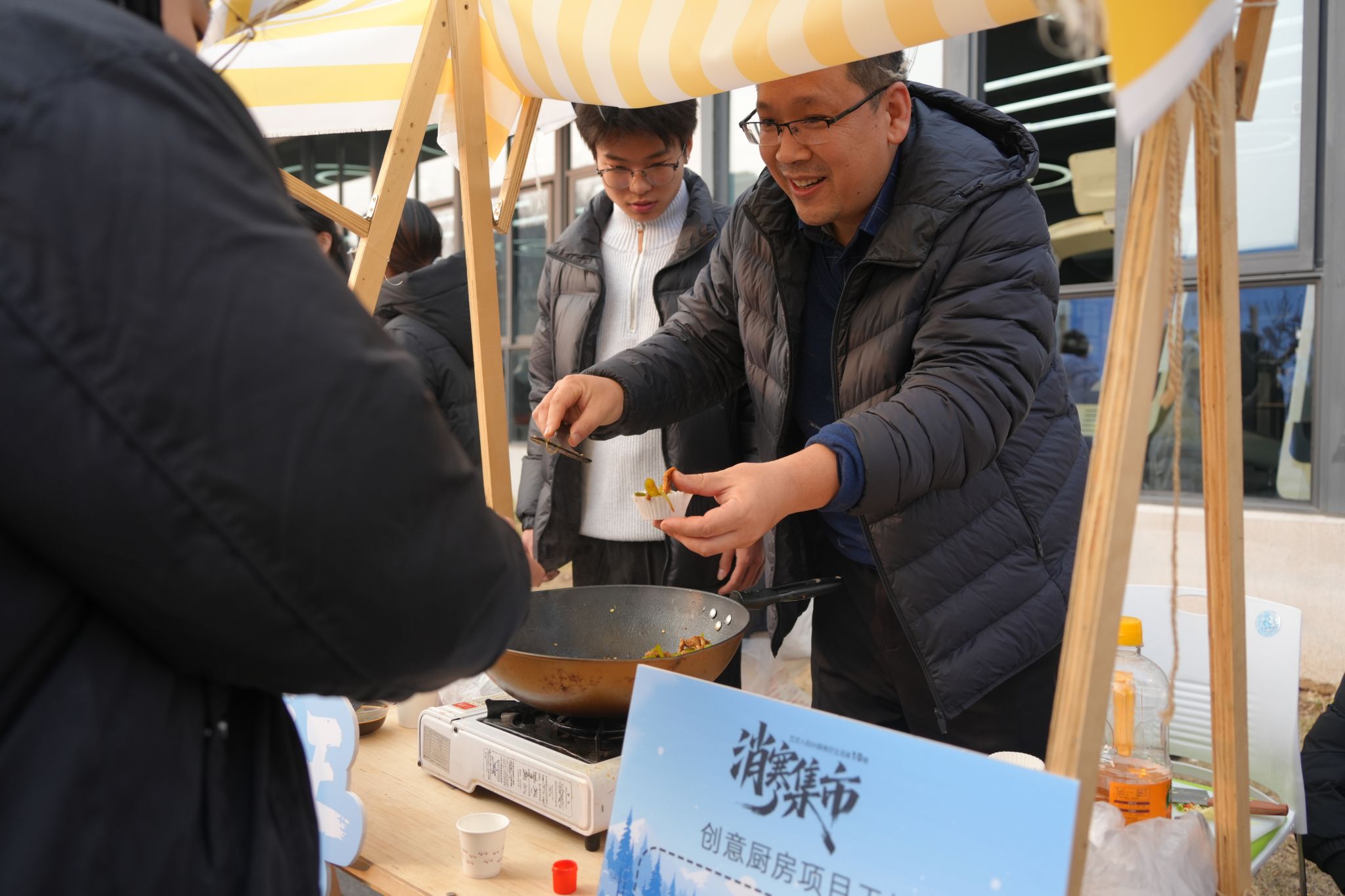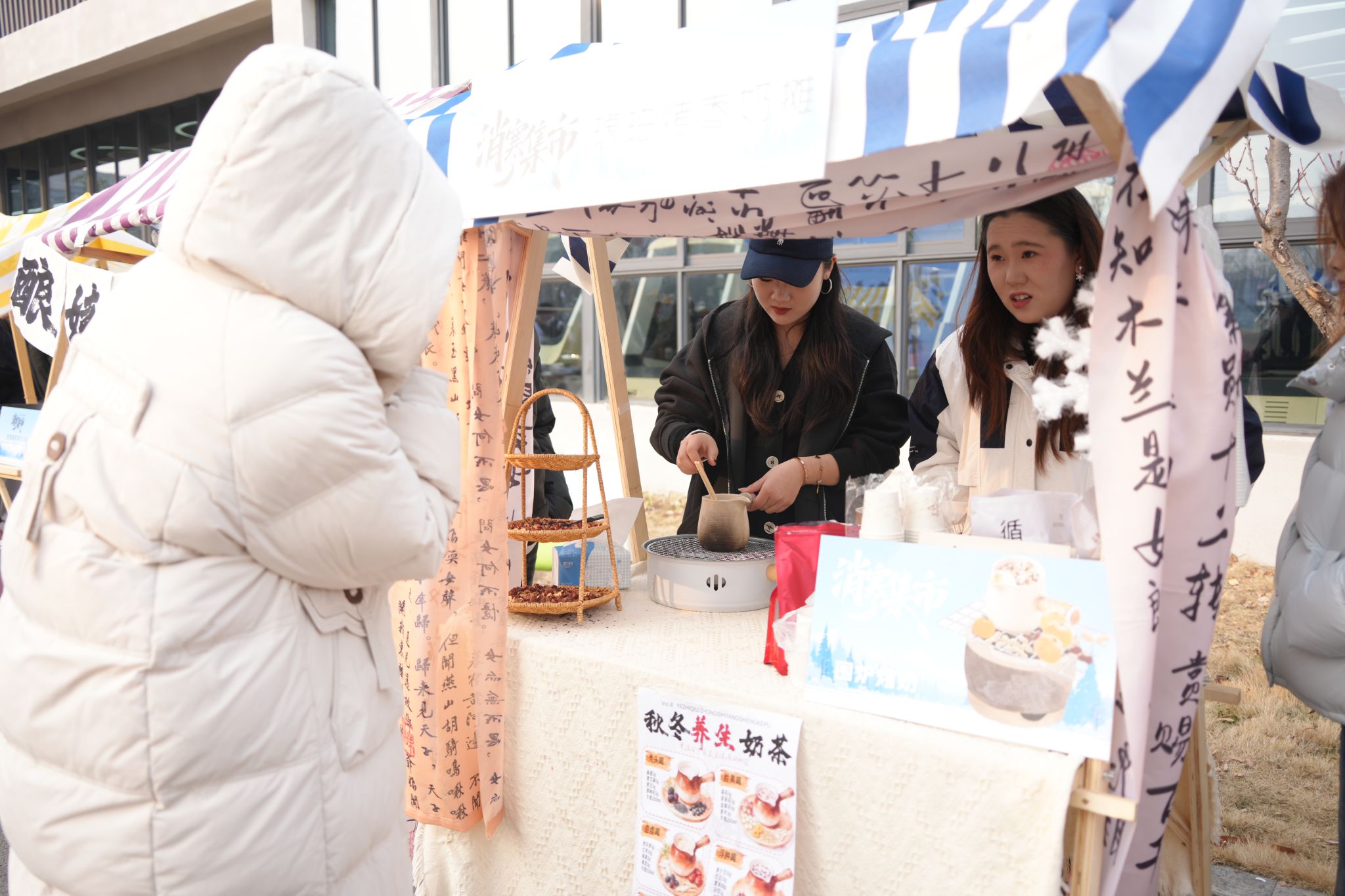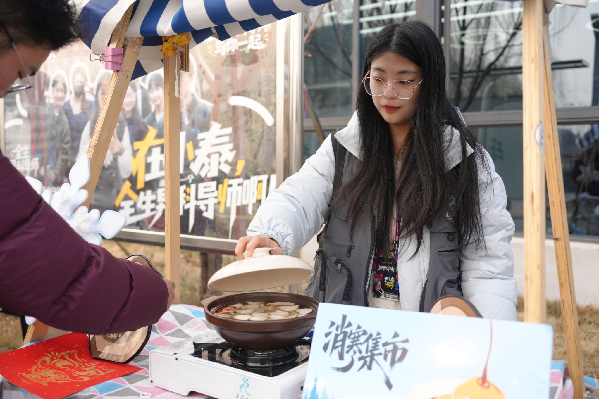 “新鲜的饺子出锅咯!”“孃孃的食肆”里,冬至限定水饺鲜香扑鼻,一个个饱满的饺子裹着馅料,咬下一口汁水四溢,不仅驱散了冬日寒凉,更藏着幸福美满的真挚期许。“玉露凝香铺”的甘蔗雪梨汤清甜润燥,慢火熬煮间,将滋润与暖意融入汤汁,一口下肚,温润回甘,伴同学们度过冬日寒夜。