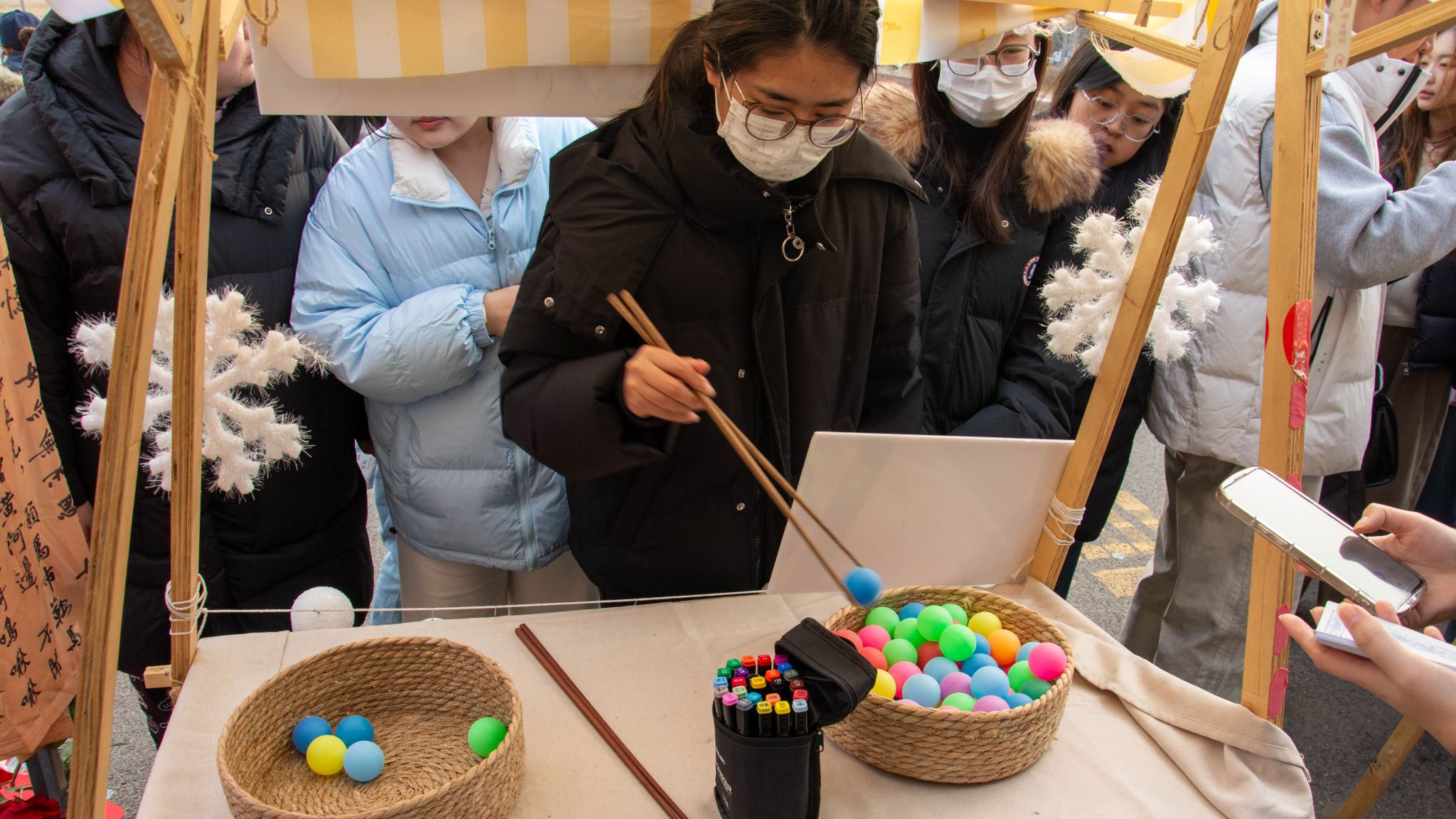 “秀才的诗集坊”内,卡纸、彩笔与古风贴纸齐备,参与者们以“诗画同源”为核,将“冬至大如年”的俗谚、围炉煮酒的雅兴融入手账,亲手书写专属冬至诗句、绘制节气图画,让每一本手账都成为兼具文学性与纪念意义的文化载体。“寒日拾玉丸”摊位则热闹非凡,“夹乒竞巧”考验手眼协调,参与者执筷稳运乒乓球,屏气凝神间欢笑不断;通关后便能解锁“乒圆绘艺”,以乒乓球为“汤圆”,绘上饺子、团纹、冬日梅枝等元素,让团圆期许凝于指尖。
