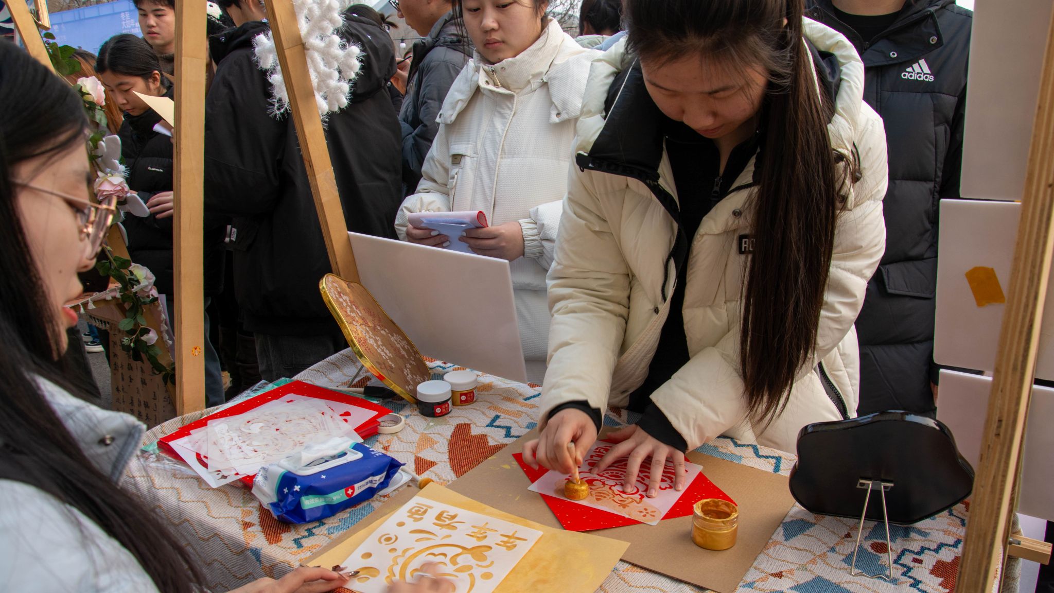 “岁华福笺坊”摊位以传统拓印工艺复刻古意福字,一笔一纸皆蕴四时之美,参与者们亲手拓印,将岁月的温度与满满的祝福带回家中。“墨韵时序馆”内,大家手绘九九消寒图,笔落间藏着节气智慧,在一笔一画的等待中,沉浸式体验传统习俗,静静期盼春归。