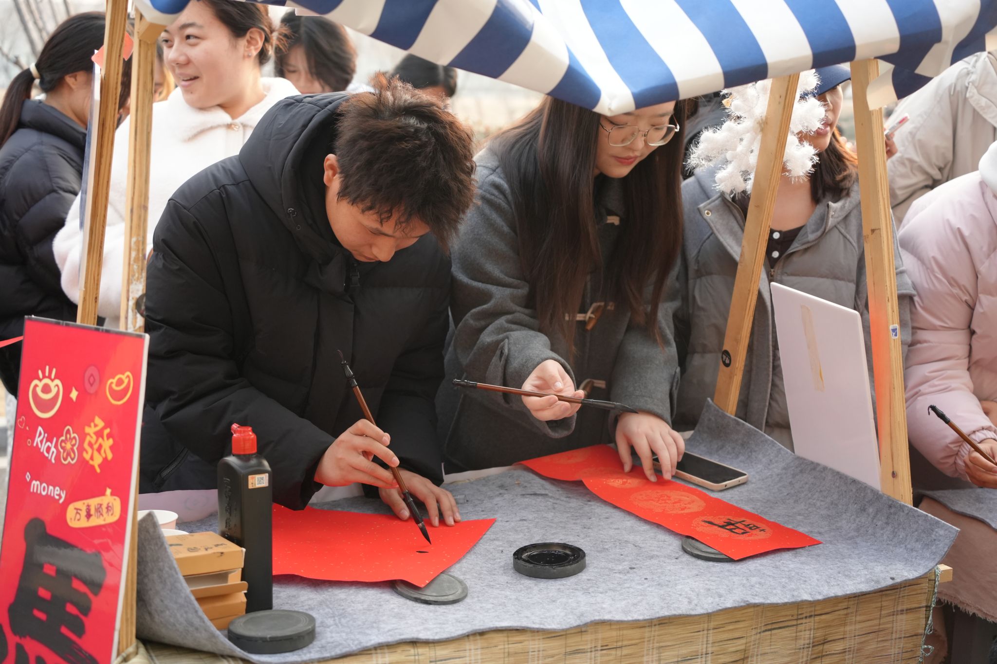 “汶水书春阁”墨香氤氲,提前开启“贴年红”的传统。参与者们纷纷执毫泼墨:“五汶春早”“岁稔年丰”等联句跃然纸上;参与者们或伏案学书,或求字祈福,将对新春的美好期许凝于笔墨,让冬阳下的书香愈发醇厚。