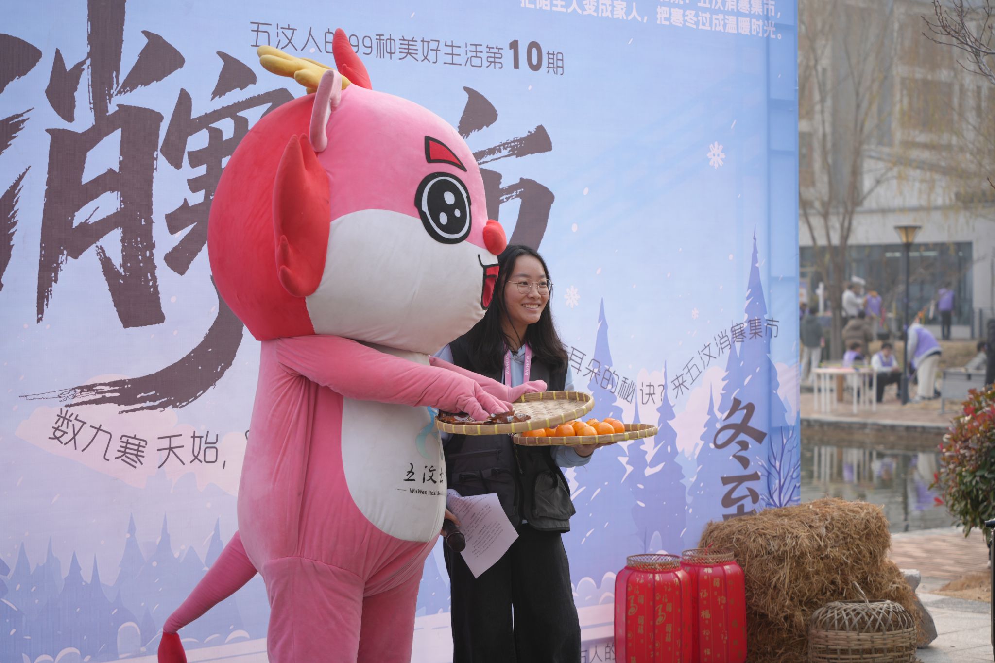 集市启动仪式上,随着五汶书院吉祥物“龙仔”玩偶惊喜登场,现场参与者们积极争抢着龙仔为大家派送的“团圆福气”的大福、寓意“吉祥如意”的橘子,瞬间点燃了冬日里的书院社区温度,随后,主持人上台为大家讲解了活动规则,正式宣告消寒集市开启!
