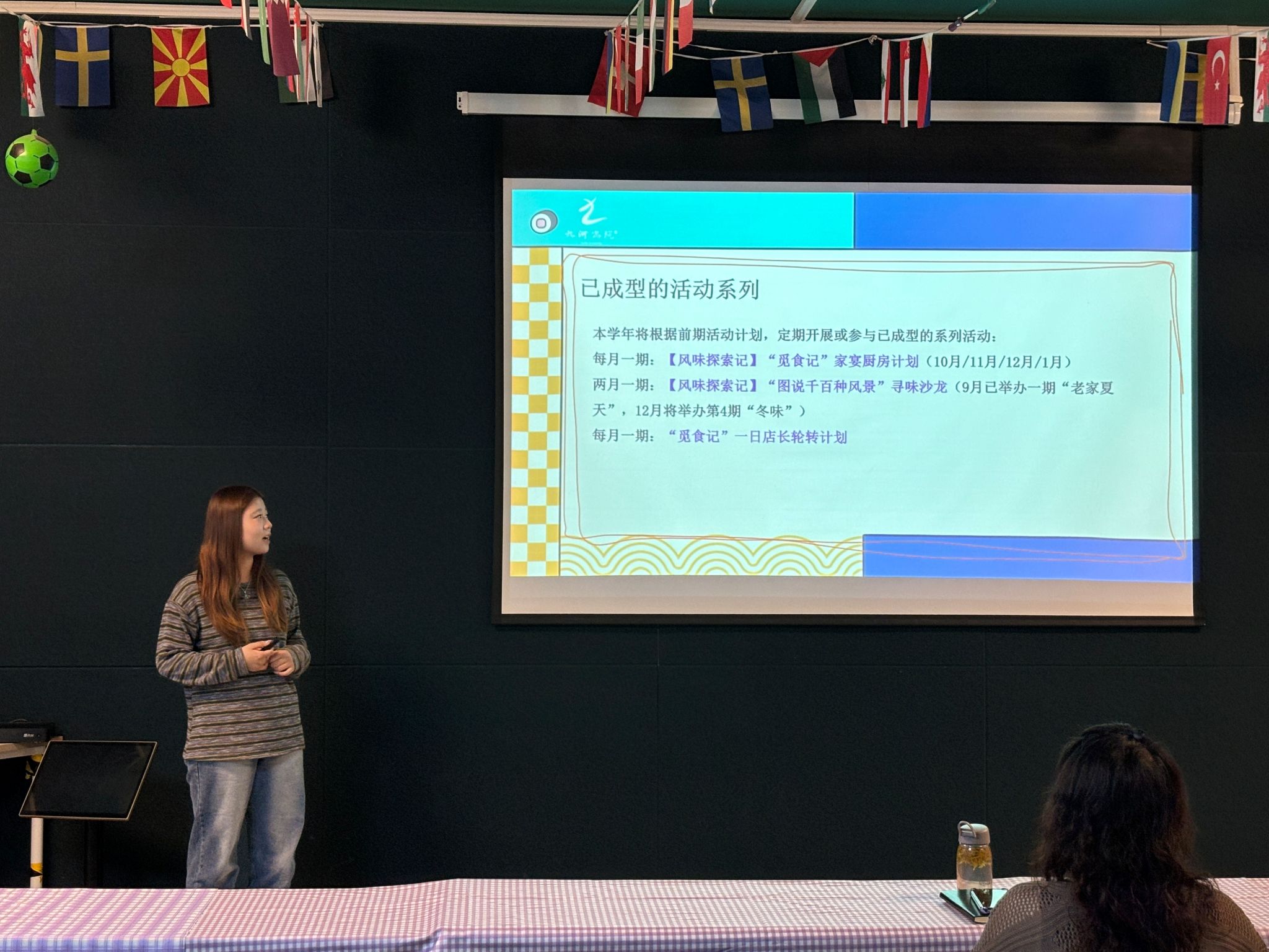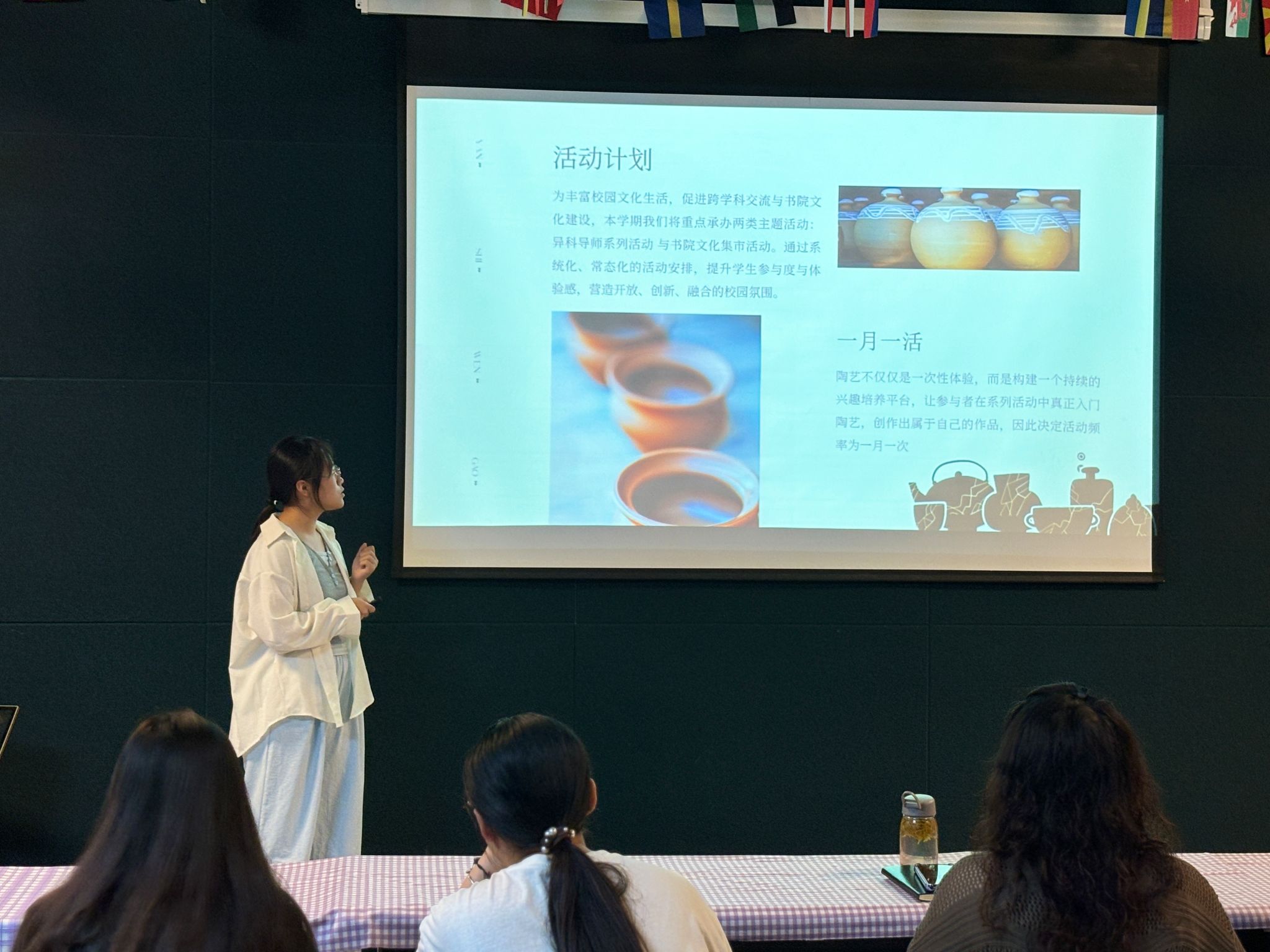 活动伊始,先由来自九河书院的发展导师贾方雷老师用幽默风趣语言介绍本次活动的主要目的,随后工坊成员们便开启了热烈的交流模式,迫不及待地分享着往年趣事和创新想法。扭动无限手作工坊主理人郝艳芝老师指出了团队目标:完成纳新,构建一个结构合理、技能互补的团队,确保新成员快速融入。智慧DIY陶艺工坊主理人李欣怡(海右书院/智能工程学院)计划:本学期将重点承办两类主题活动:异科导师系列活动与书院文化集市活动。“叁六零”职业体验工坊主理人孙温馨(海右书院/智能工程学院):我们将定位新学年新生体验角度,融合书院文化和大学生实践,全面提升同学们的职业探索力;“觅食记”美食探店工坊主理人程亚迪(五汶书院/艺术传媒学院)分享了计划活动【风味探索记】“觅食记”家宴厨房计划、【风味探索记】“图说千百种风景”寻味沙龙等;自然“卷”生态探索工坊主理人李程坤(敢当书院/智能工程学院)回顾上阶段活动成效总结道:我们会逐渐将未来的活动创新化,会融入多种元素让活动内容更加丰富多彩。黄河音波雅韵工坊主理人郭中月(育英书院/智能工程学院)我们工坊聚焦经典影视配音,诗朗诵等优质音频内容,声味融合作为我们的创新亮点,在配音视频平台挂载奶茶优惠链接以做到IP影响力的扩散;“探”生活文艺手作工坊主理人刘浴霖(五汶书院/大数据学院):在快节奏的校园生活中,我们倡导一种“慢生活”哲学,手作是与我生活对话的过程;飞跃篮球项目工坊主理人张恒志(敢当书院/智能工程学院):新学期篮球项目工坊旨在夯实基础、提升能力、积极参赛、凝聚团队,通过系统招新、训练与赛事参与,强化队员综合实力,力争在校园赛事中取得优异成绩。