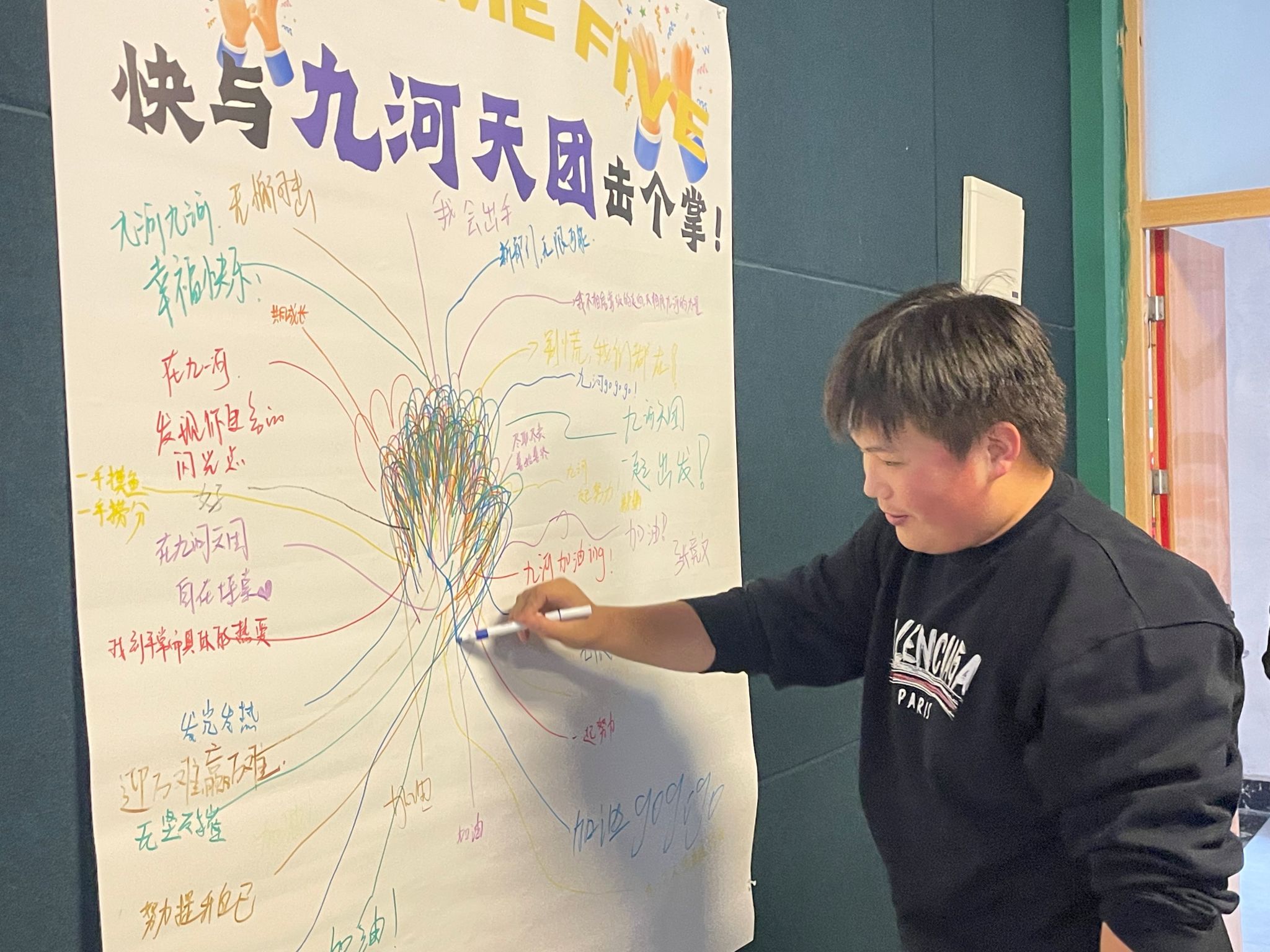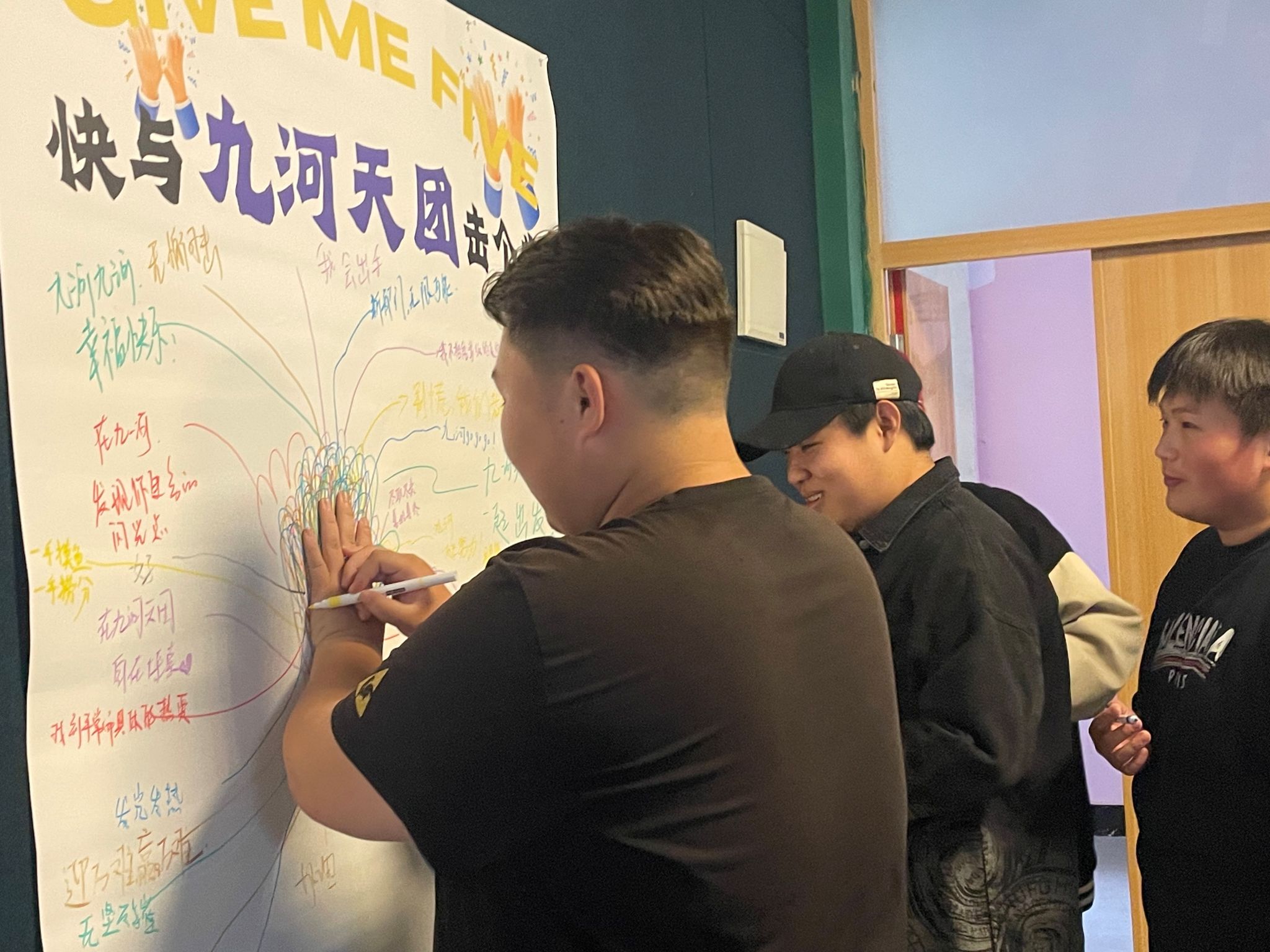 如果说有什么环节能让整场见面会“封神”,那一定是“击掌互动”。每个人在纸上描下自己的手掌轮廓,并写下一句真心话。九河书院/智能工程学院庞浩泽写下“我会出手!”霸气十足;九河书院/大数据学院满泉岐留下“尽职尽责,善始善终”,沉稳坚定;主席郑齐原则写下“别慌,我们都在”,成为所有人安心的后盾。一只只手掌,连成一片星辰;一句句心声,汇成一条暖河。陌生,在此刻消融;团队,从此刻开始成型。