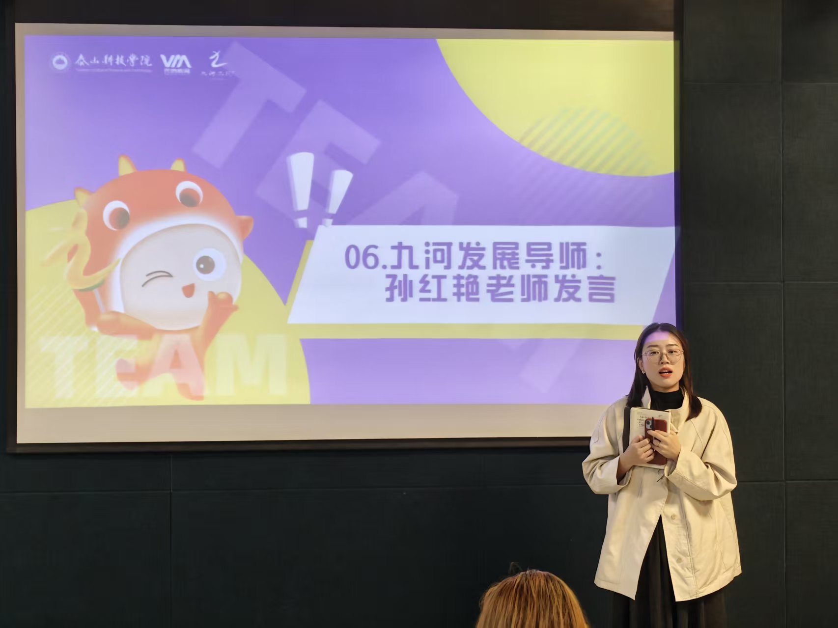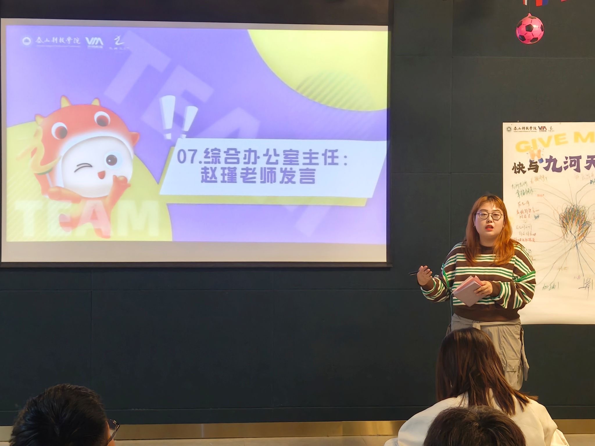活动最后,九河书院发展导师孙红艳、贾方雷,分别介绍了书院领导力板块相关活动课程,家文化板块相关重点活动。九河书院发展导师孙红艳以鼓励新成员在精神探索与大咖阅读计划中寻找榜样、主动成长。九河书院综合办公室主任赵瑾老师则从书院的文化根基讲起,拆解了“四位导师+四重探索+四季家宴”的书院运行密码,她强调书院不同于传统学生组织,书院的学生组织工作更多是围绕“活动”为核心,以“活动”为实践课堂,要用心去感受新团队的不一样;同时要尽快完成学生干事、干部的角色转换,明确自己在团队中的新责任;更要有长远目标,放手去做,相信自己会收获新成长。