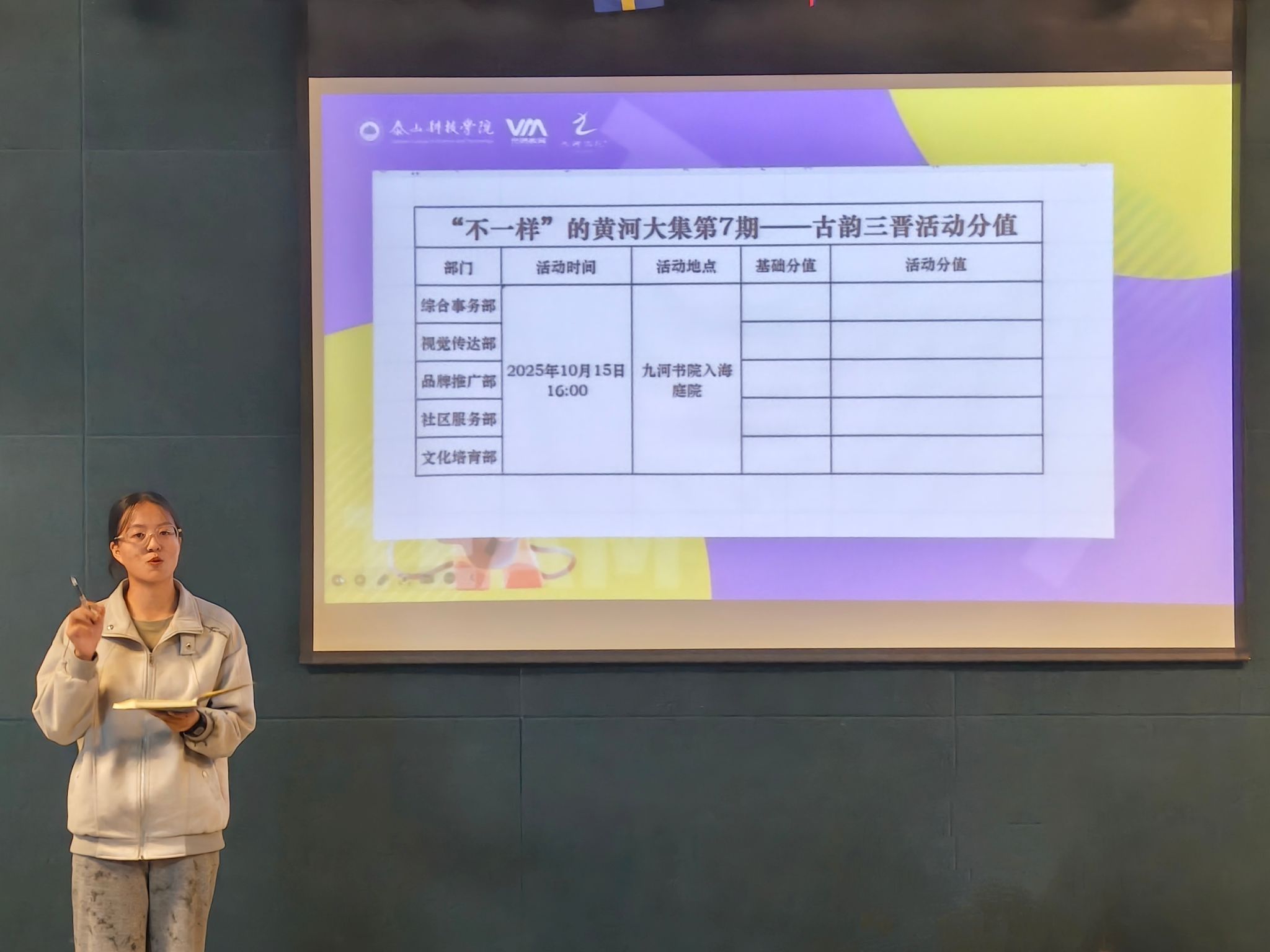 当双节假期结束,同学们从远方的小家回到书院大家庭,新的故事已悄然埋下伏笔。杨双双老师以一句“欢迎回家”点燃全场,她细数九月硕果,感谢每一位成员的付出,并发布十月“行动指南”:四重探索力课程将由各部门分头领航,目标不仅是“办好活动”,更是“让每个人被看见、能成长、有温暖”。她首次揭晓“部门学期PK制”——基础分+活动加分,鼓励团队在协作中良性竞争,在实战中磨砺能力。“愿你们走出九河时,皆已成为敢担当、有力量的自己。”话音落下,新成员眼中已有星光闪烁。