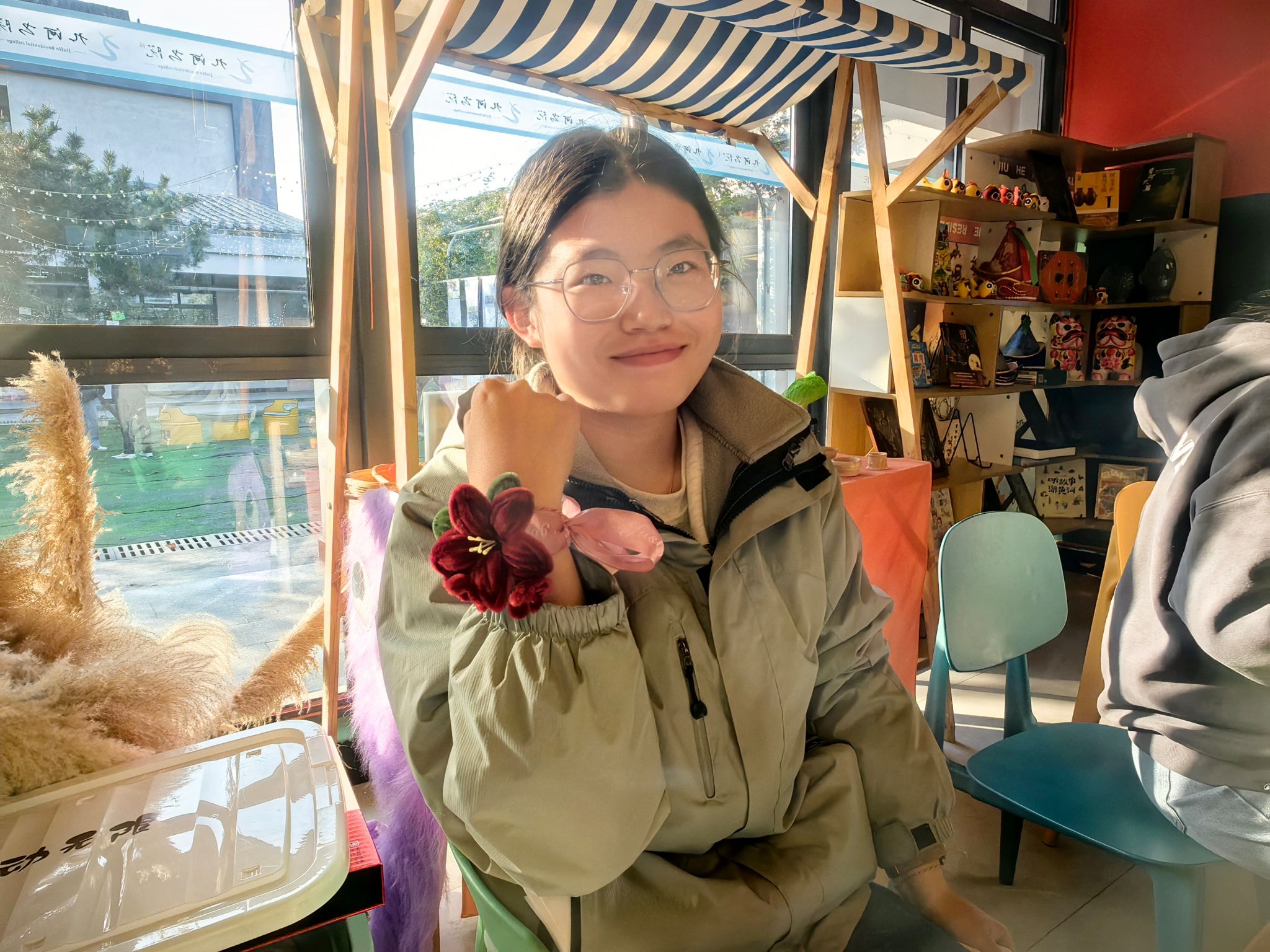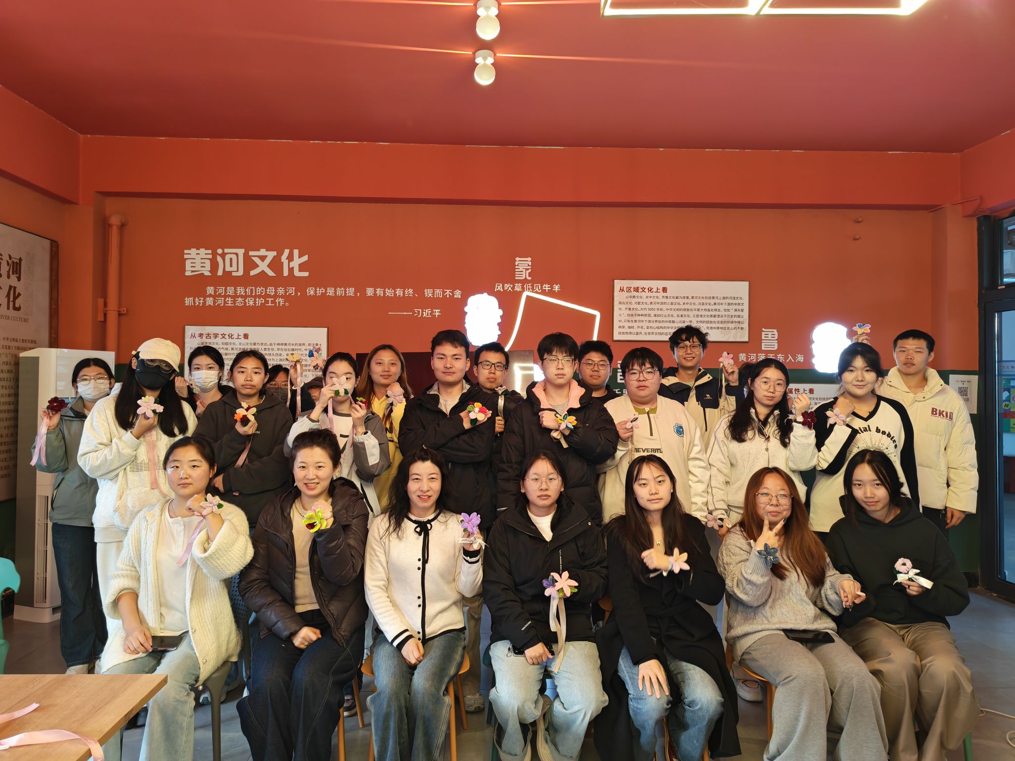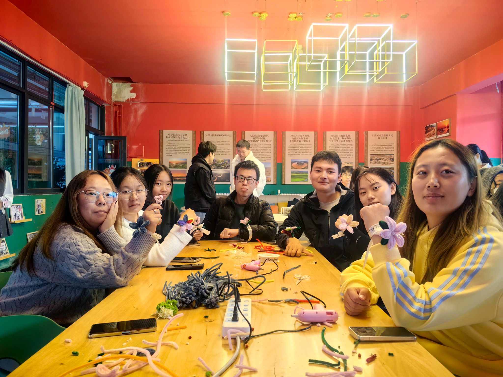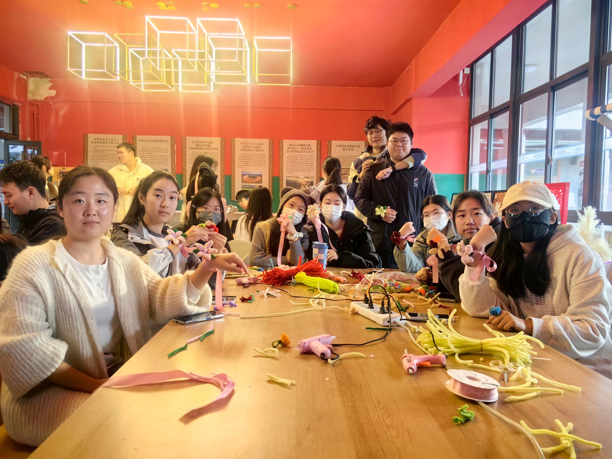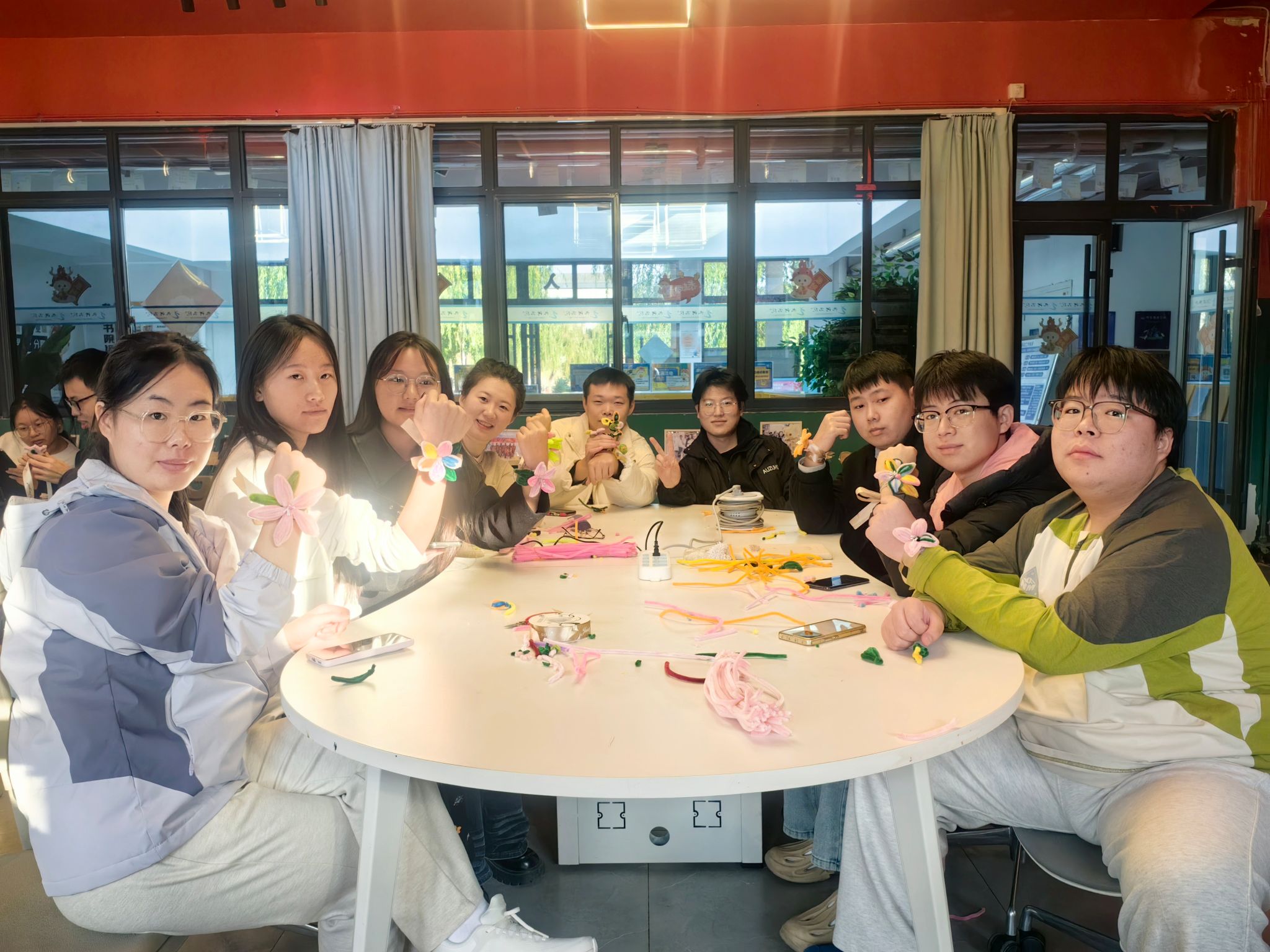 活动尾声,学子们把自己的手腕花摆在展示台上,原本素净的桌面瞬间成了“浪漫花园”。有人说:“这朵花戴在手上,好像连降温都没那么冷了”;有人将手腕花轻轻别在包上,笑称“要把这份暖一直带着”。