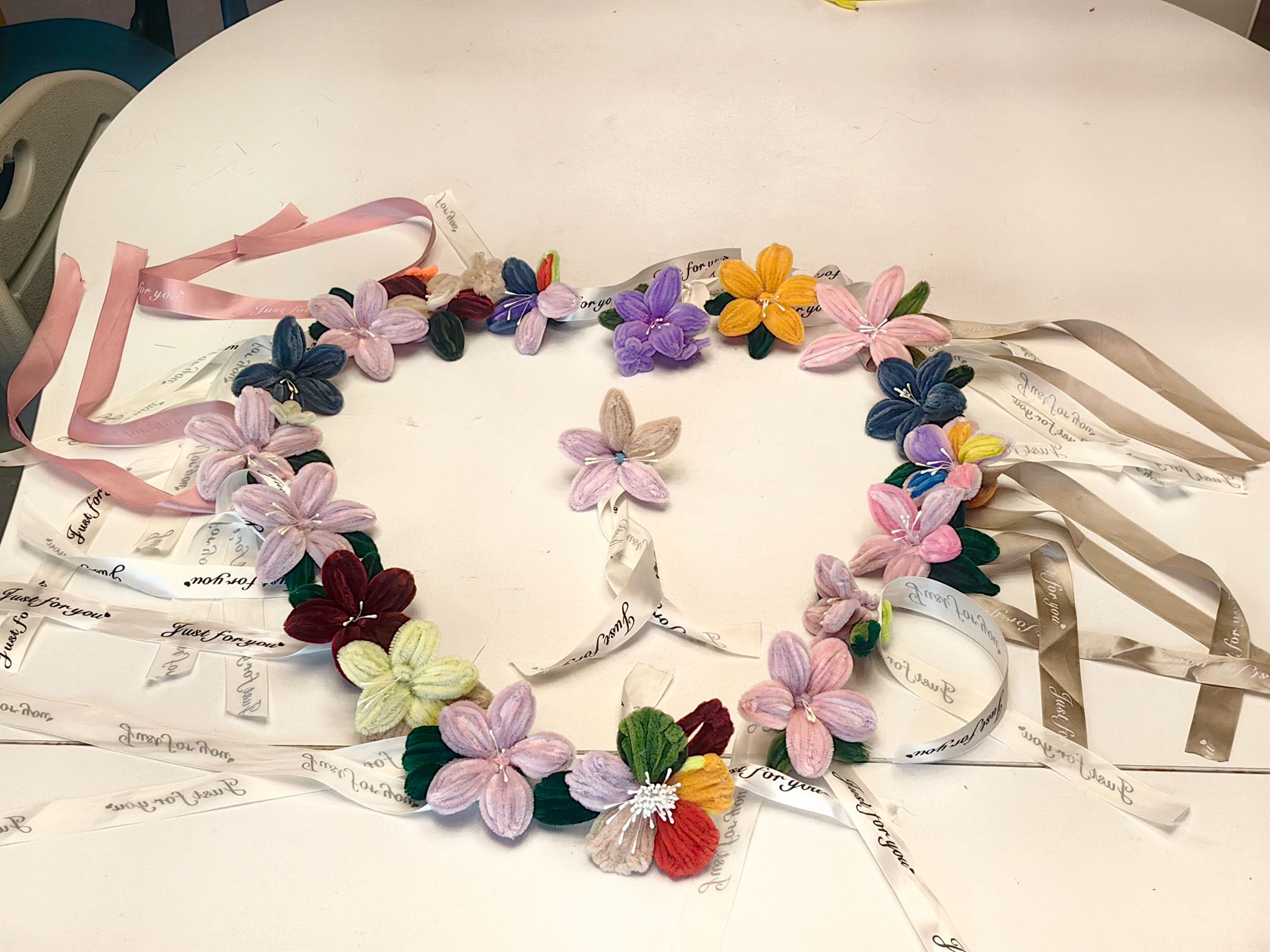 “一开始总怕扭坏,后来跟着老师调整花瓣的弯度,突然就有了感觉!”一位同学举着刚完成的手腕花笑着说,花瓣衬着浅绿的花茎,轻轻晃动手腕时,扭扭棒花瓣似在微风里轻颤。现场的讨论声与轻笑声交织,有人尝试用深绿色扭出枝叶纹理,有人把浅粉扭扭棒绕成渐变的花瓣,不同色彩与创意碰撞间,每一只手腕花都成了独一无二的“浪漫标本”。