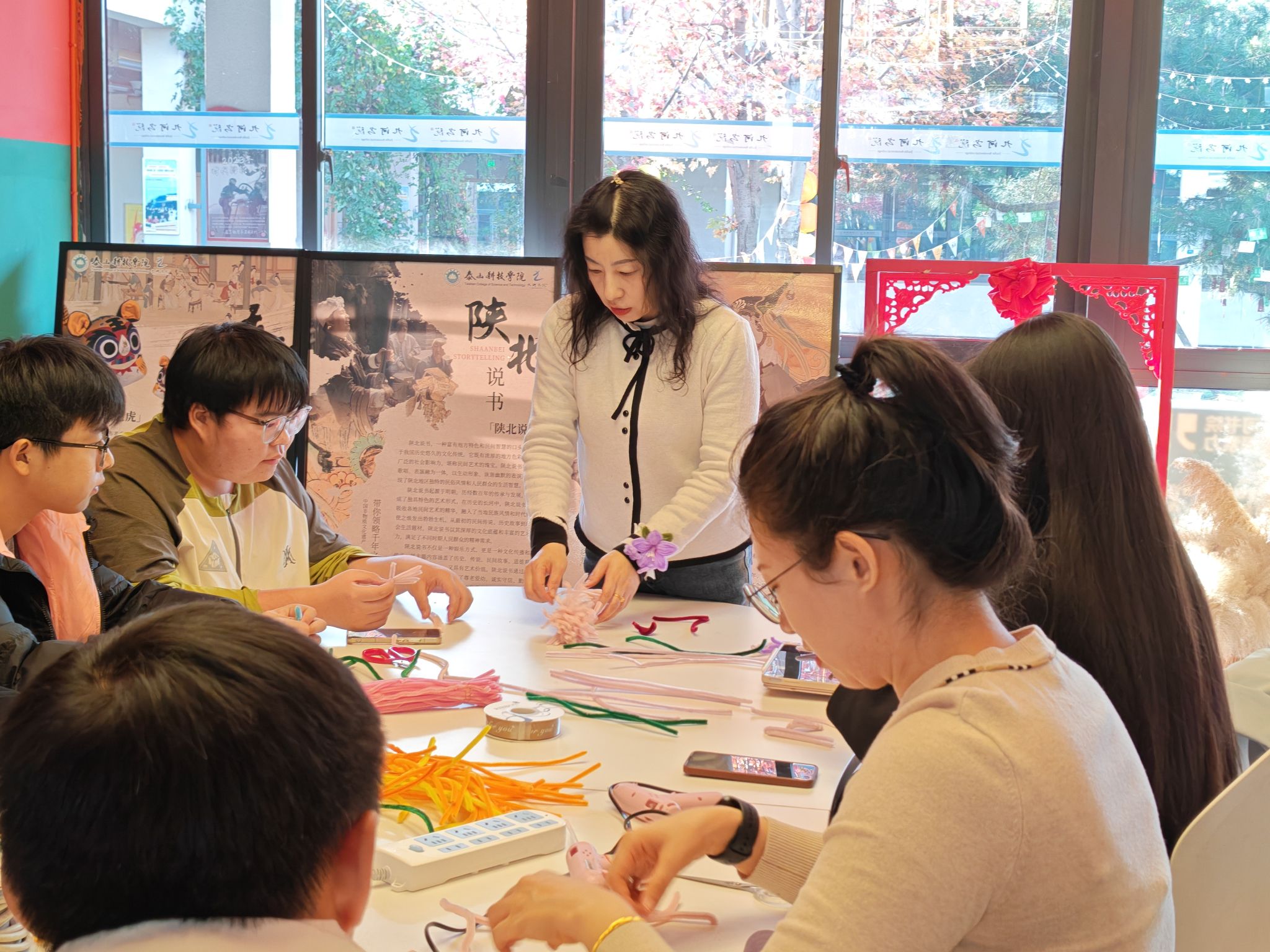在郝老师的精心指导下,学子们开启了创作之旅。鹅黄、浅粉、薄荷绿......这些充满生命力的色彩在指尖流转。通过捻、折、绕等精湛工艺,平凡的扭扭棒被赋予了新的生命,化作片片精致的花瓣与枝叶。活动现场宛若一个开放的艺术工作室,每根扭扭棒的舞动都在诉说着创造的喜悦。