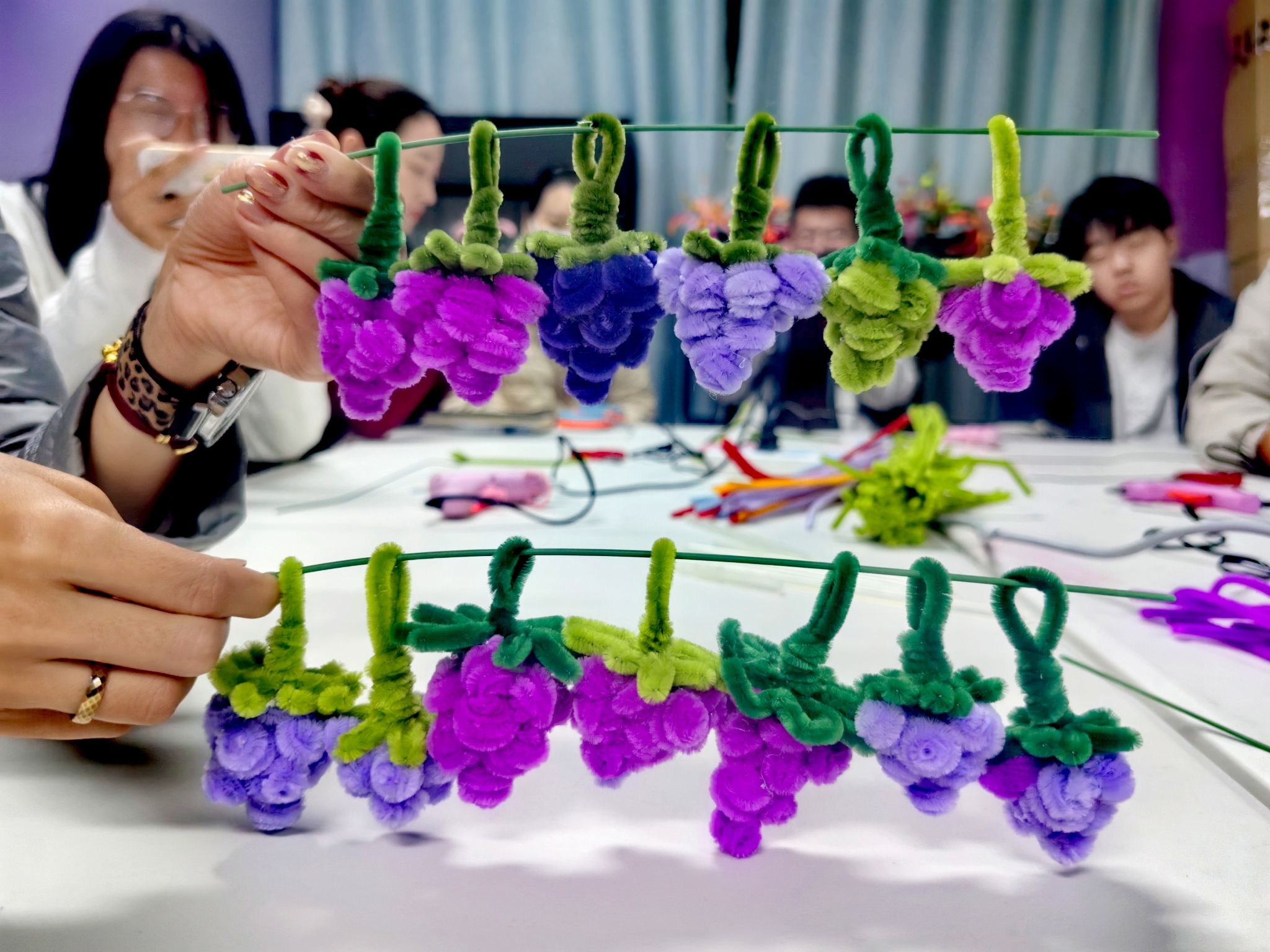 短短一个小时的活动,不仅让同学们体验到手作的乐趣与成就感,也进一步促进了不同学科背景师生之间的交流与融合。一位参与学生兴奋地表示:“没想到扭扭棒能做出这么可爱的葡萄挂件,过程很有趣,也让我更愿意动手尝试新事物了。”