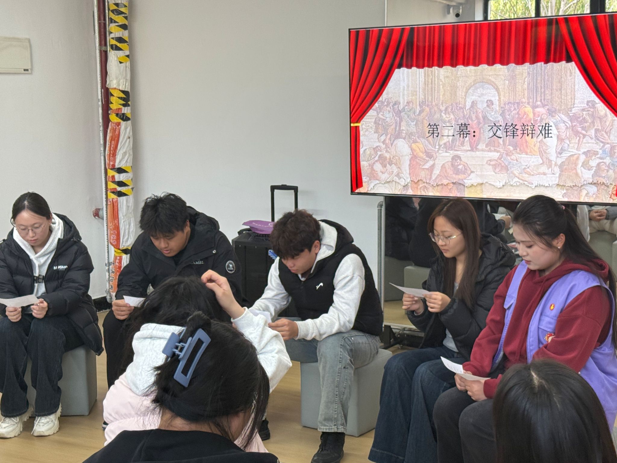 要更深刻的理解书籍里蕴含的哲学奥秘,一场沉浸式的情景演绎无非是最有效的方式。大家再次翻开书页,发现了夹在其中的“角色身份卡”和“台词”,参加者们跟着台词的指示自由分组,化身“苏格拉底”“格劳孔”等对话角色,围绕“正义是强者的利益还是全体的幸福”展开激烈辩论。“若只追求强者利益,城邦终将分崩离析!”来自九河书院/淬炼商学院的王云鹤同学化身“苏格拉底”,语气坚定地反驳;而扮演“色拉叙马霍斯”的东岳书院/大数据学院的姚慧泉同学则不甘示弱:“现实中,掌权者制定的规则便是正义!”双方引经据典、妙语连珠,台下掌声与喝彩声此起彼伏,抽象的哲学命题在生动演绎中变得鲜活可感,现场仿佛化作两千多年前的雅典学园。