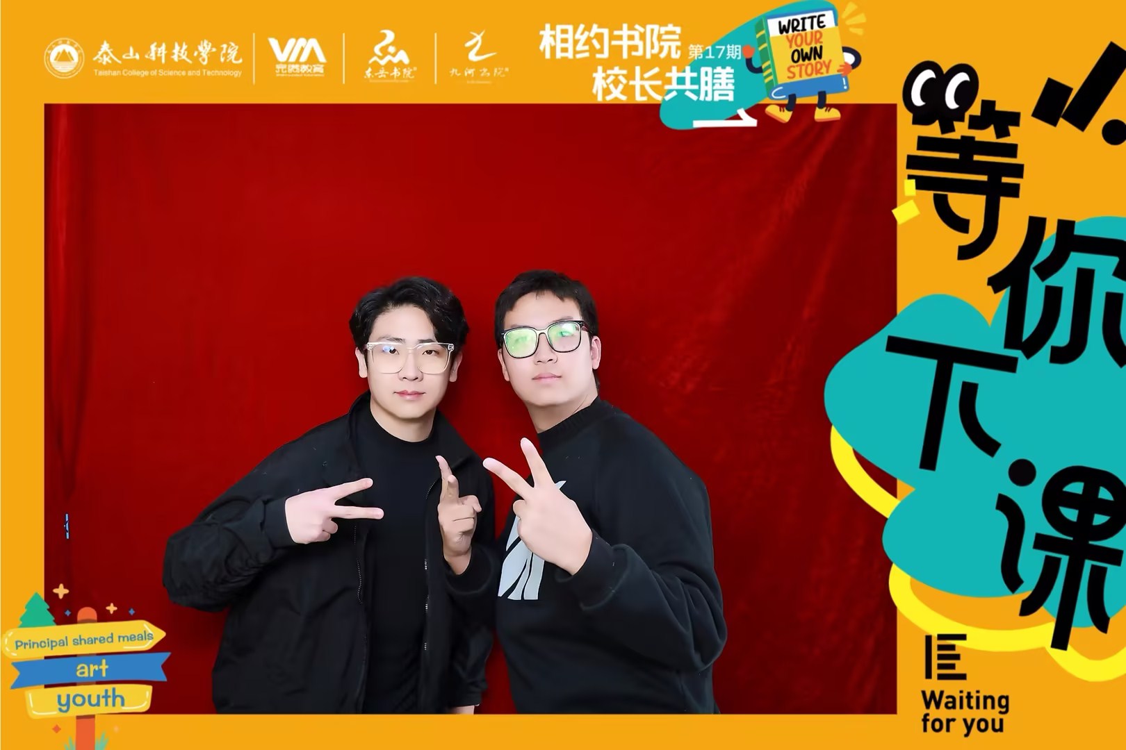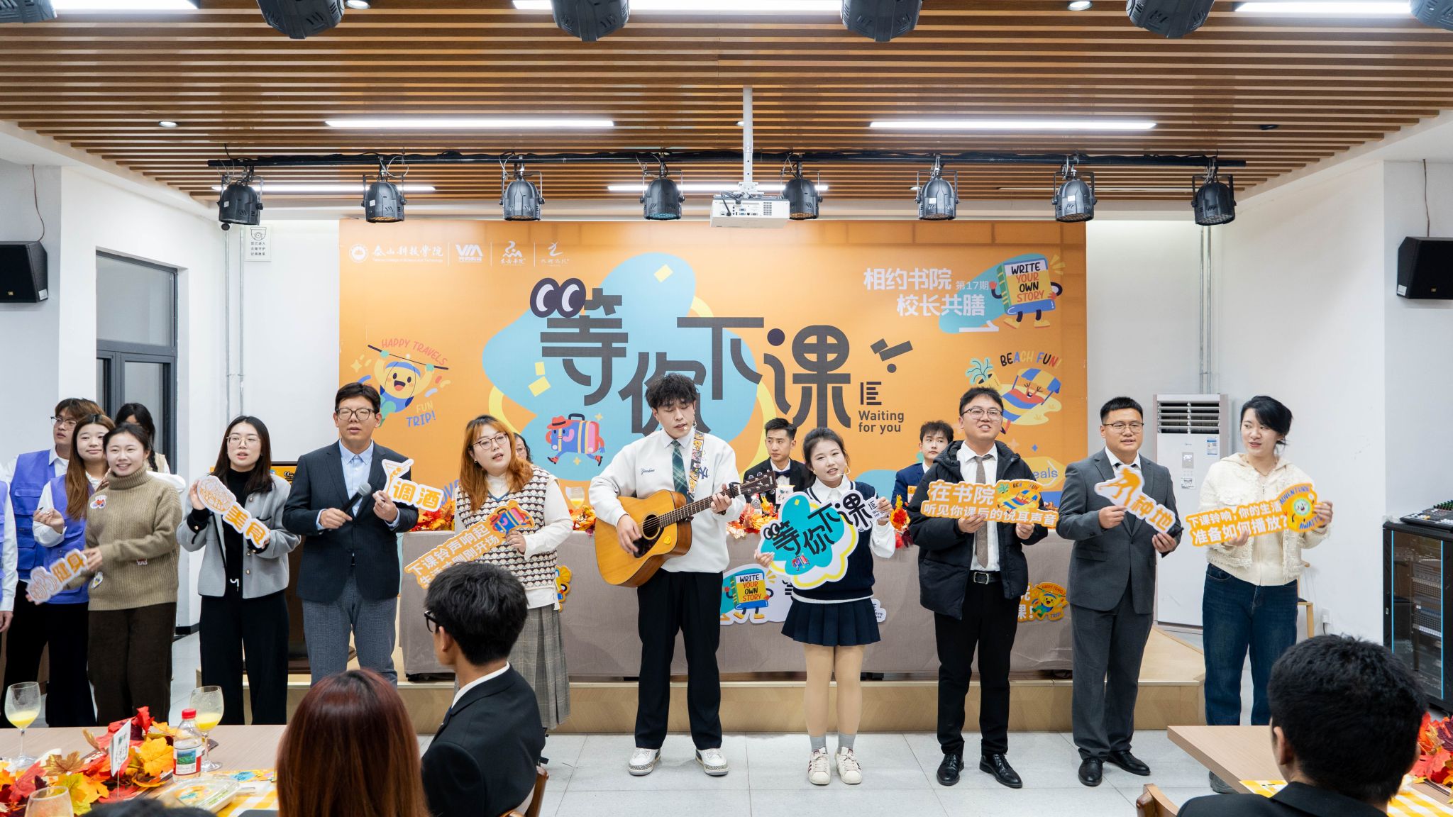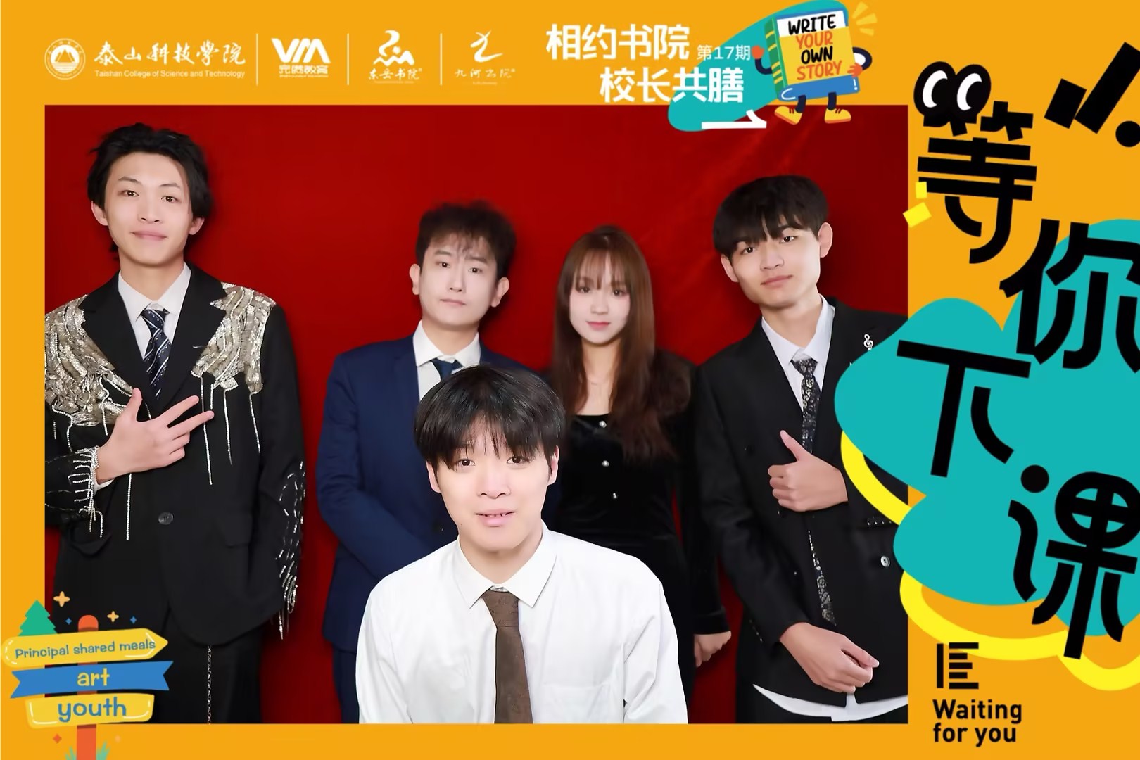 当《等你下课协奏曲》的旋律还在耳畔轻轻萦绕,现场的氛围也随之变得格外温柔。此时,五汶书院/艺术传媒学院的韩晨曦与育英书院/智能工程学院的庄家琛携手走上台前,为大家带来一场改编版的“等你下课”歌曲。清澈的歌声伴着乐器声响起,瞬间将在场师生拉入泰科校园独有的课后场景:田埂间的耕种期待、研学路上的遗憾错过、工坊里的用心尝试、大咖阅读的感受都藏在细腻的歌词里,这熟悉的旋律因他们的创意改编而焕发出新的活力,将课堂外的青春故事与音乐巧妙融合,带我们在音符中跳跃。伴随着《“过去”“现在”“未来”共膳三部曲》的视频,师生们共同回顾了校长共膳往期的内容,见证了学生主创们的成长经历。