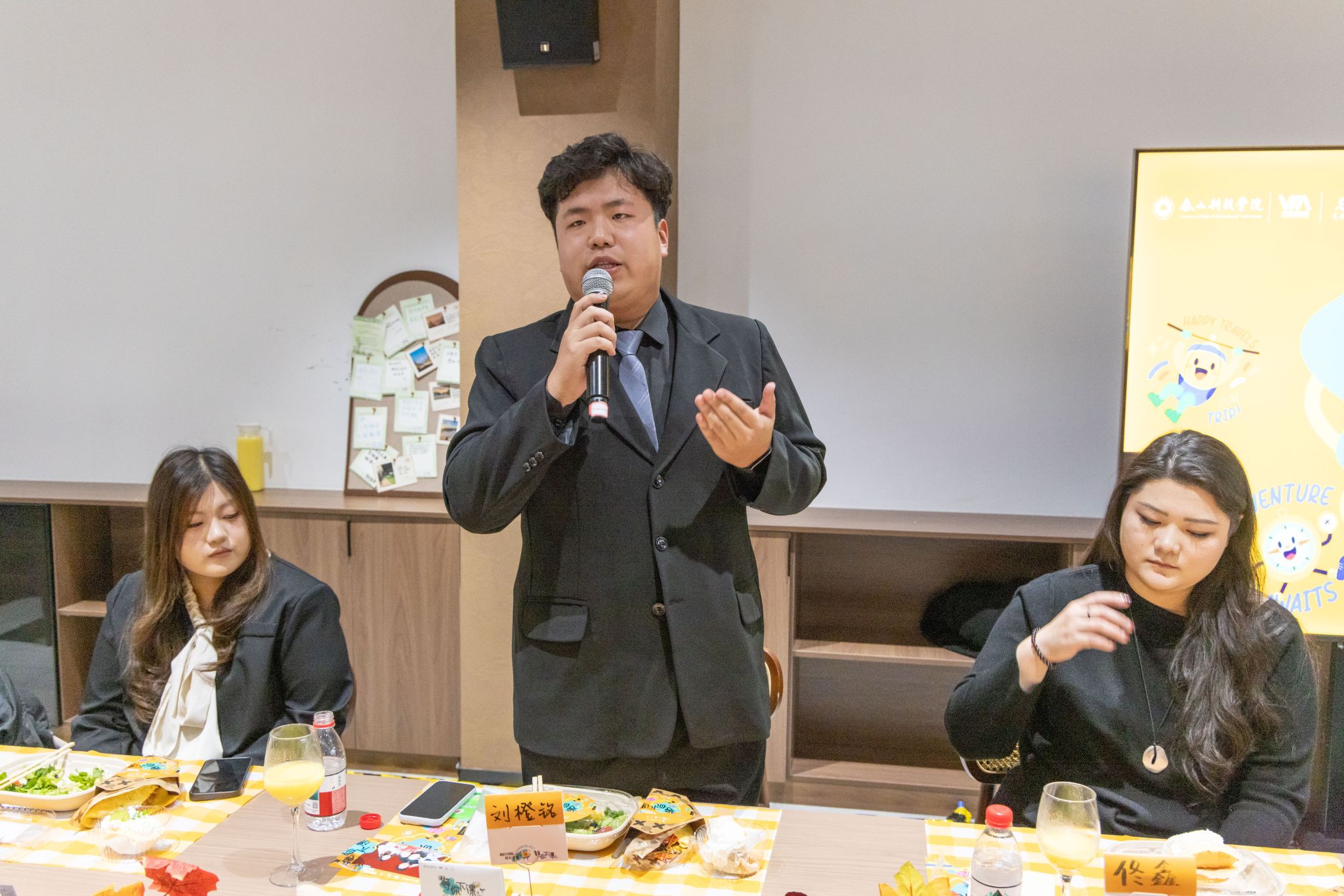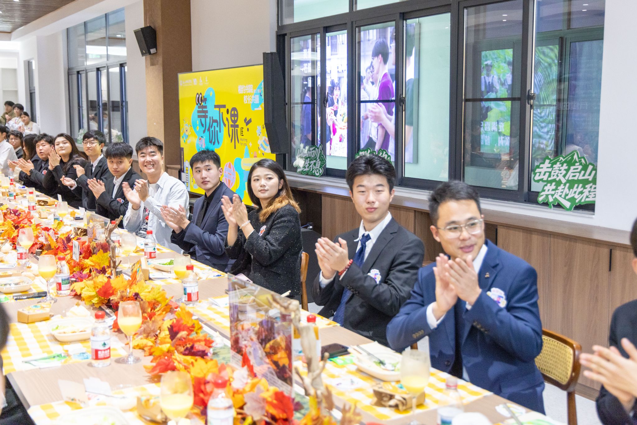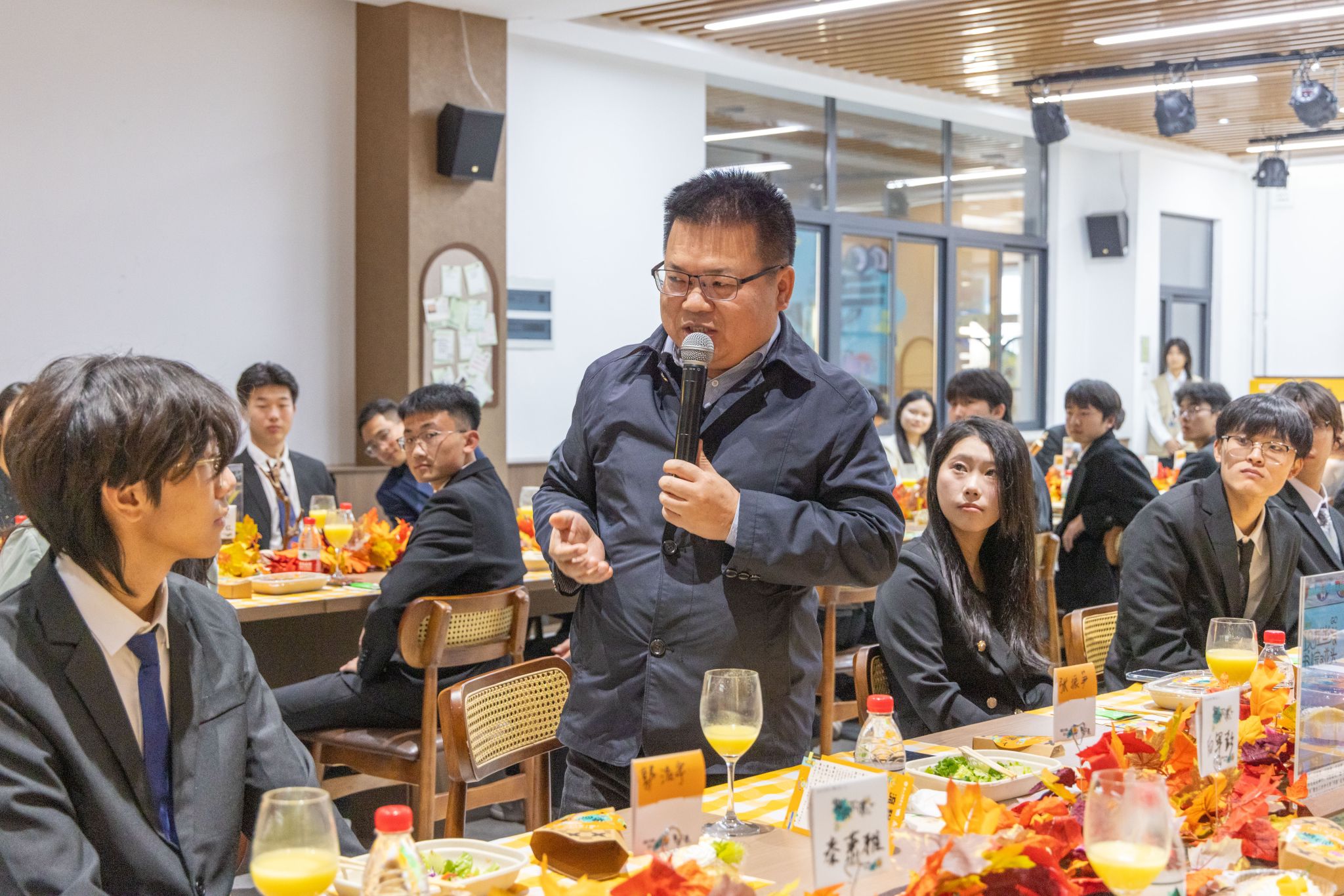 随着主题视频播放完毕,一段熟悉的声响悄然回荡在现场。武浩然为午宴致辞。他分享到,“关于下课,在小学时,是小霸王式的童真调侃;中学时,是与发小之间的专属约定;大学阶段,或许是青春里的甜蜜邀约。而今天,它是我们师生围坐、畅聊心声的轻松共膳时光。”随后,他以“在泰科,下课铃声不是终点,而是起点”为主线,与同学们交流了小泰下课后丰富的“成长课堂”。他鼓励同学们真实、尽兴、自由,分享大学的下课铃声从不是学习的终点,而是大家自由、探索、自洽、成长的全新起点,与师生约定,当下课铃声响起,我们不见不散。