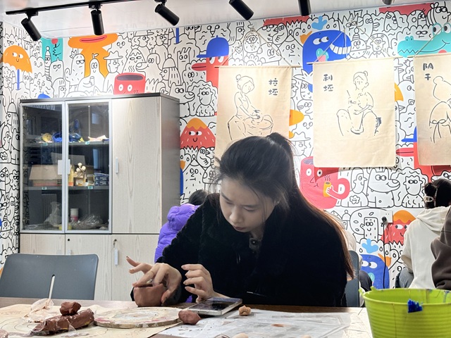 指尖轻触陶土的刹那,所有拘谨都被那份温润悄悄化解。大数据学院邵雪同学初学手捏,杯壁总免不了歪斜,淬炼商学院李宏超同学轻声支招:“手指匀力按压,跟着泥的质感慢慢塑形就好。”邵同学放慢节奏,指尖一点点揉捏、修整,看着掌心泥团渐渐蜕变成卡通小玩偶,眼里满是藏不住的成就感。活动室里,有人专注手捏动物摆件,指尖翻飞间,普通泥团便有了鲜活生机;有人摸索手制杯碗器具,在一次次按压调整中慢慢找到手感。手捏的温度让陶土更显包容,每件作品都独具个性,即便带着几分不规整,也满是随性的活力。